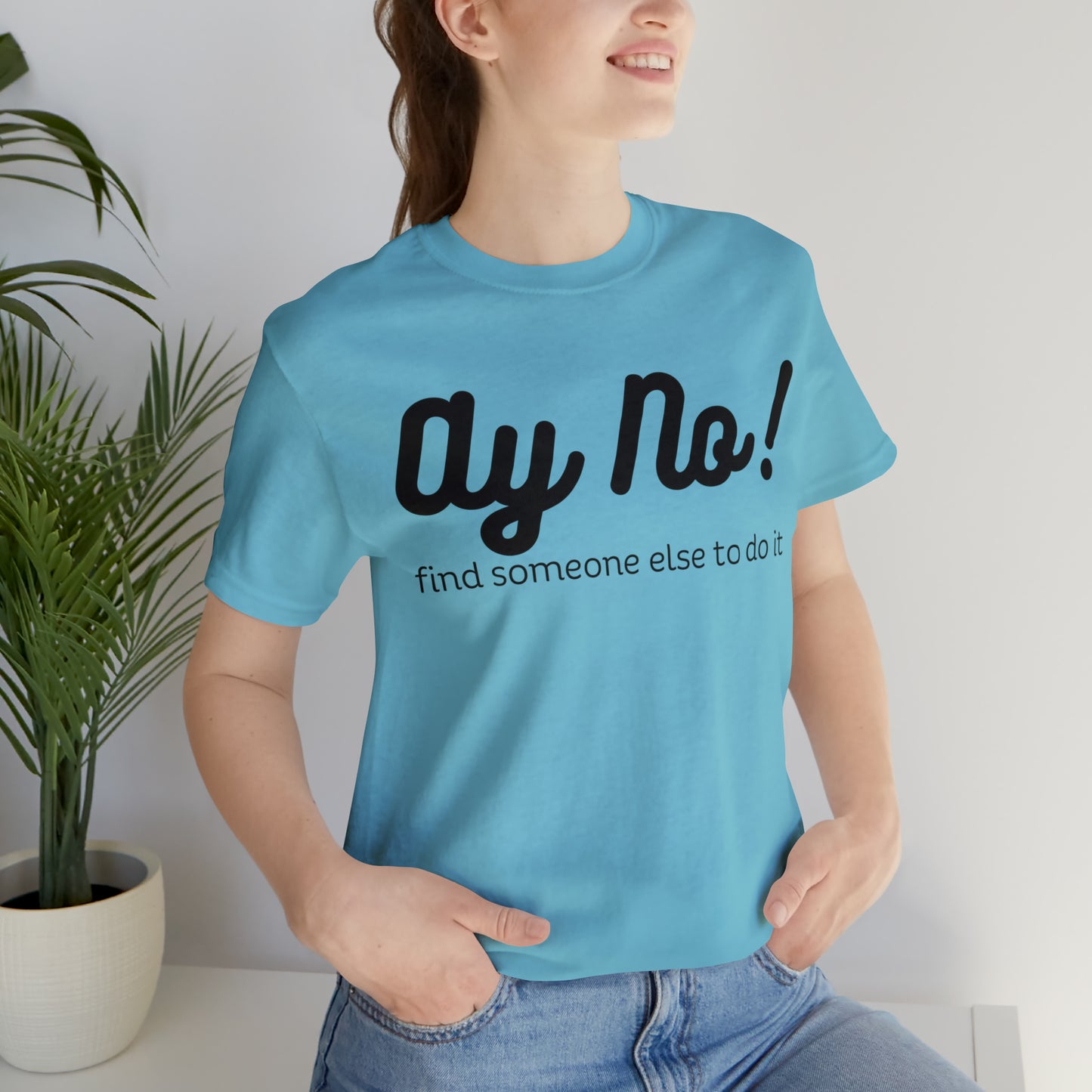 The "Ay No, Find Someone Else To Do It" shirt is a playful and humorous fashion piece that captures a lighthearted attitude and a touch of witty charm. This unique shirt design is inspired by the popular Spanish phrase "Ay No," which loosely translates to "Oh no" or "Uh-oh," and humorously suggests finding someone else to take on a task or responsibility.
