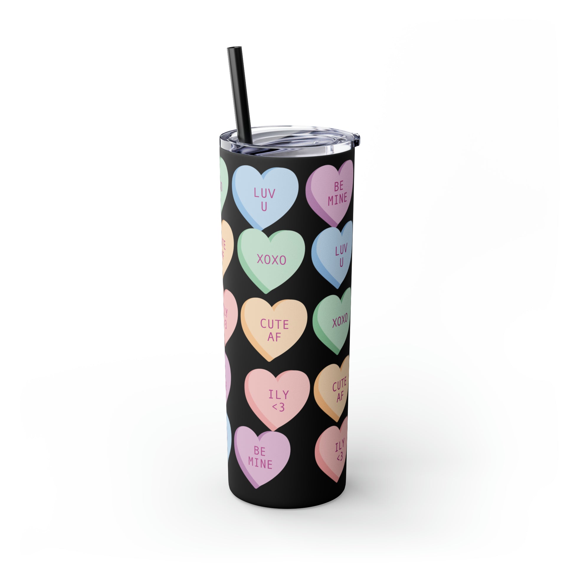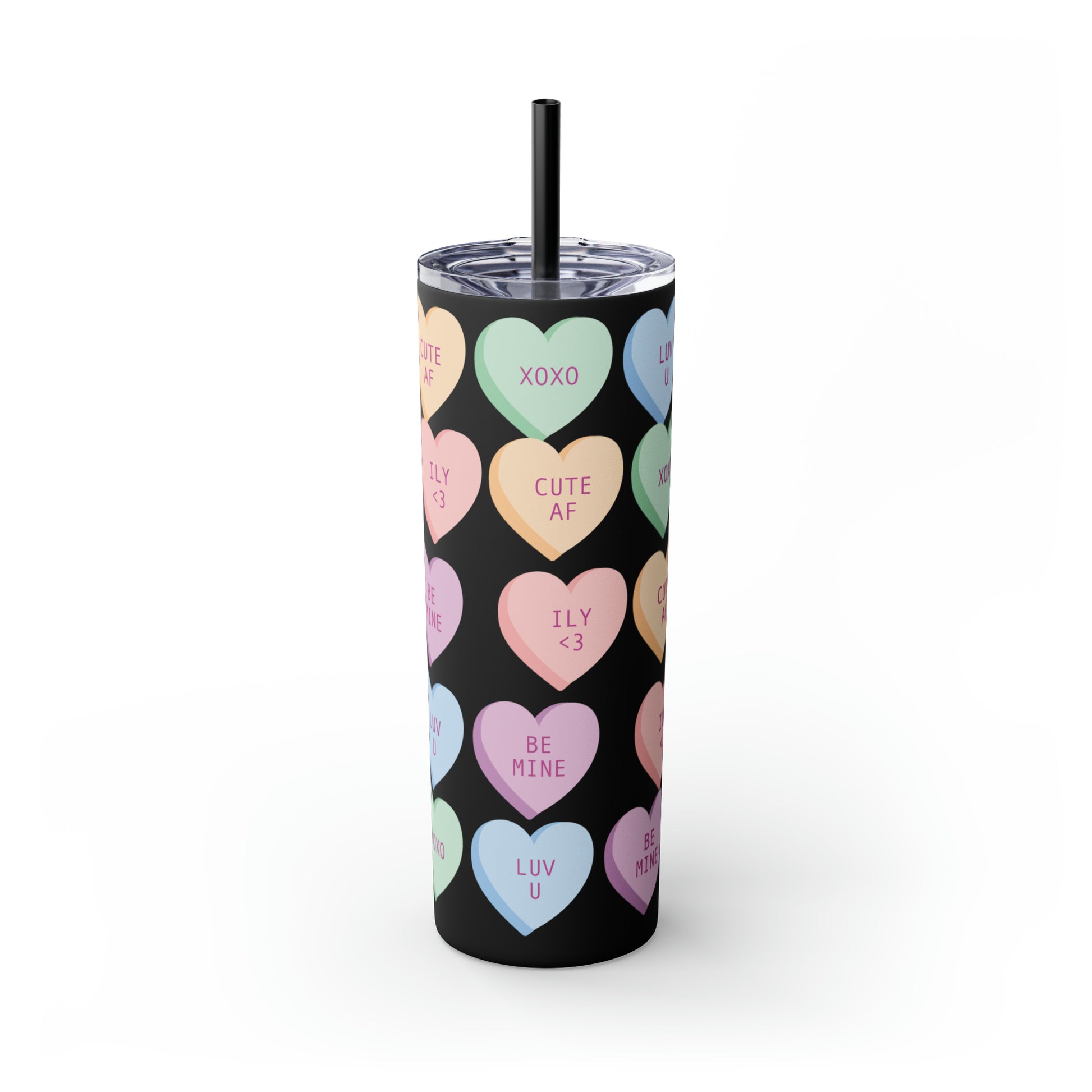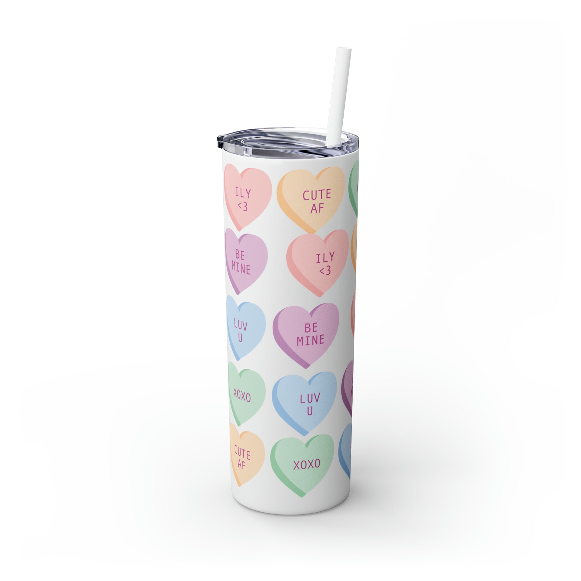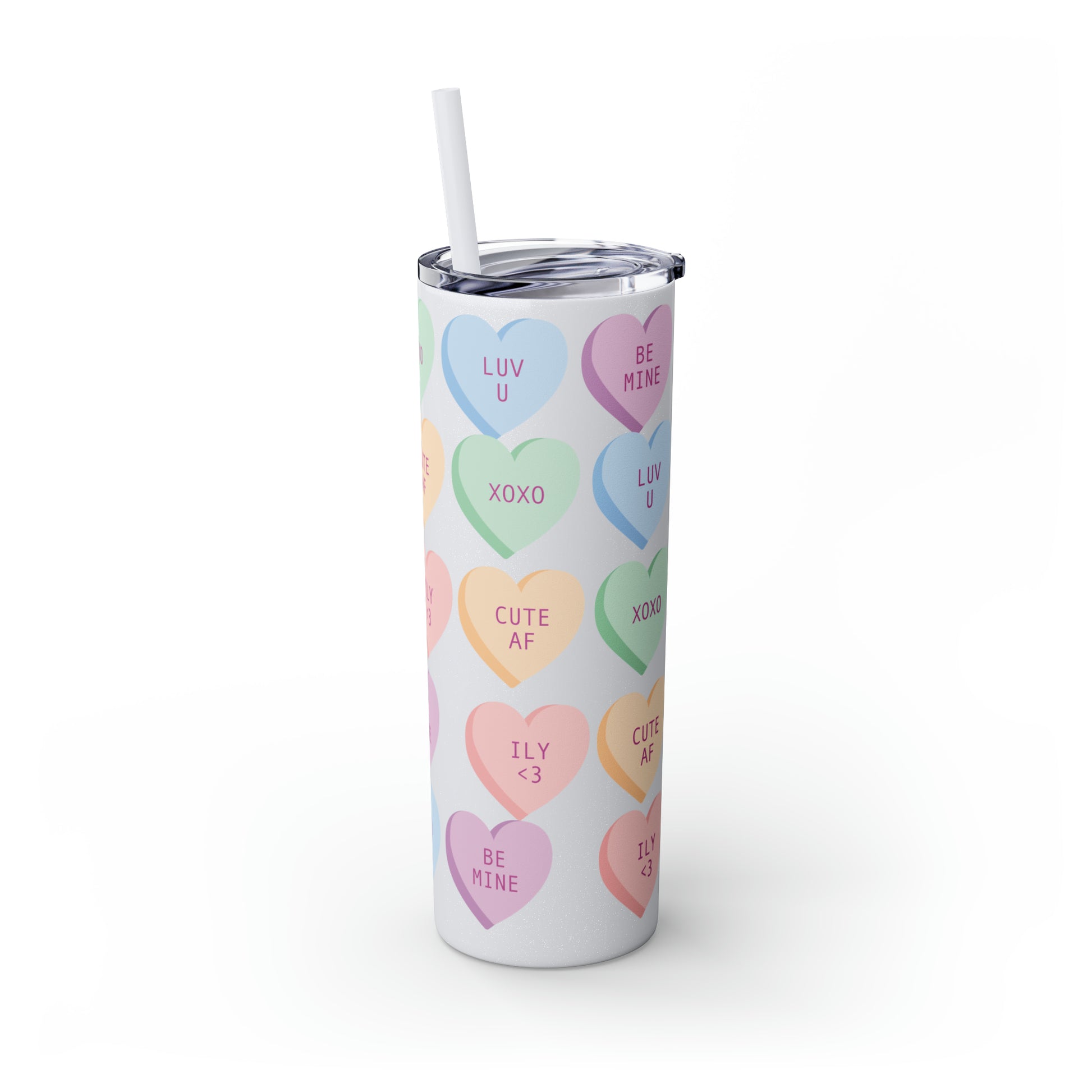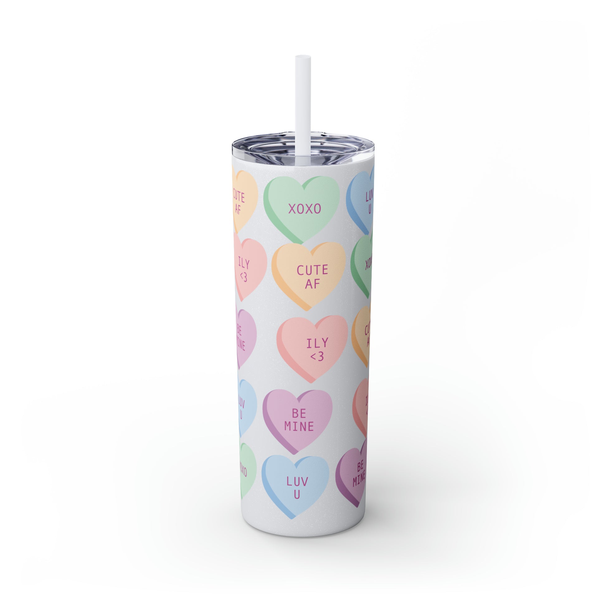 Charming Heart Design: Adorned with the classic conversation heart candies and their cute phrases, this tumbler brings a touch of nostalgia and romance to your daily routine.