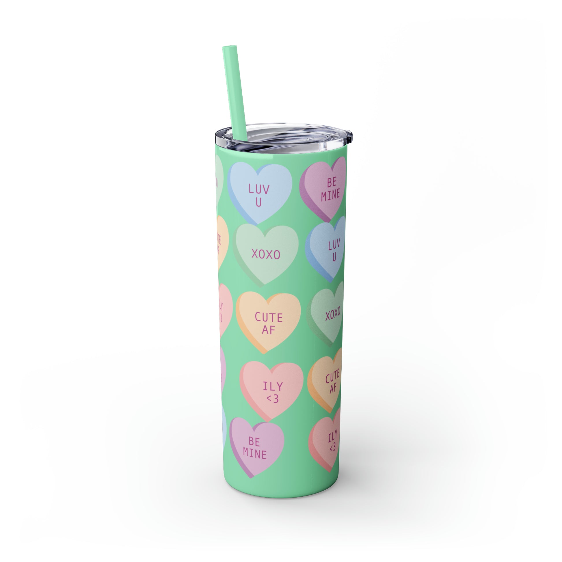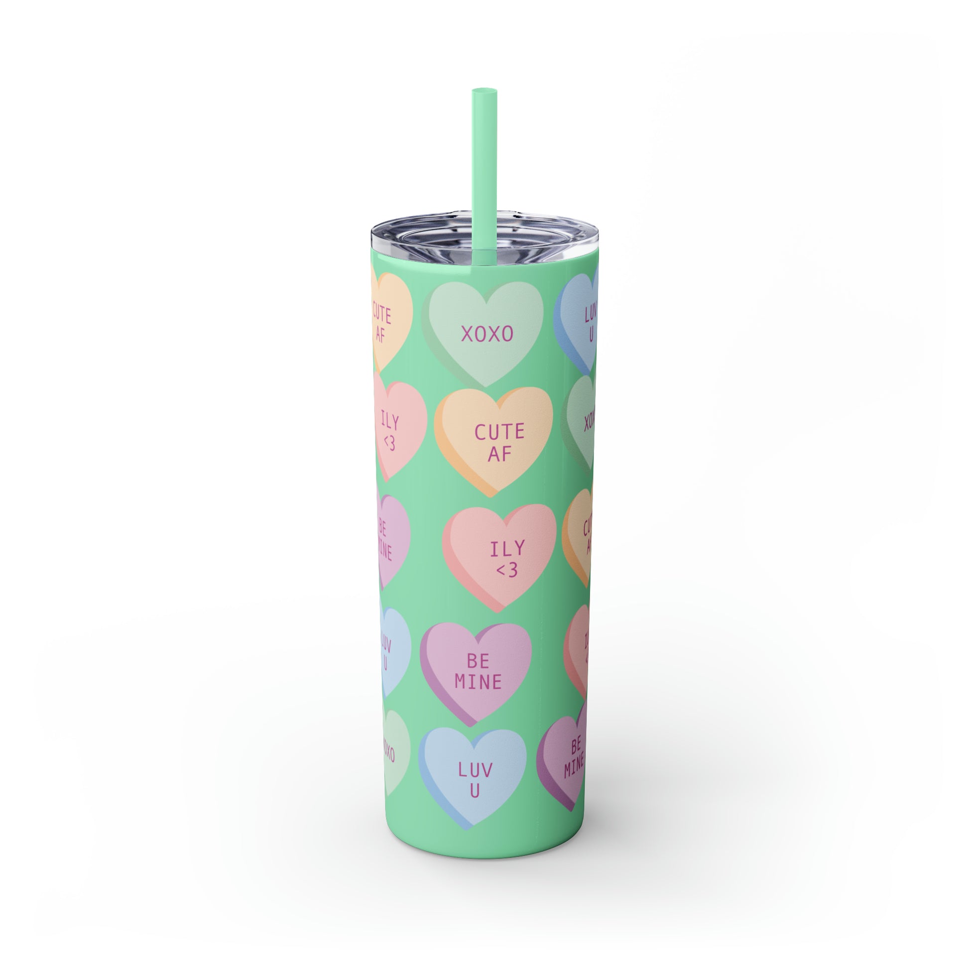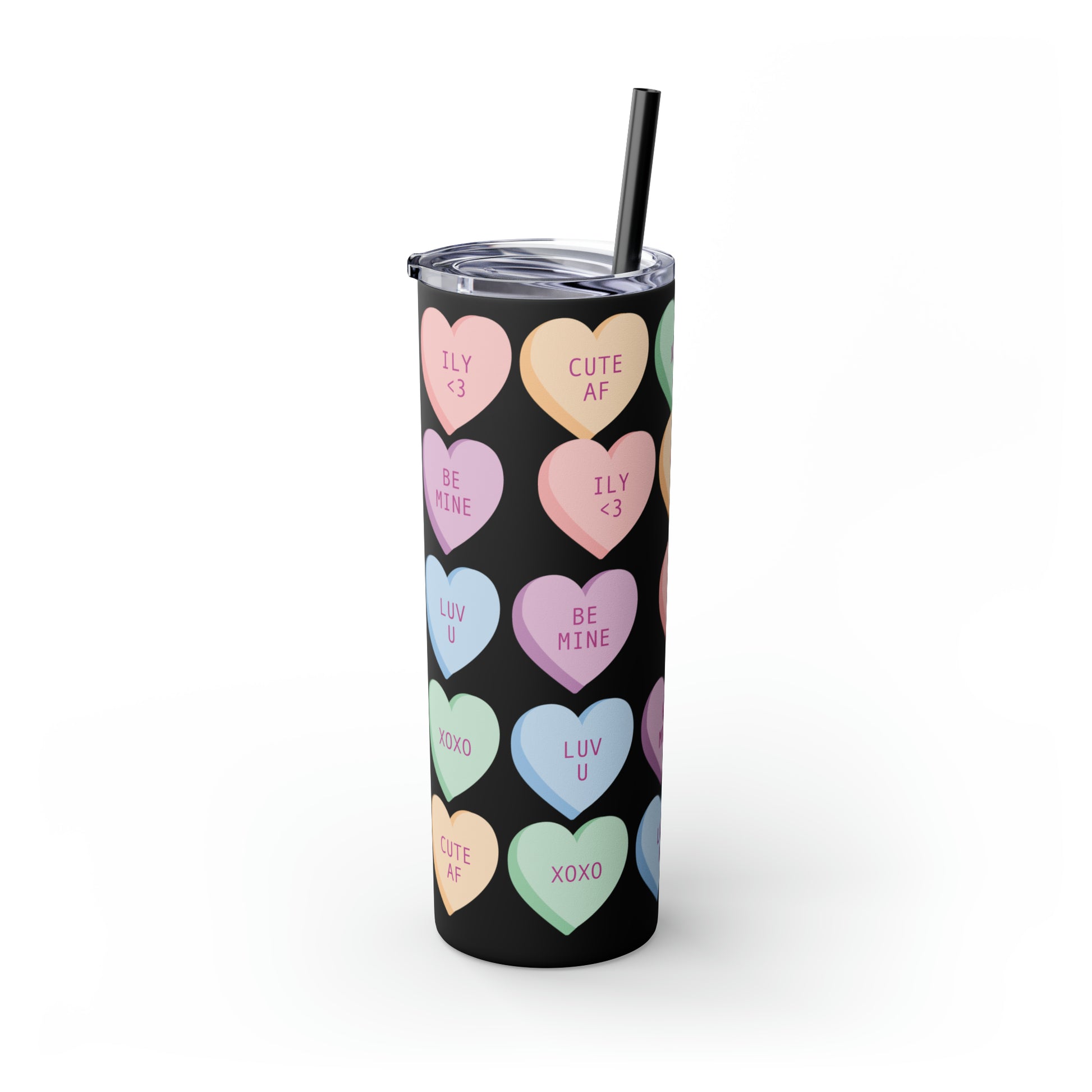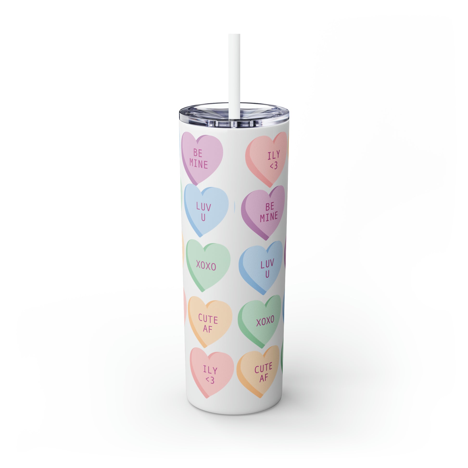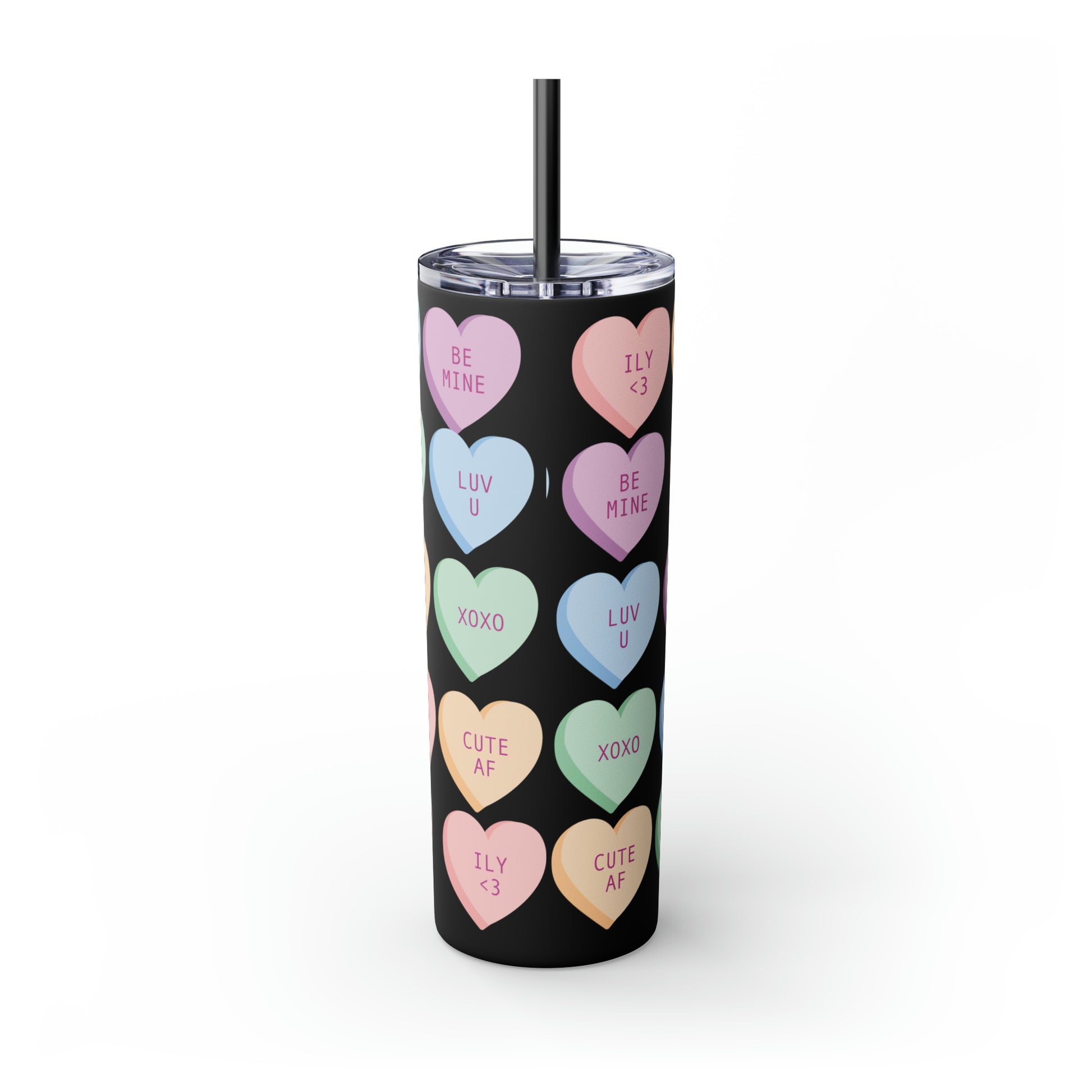 Charming Heart Design: Adorned with the classic conversation heart candies and their cute phrases, this tumbler brings a touch of nostalgia and romance to your daily routine.