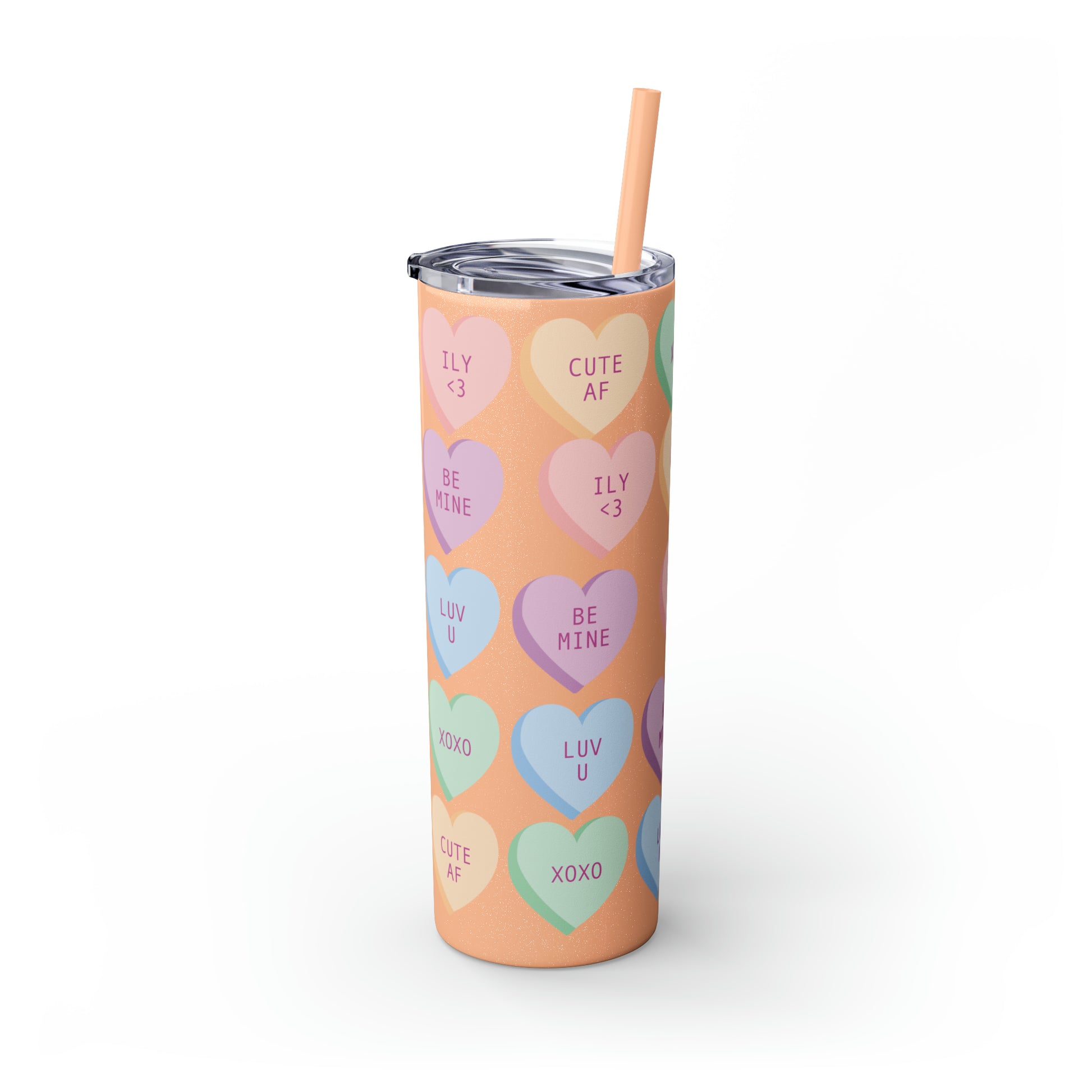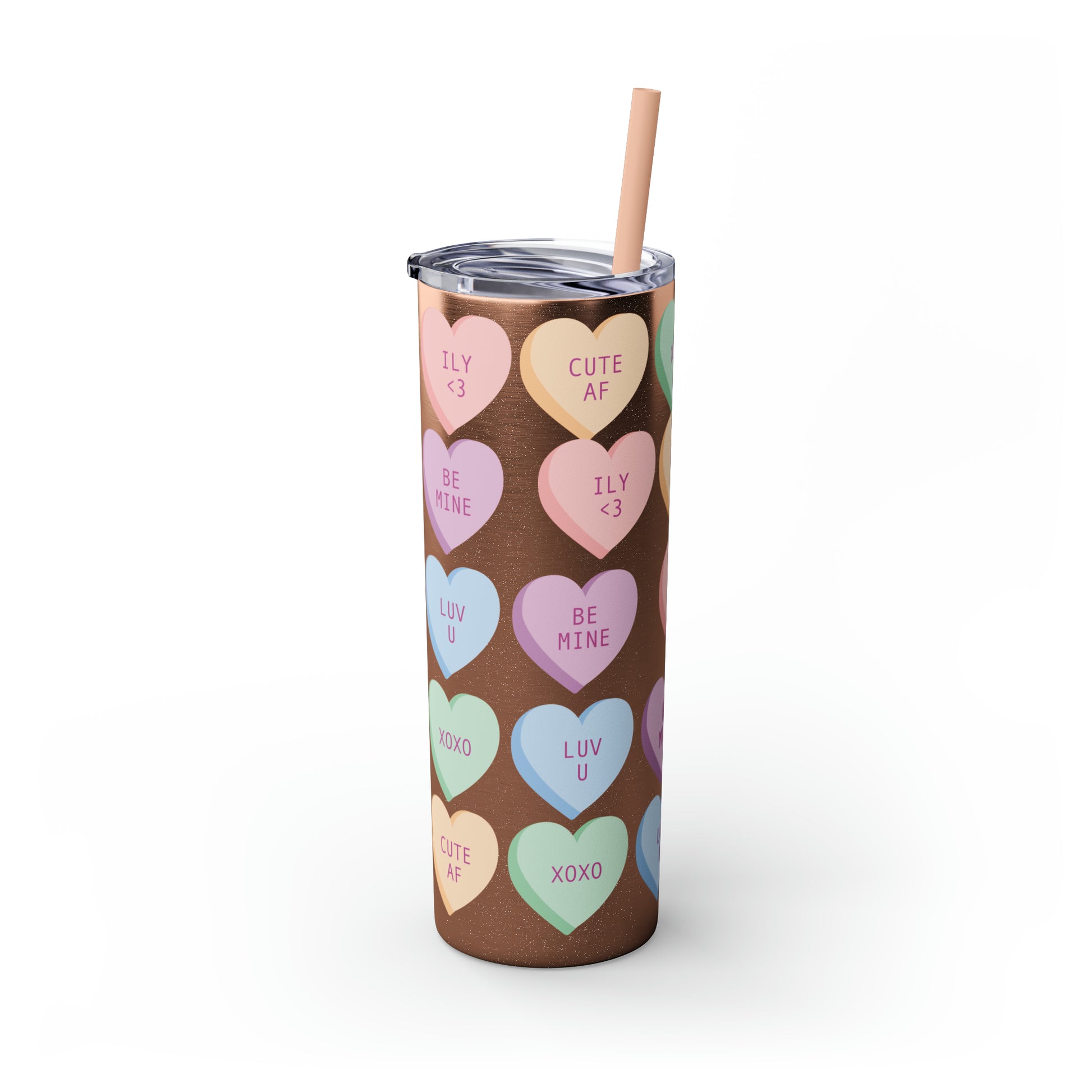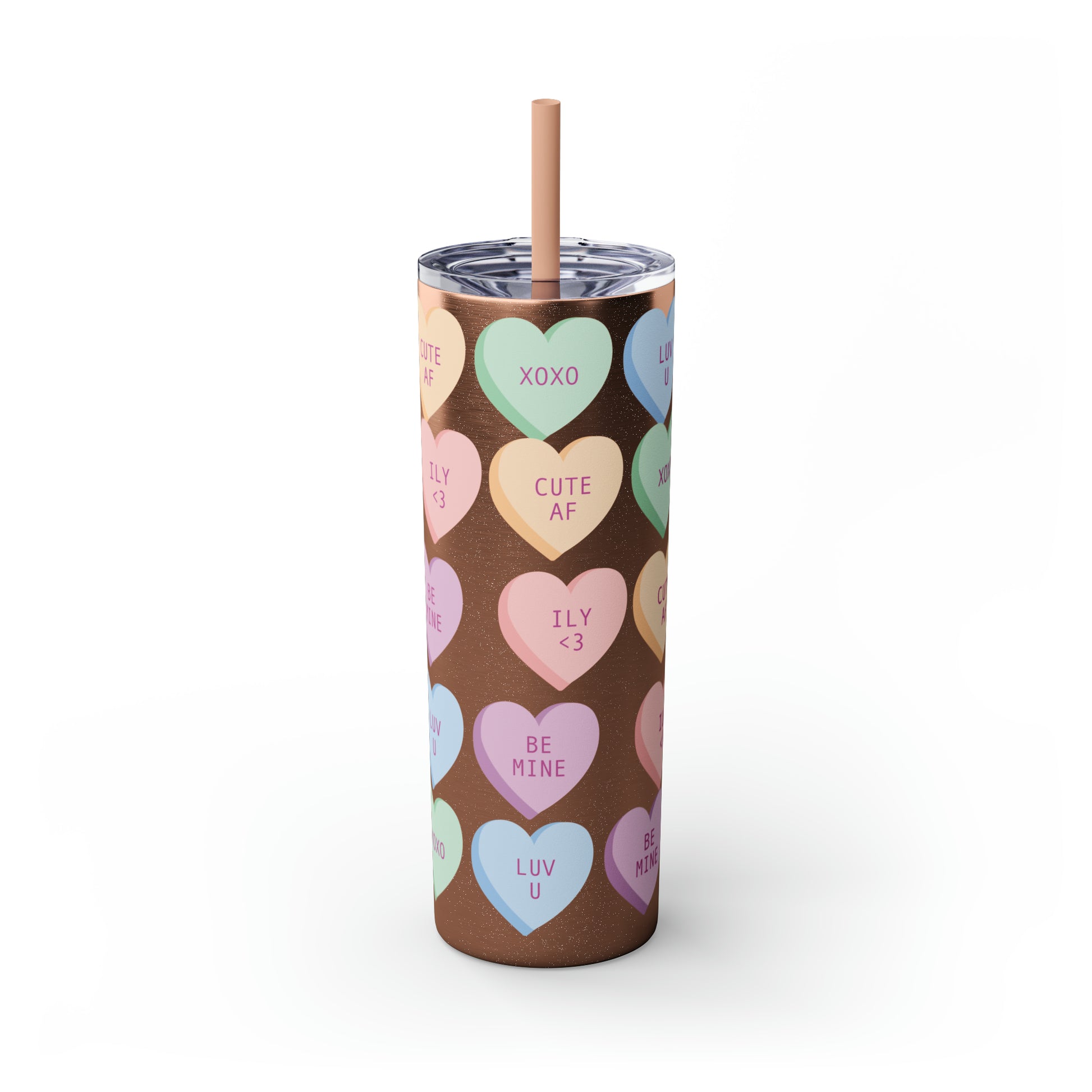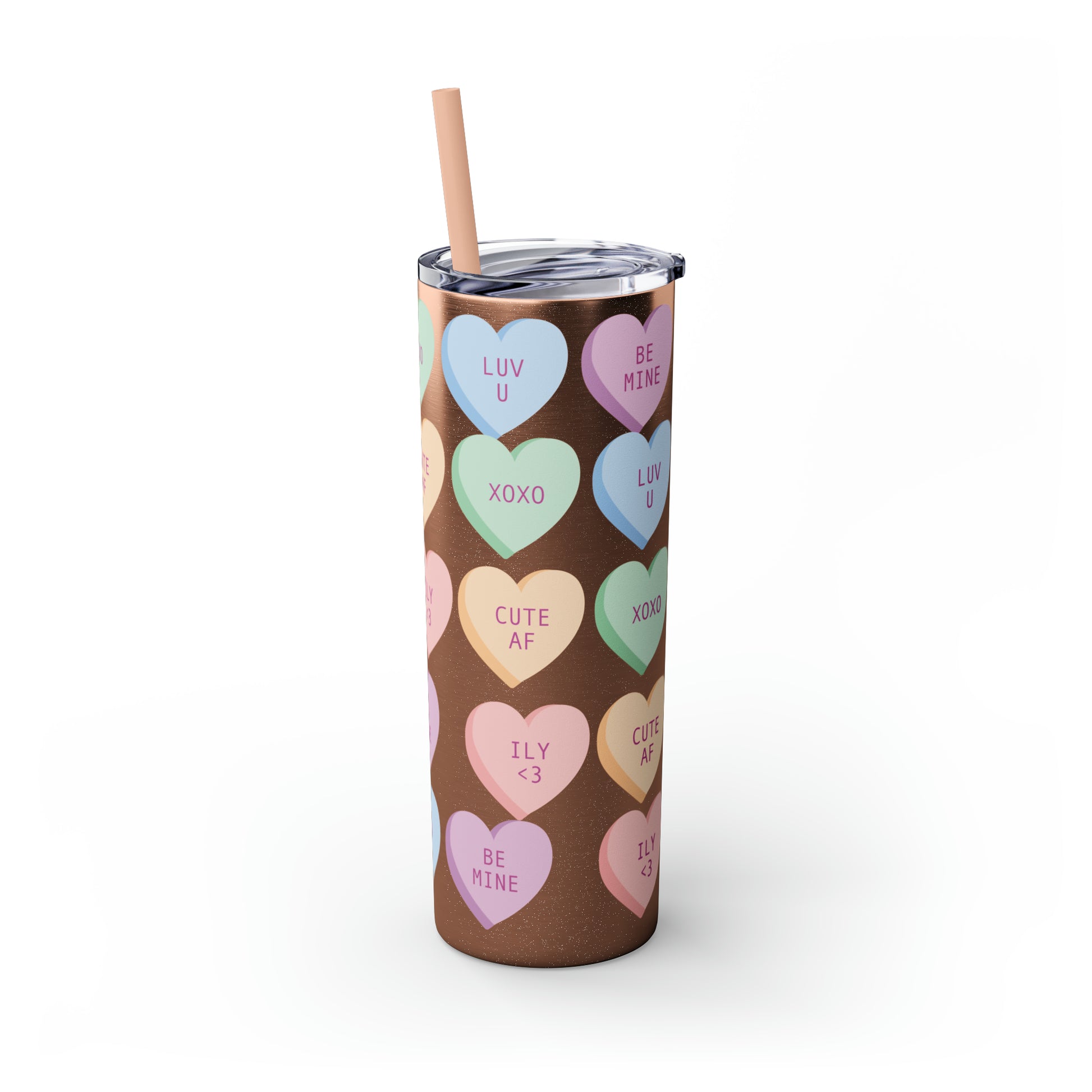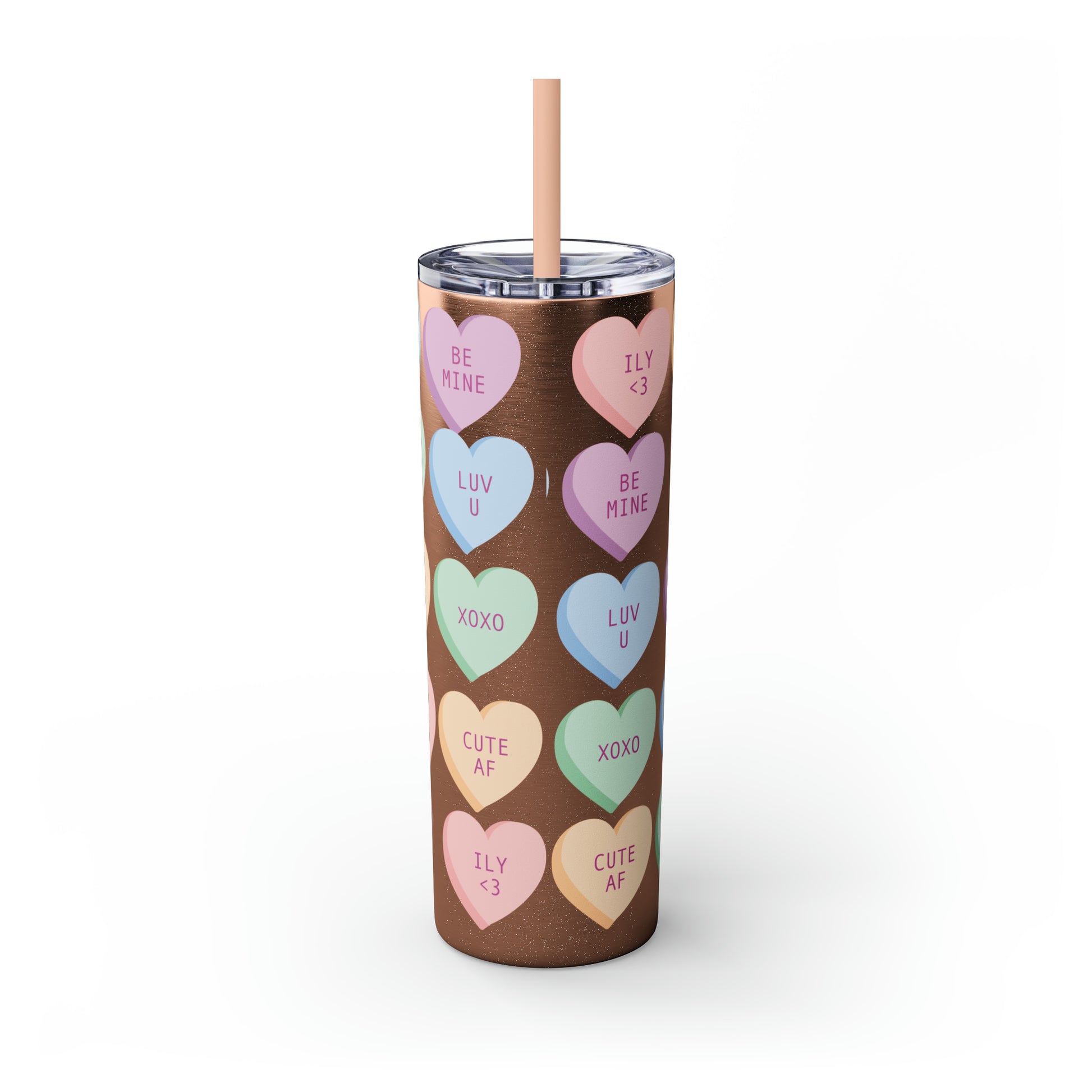 Charming Heart Design: Adorned with the classic conversation heart candies and their cute phrases, this tumbler brings a touch of nostalgia and romance to your daily routine.