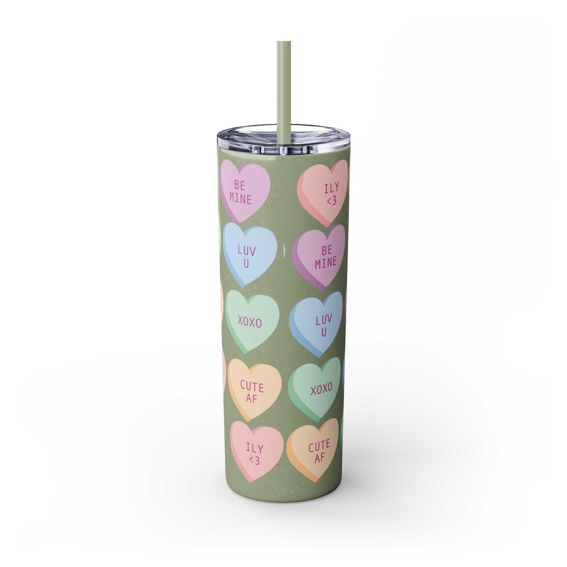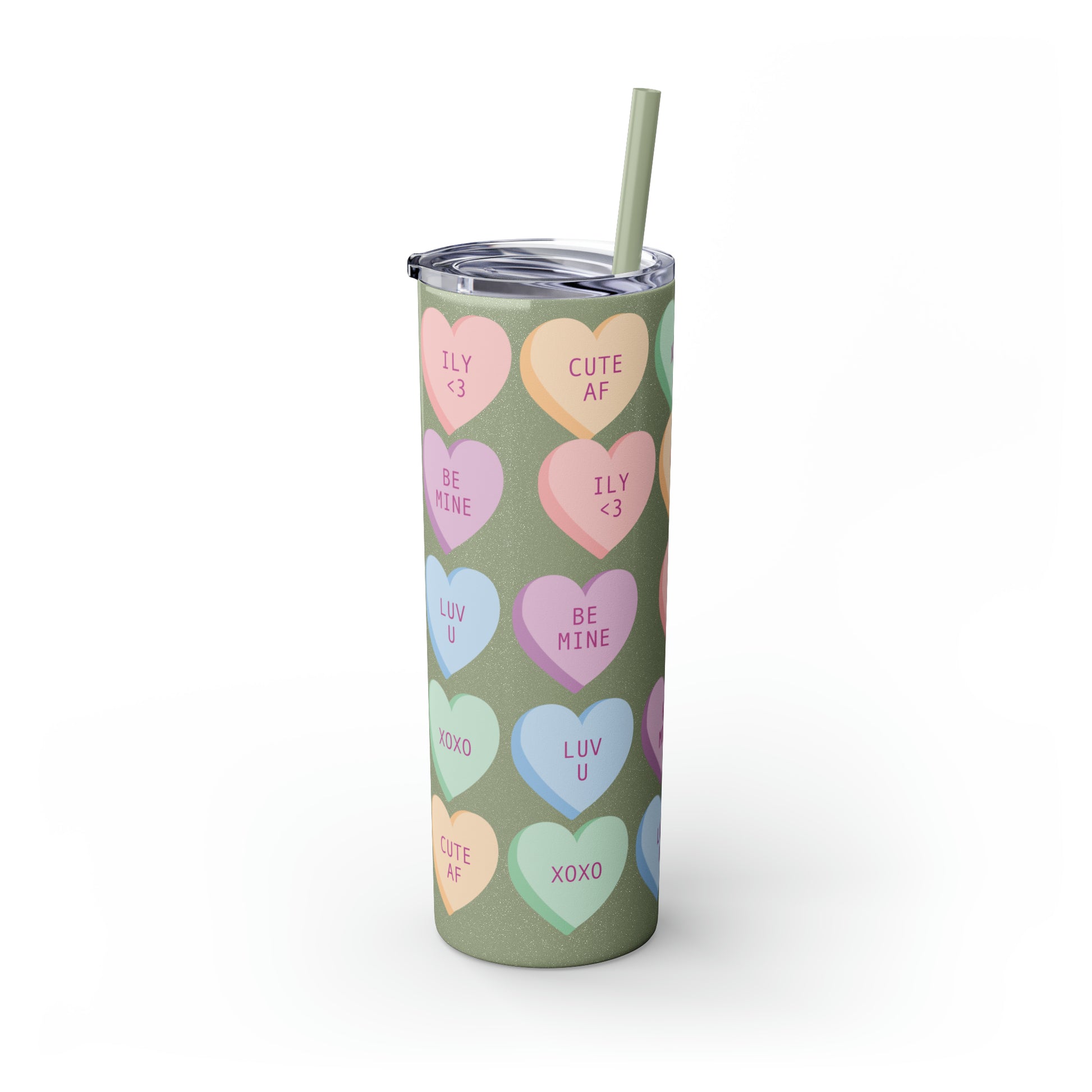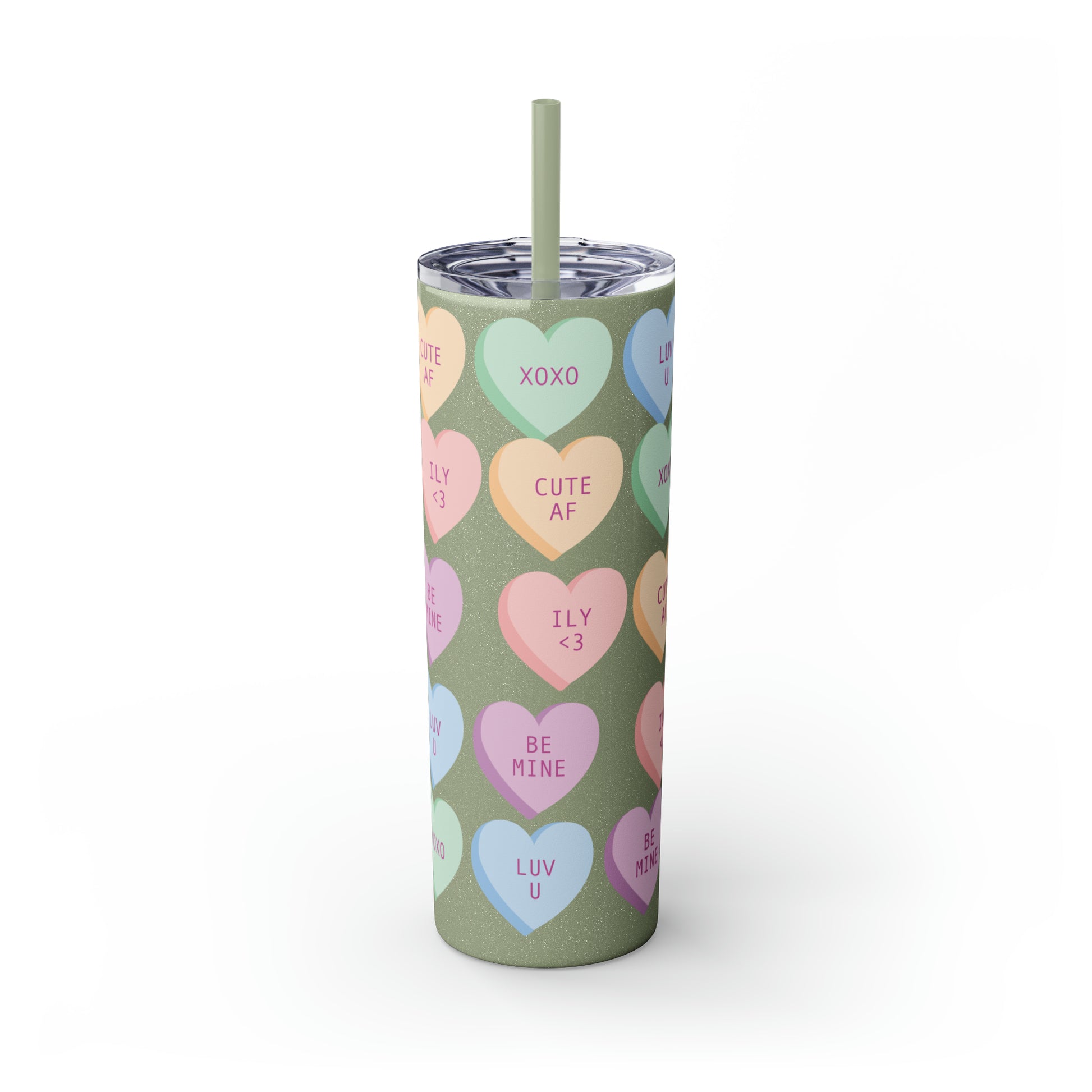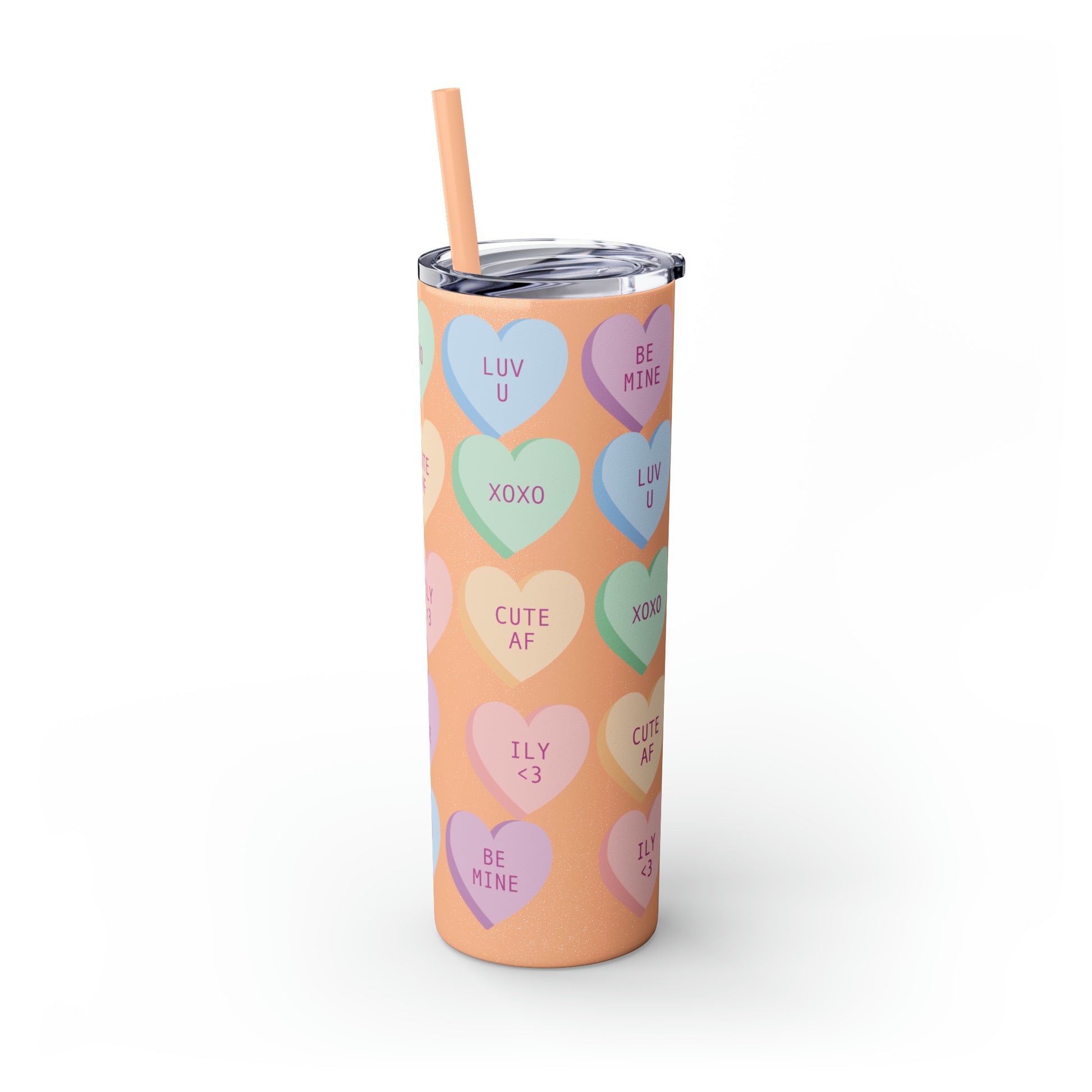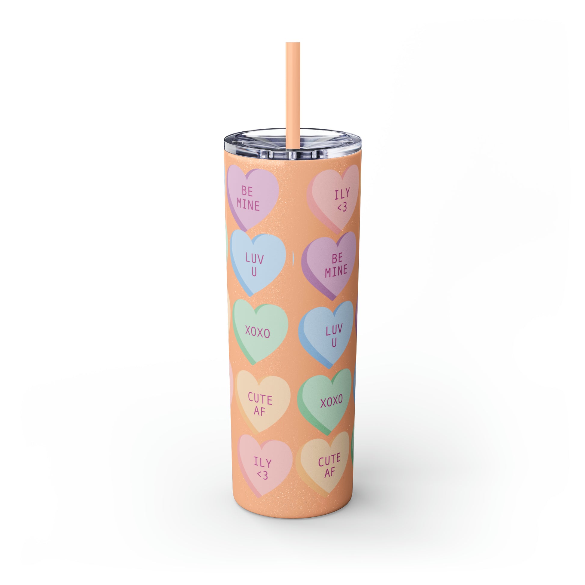 Charming Heart Design: Adorned with the classic conversation heart candies and their cute phrases, this tumbler brings a touch of nostalgia and romance to your daily routine.