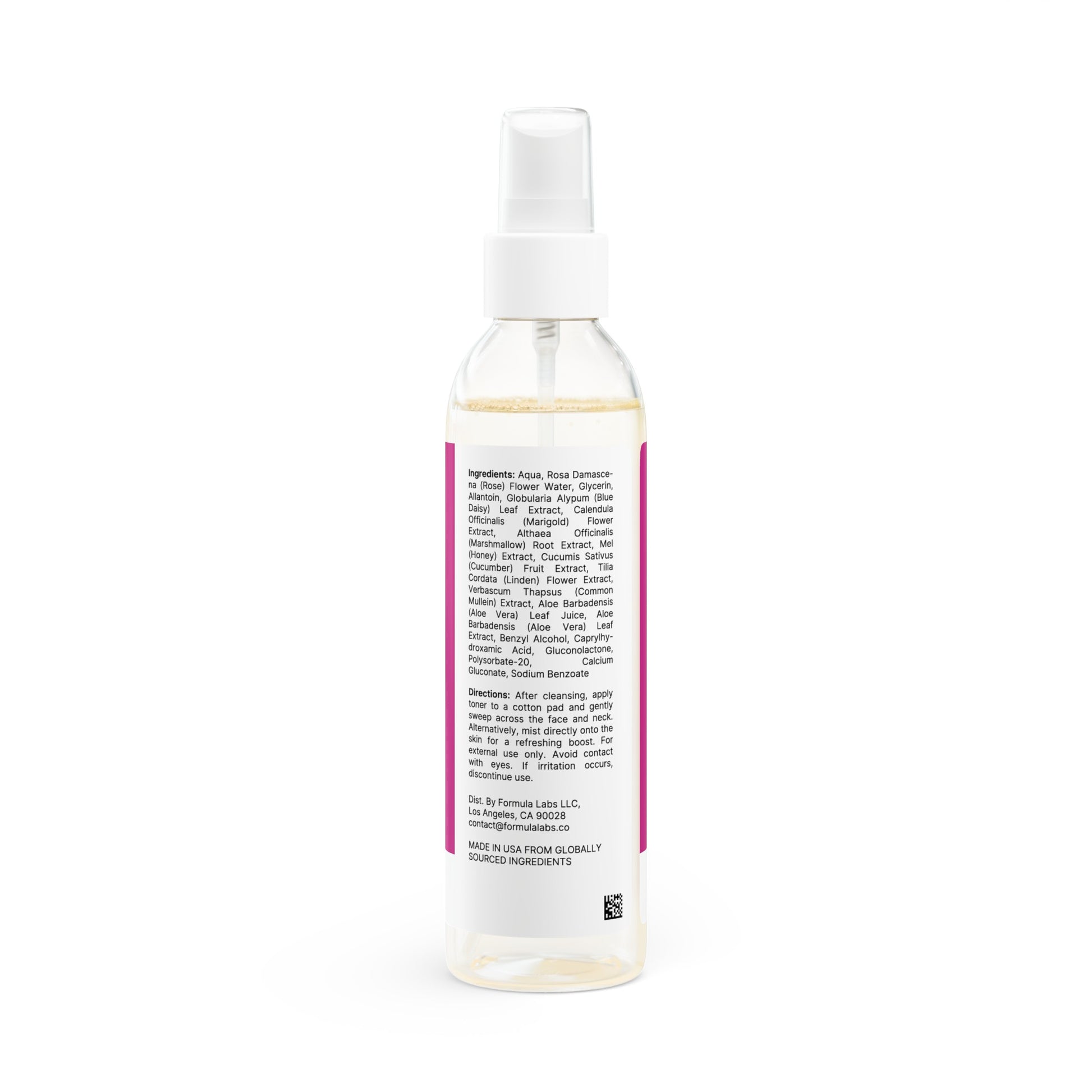 Ingredients: Aqua, Rosa Damascena (Rose) Flower Water, Glycerin, Allantoin, Globularia Alypum (Blue Daisy) Leaf Extract, Calendula Officinalis (Marigold) Flower Extract, Althaea Officinalis (Marshmallow) Root Extract, Mel (Honey) Extract, Cucumis Sativus (Cucumber) Fruit Extract, Tilia Cordata (Linden) Flower Extract, Verbascum Thapsus (Common Mullein) Extract, Aloe Barbadensis (Aloe Vera) Leaf Juice, Aloe Barbadensis (Aloe Vera) Leaf Extract, Benzyl Alcohol, Caprylhydroxamic Acid, Gluconolactone, Polysorbate-20, Calcium Gluconate, Sodium Benzoate.