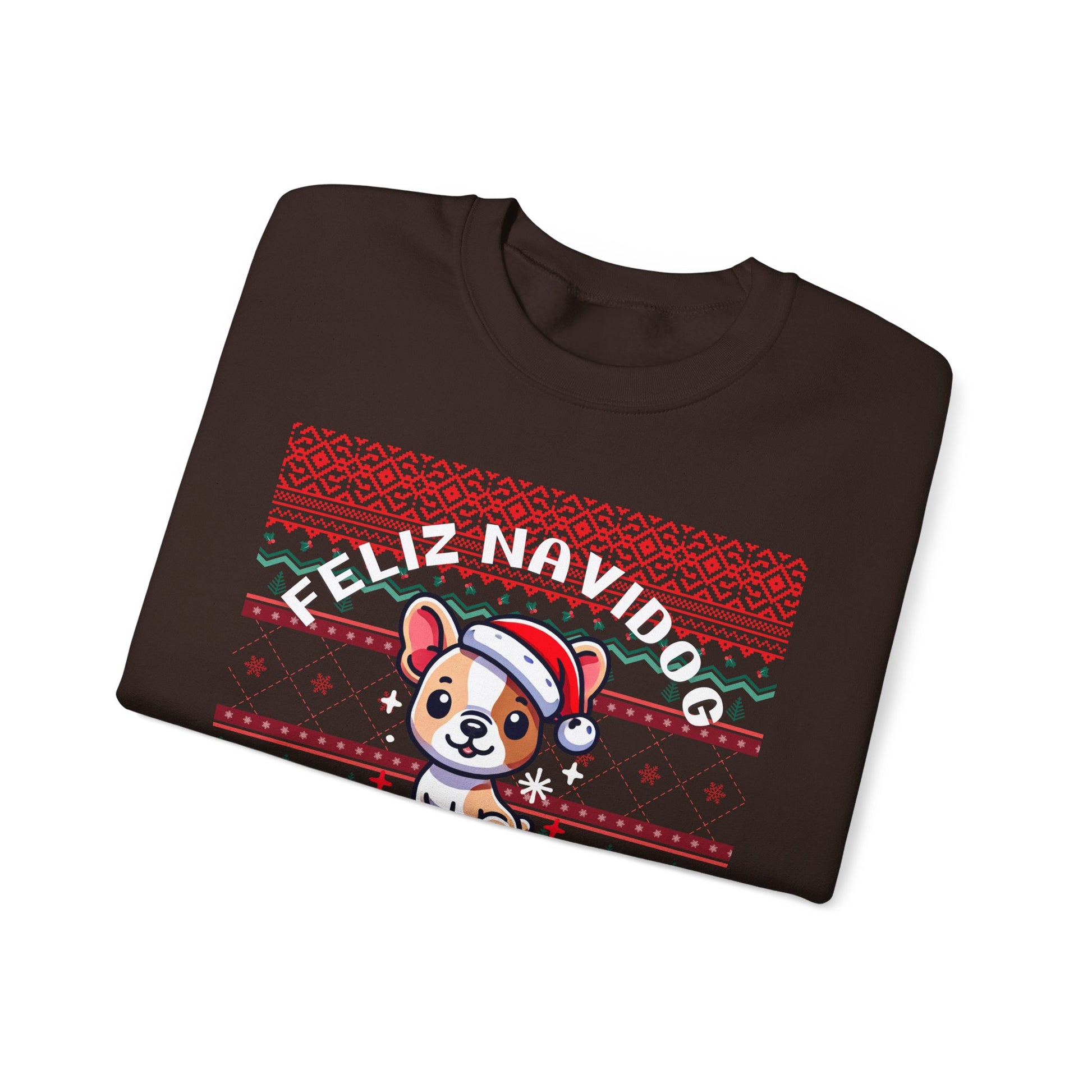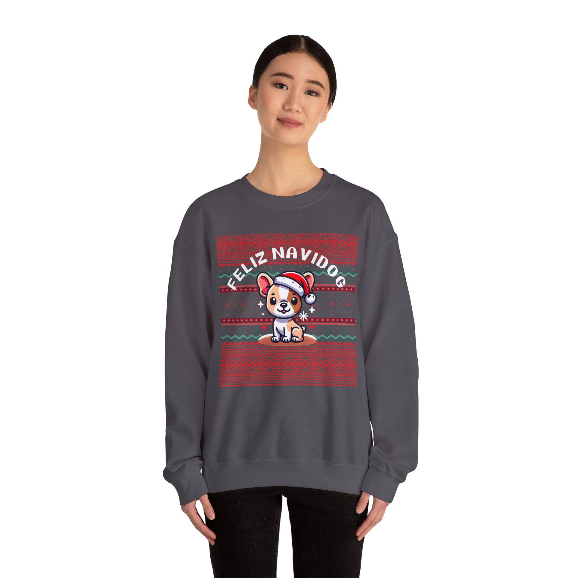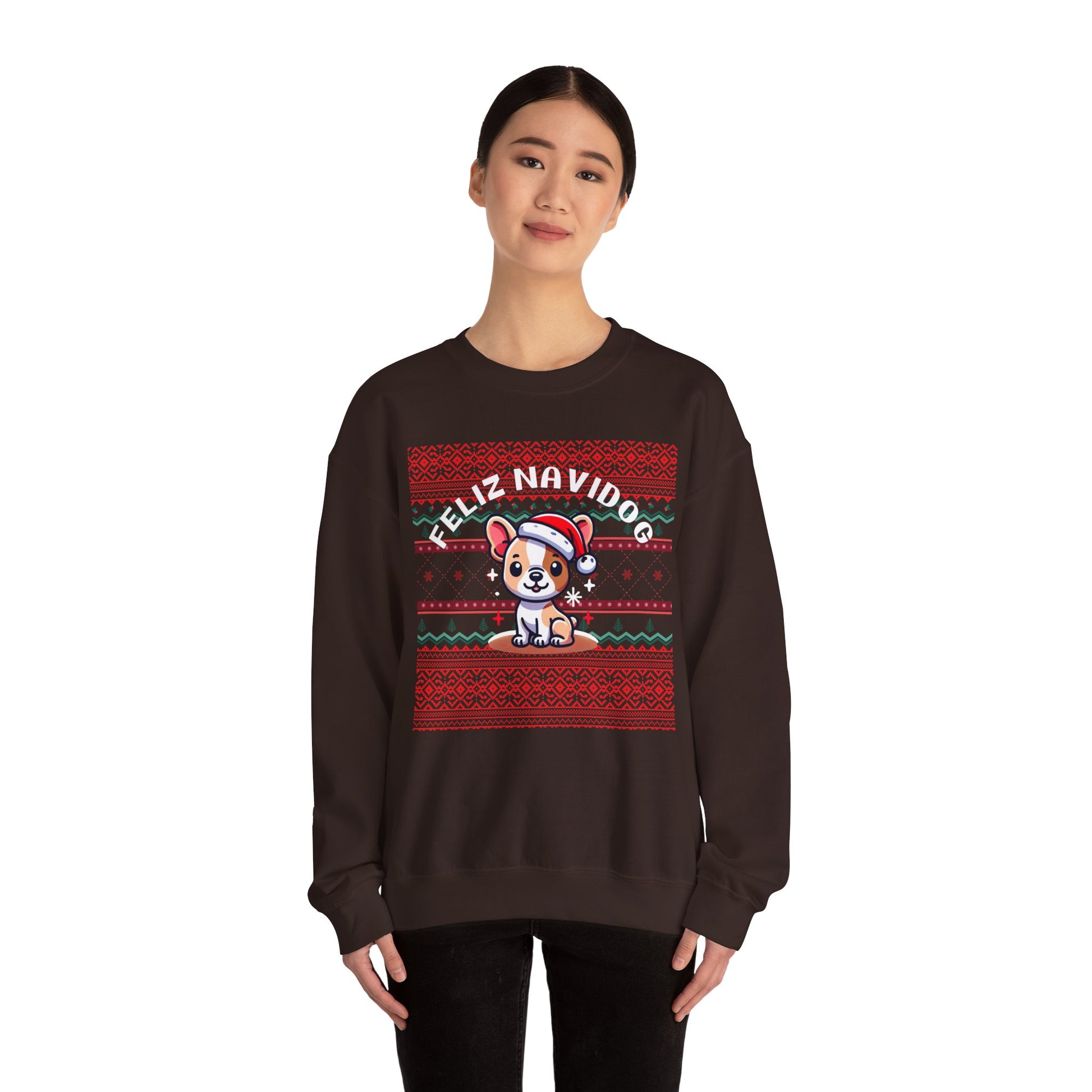 Get ready to paws-itively sleigh this holiday season with our Feliz Navidog Ugly Christmas Sweater! This festive and playful sweater features an adorable dog decked out in a Santa hat, spreading holiday cheer in style. With its bright and bold design, this sweater is the perfect mix of ugly Christmas sweater tradition and dog lover’s delight. Whether you're attending an ugly sweater party, taking holiday photos, or simply spreading some four-legged festive fun, this cozy sweater will have you wagging your tail with joy.