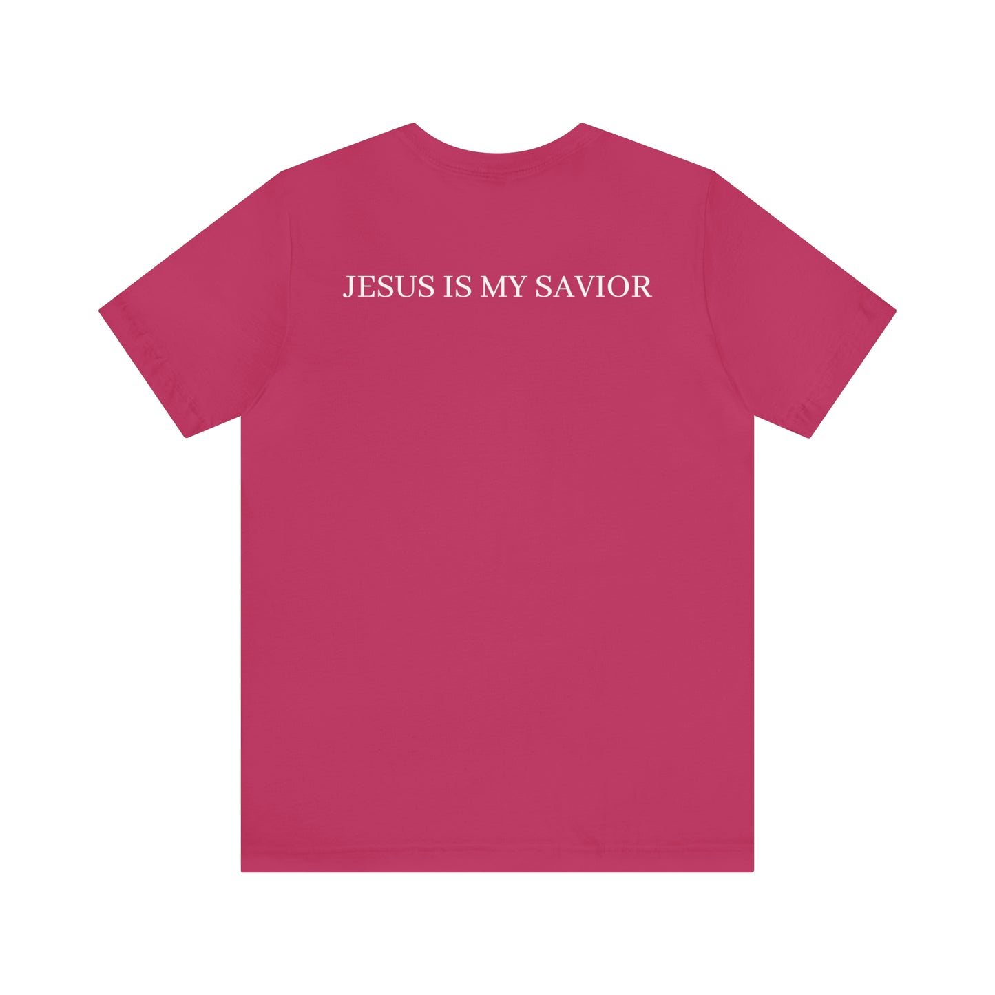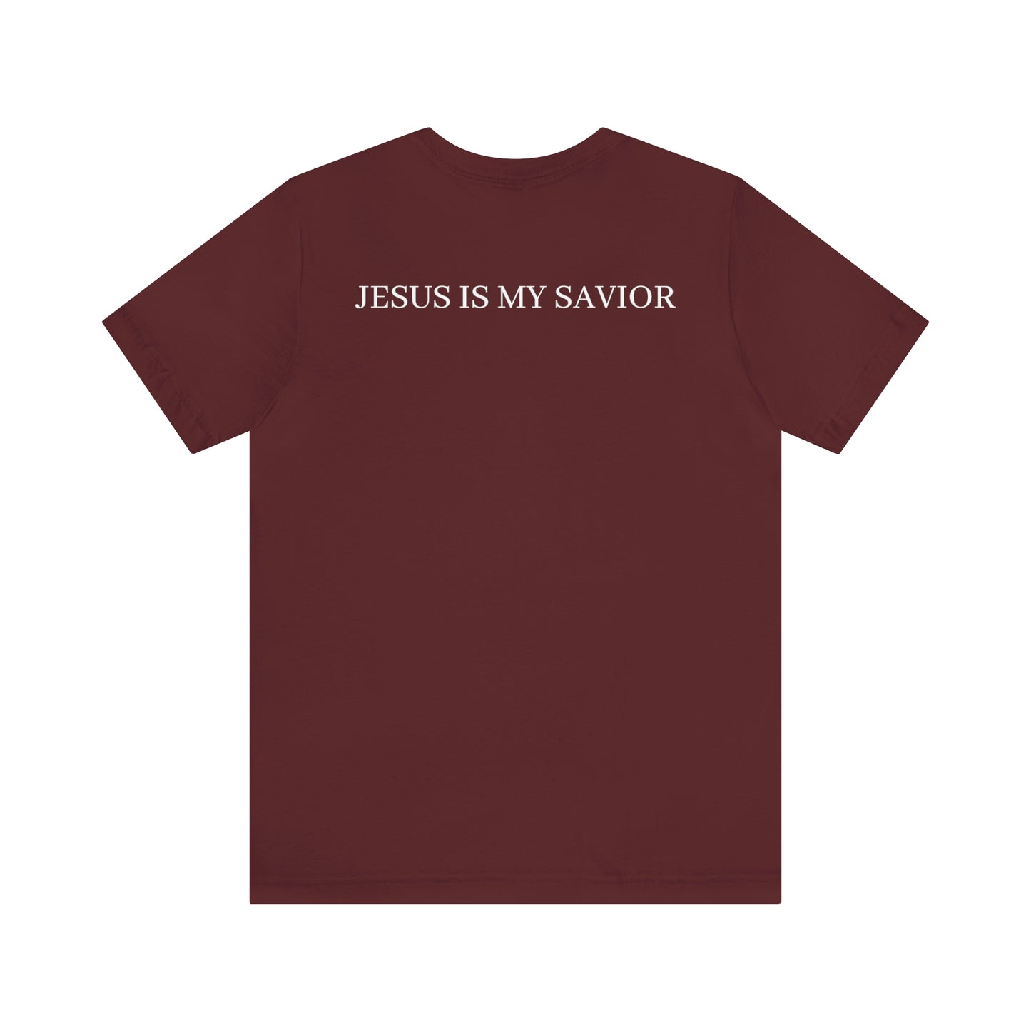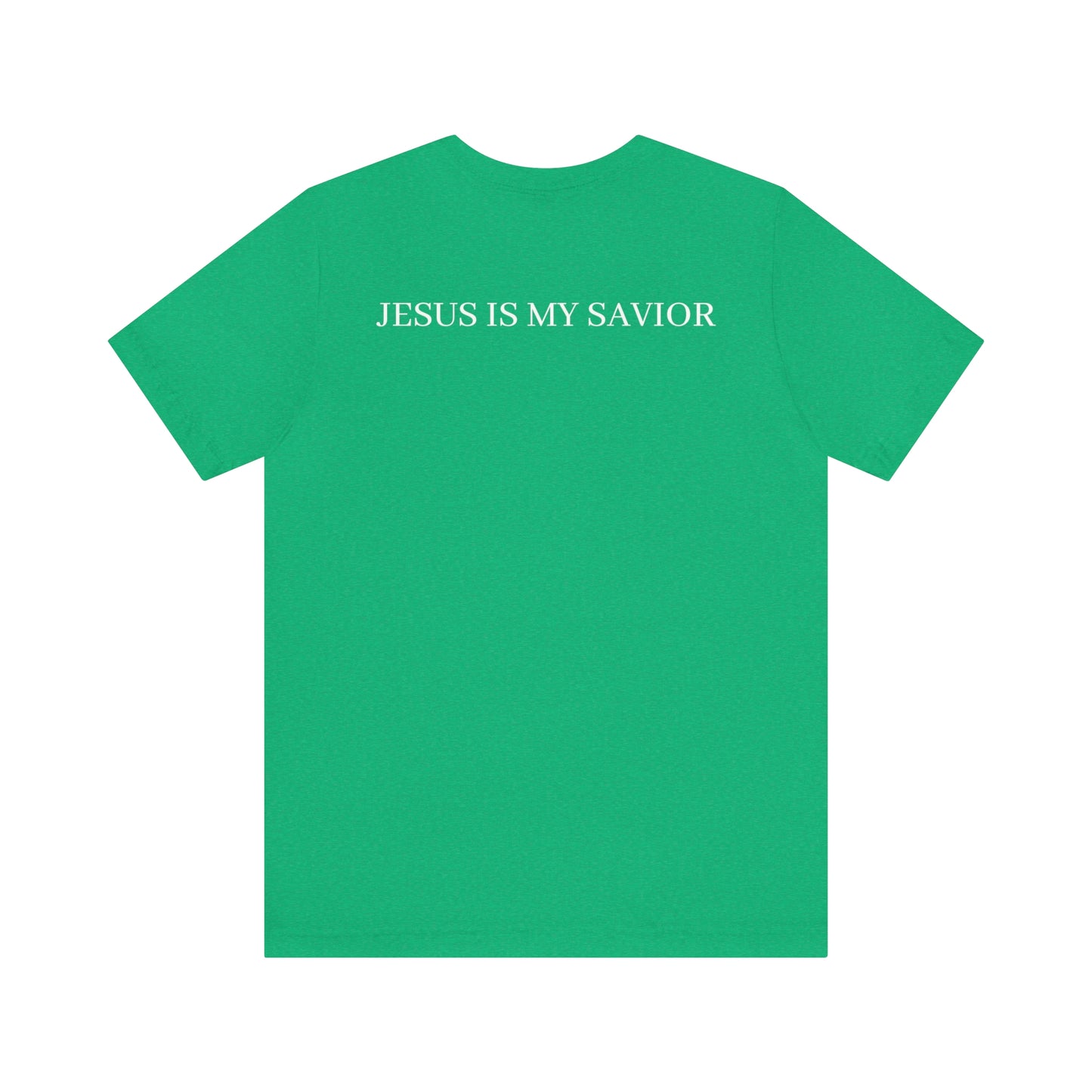 On the back of the shirt, the words "Jesus is My Savior" stand tall, embodying the core of your belief and proclaiming the personal relationship you share with the Son of God. It is a reminder of the extraordinary gift of salvation and the eternal hope found in Jesus Christ.