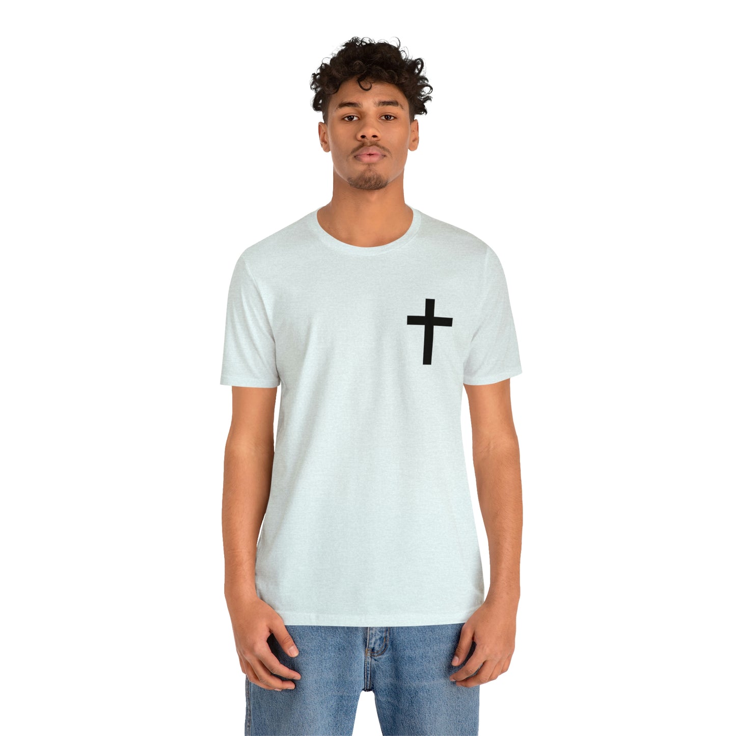 The front of the shirt showcases a beautifully crafted cross, a symbol that represents the ultimate sacrifice made by Jesus for the redemption of humanity. This cross serves as a visual reminder of the love, mercy, and grace that flow from His sacrifice, offering forgiveness and new beginnings to all who believe.