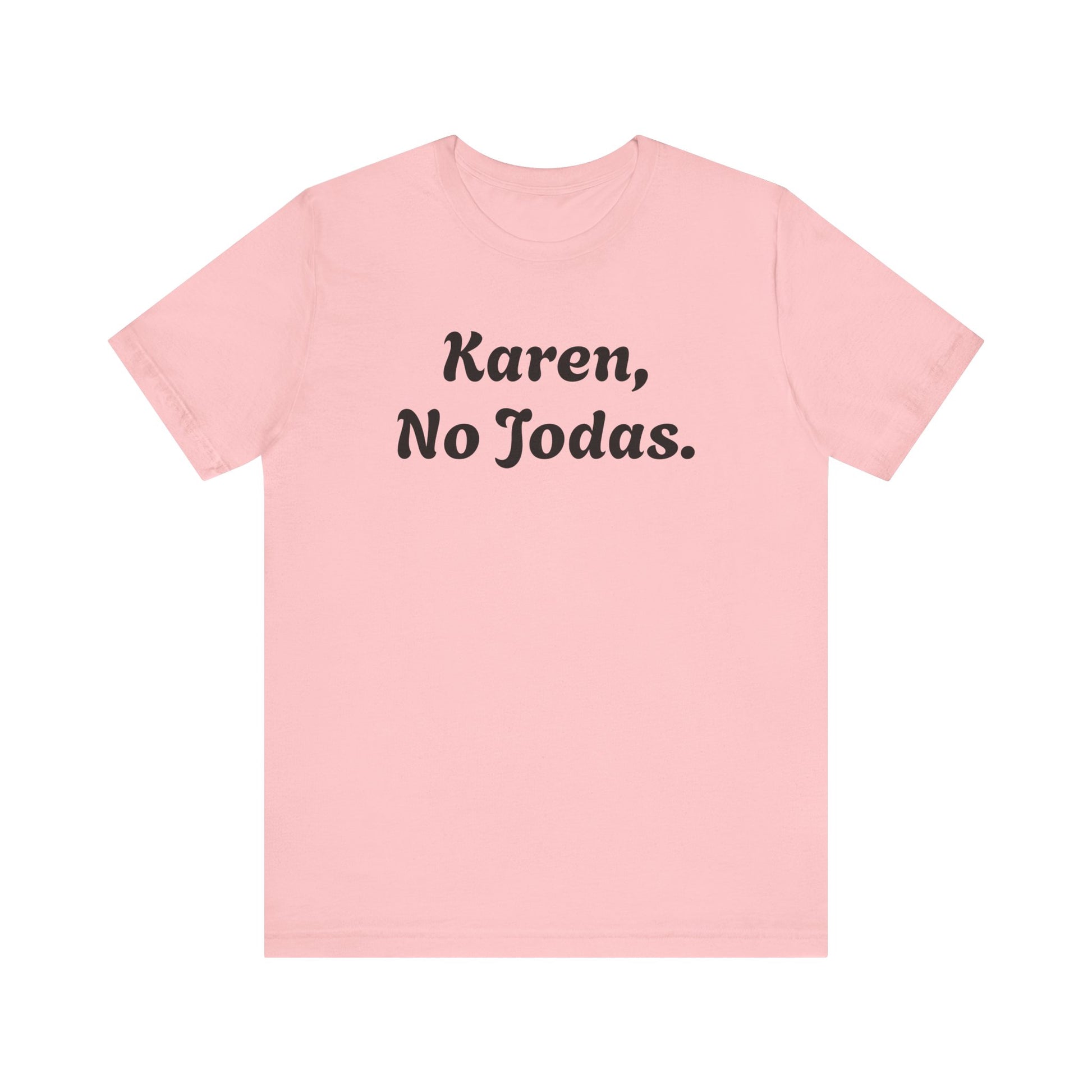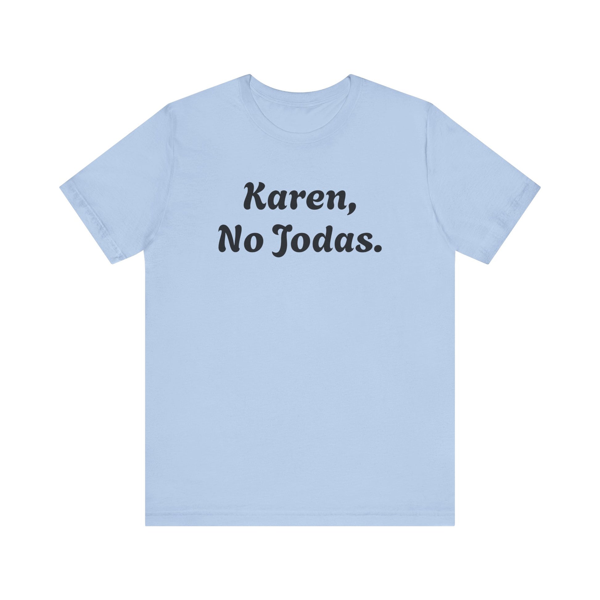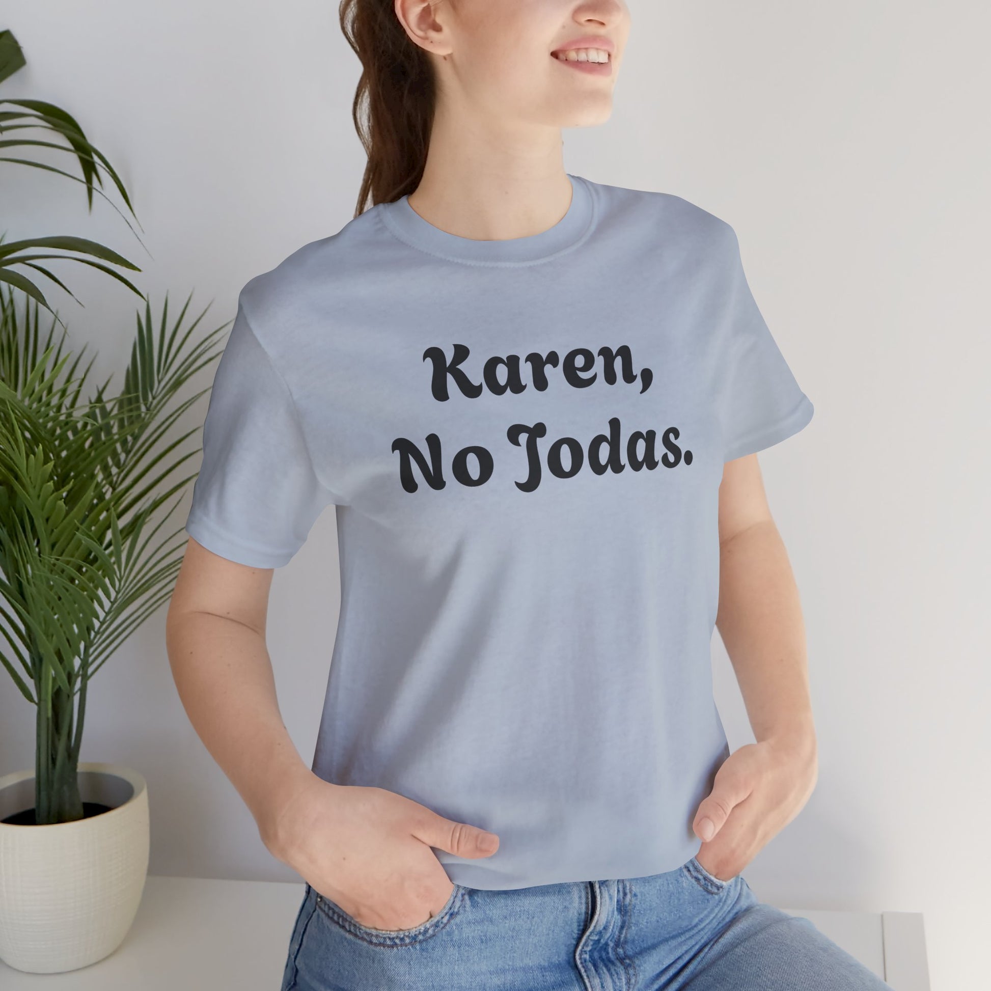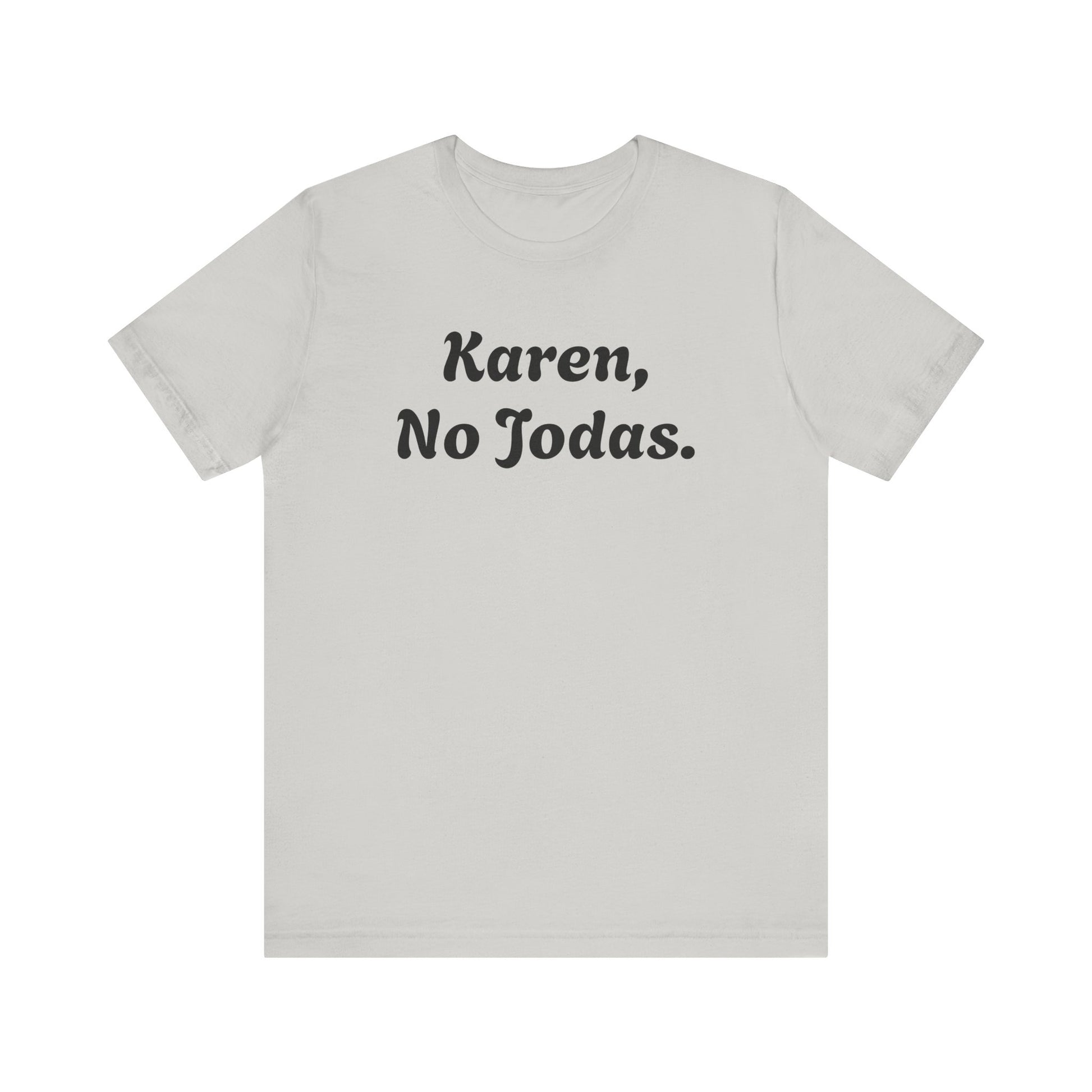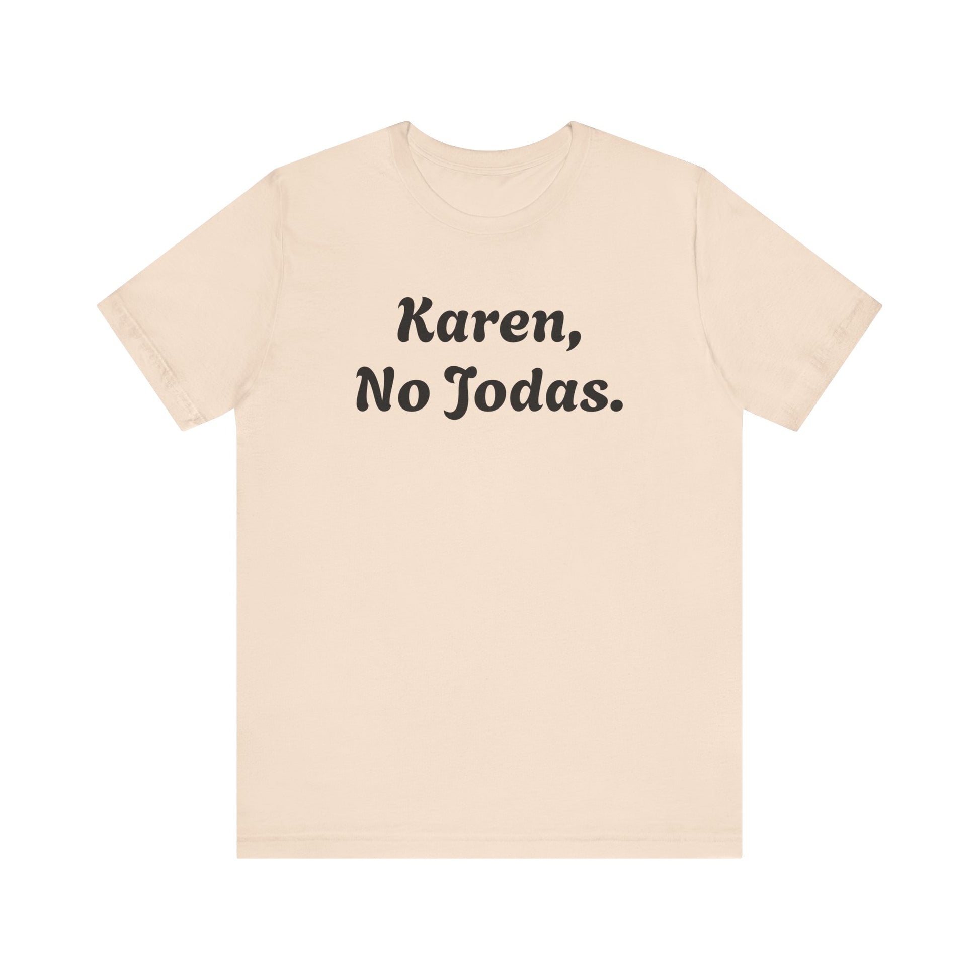 Pair it effortlessly with jeans, shorts, or skirts to create a statement ensemble that commands attention. By wearing our "Karen, No Jodas" shirt, you assert your right to a hassle-free existence and encourage others to treat each other with respect and empathy.
