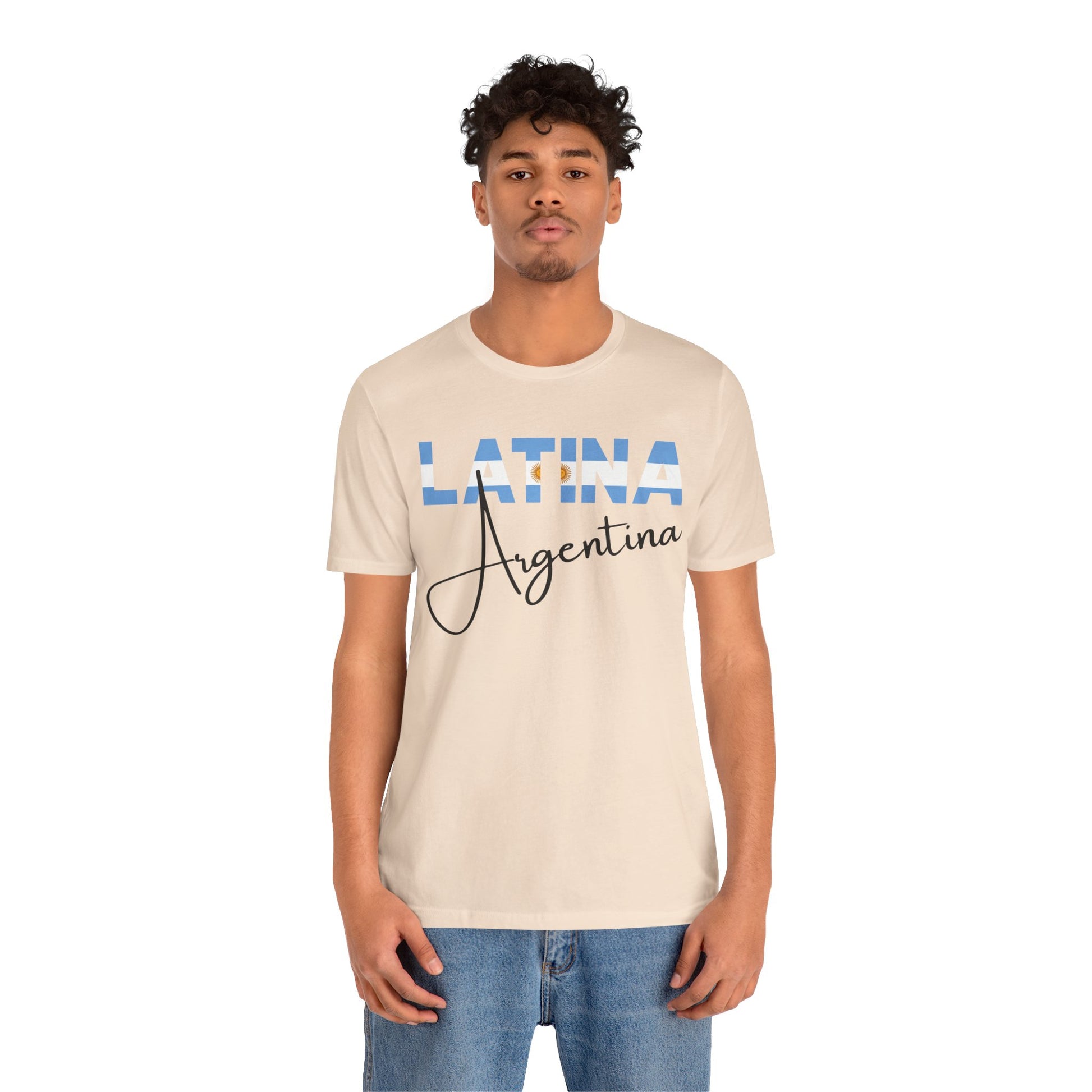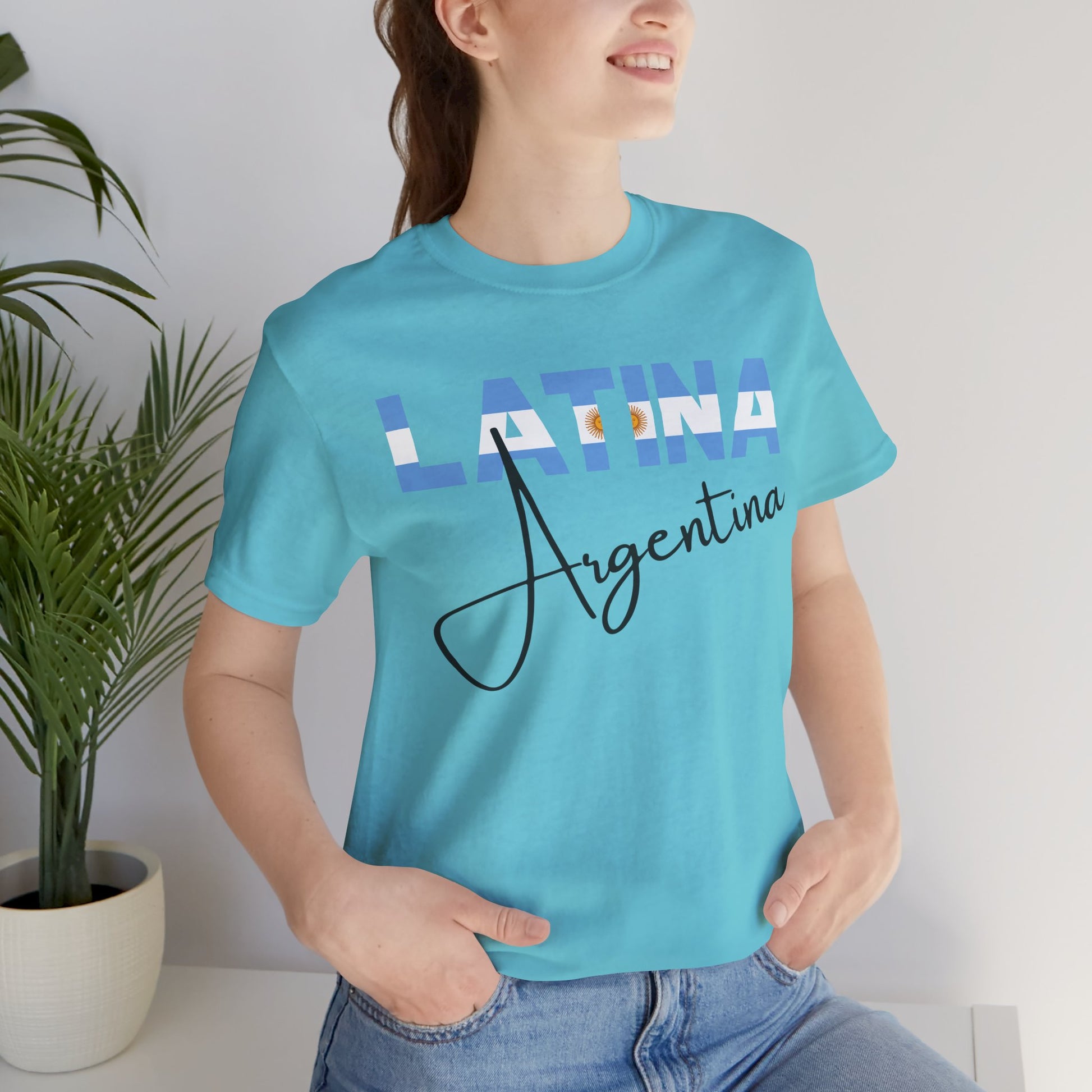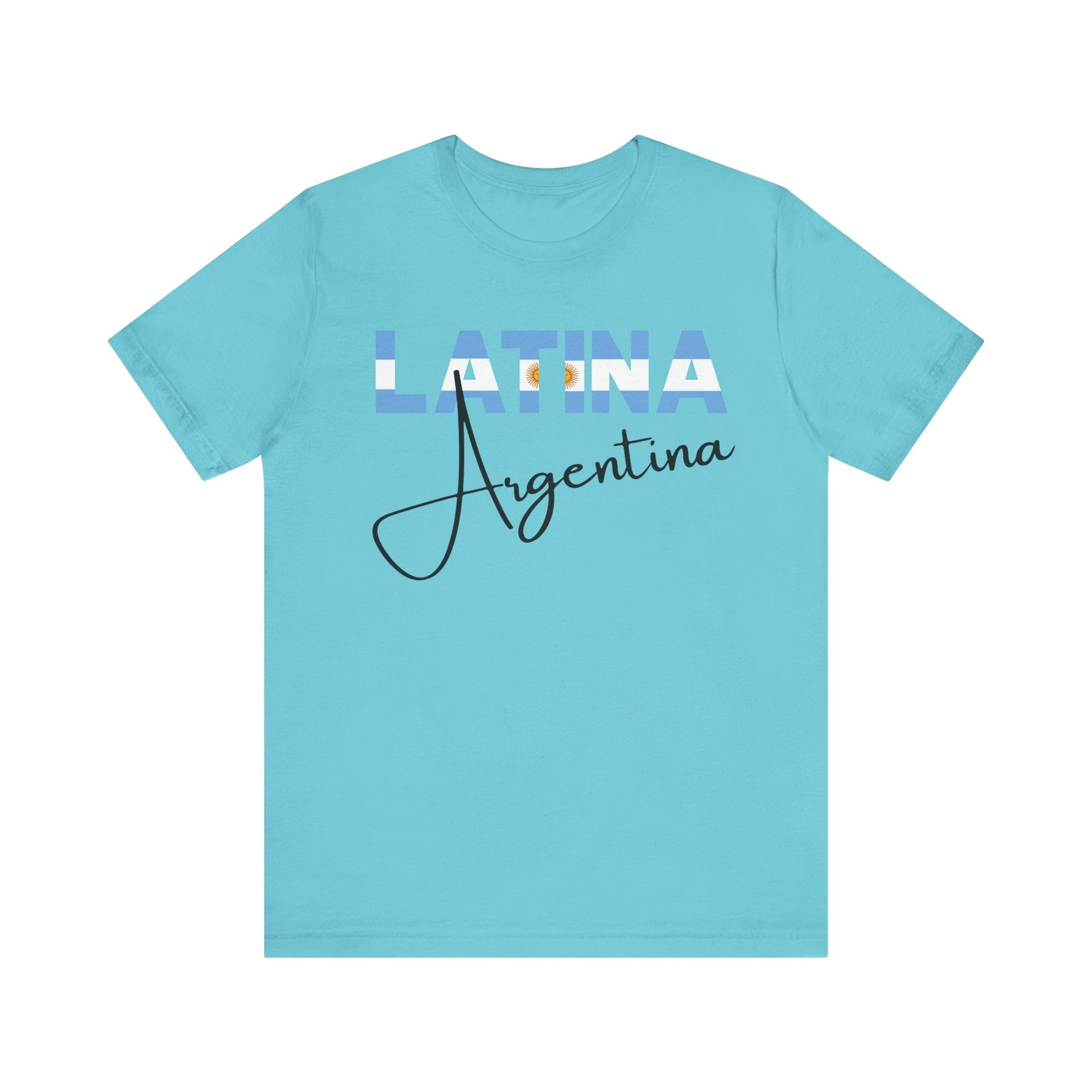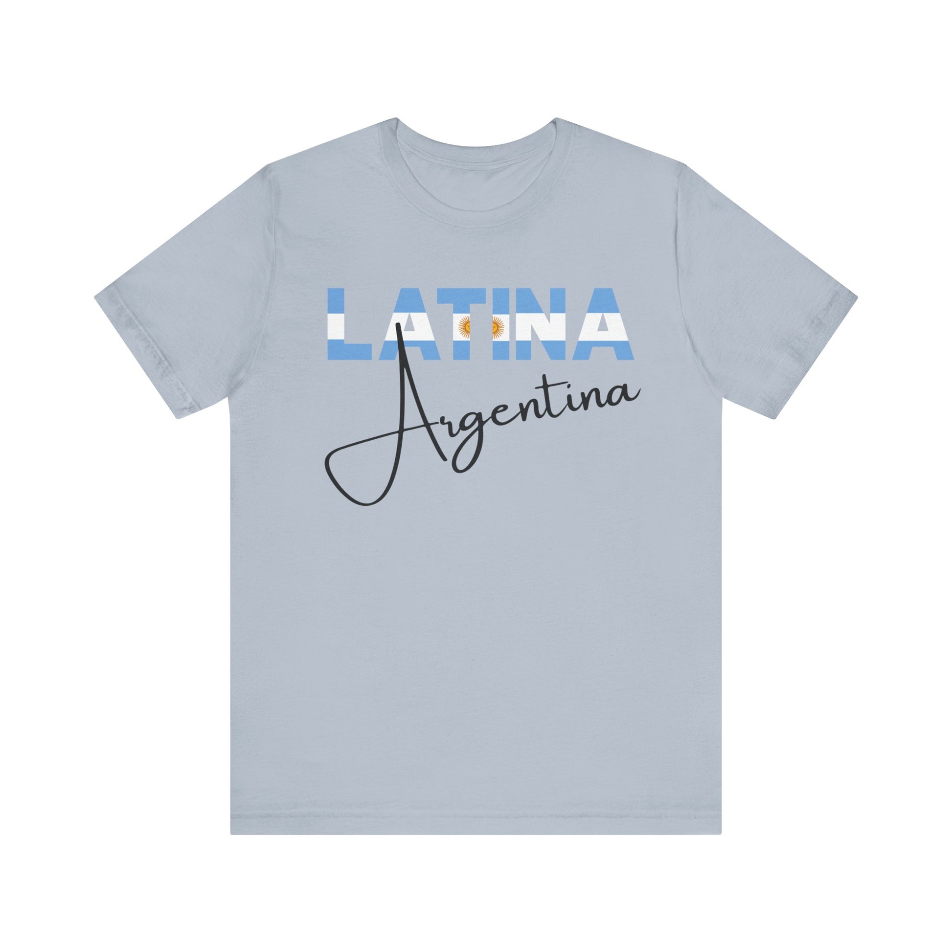 Introducing the "Latina Argentina" top - a stylish and meaningful addition to your wardrobe. This top comes in a variety of colors, so you can choose the one that best suits your personal style. The word "Latina" is emblazoned across the front of the shirt, with the colors of the Argentina flag proudly displayed on each letter, symbolizing the unique cultural heritage of Argentina.