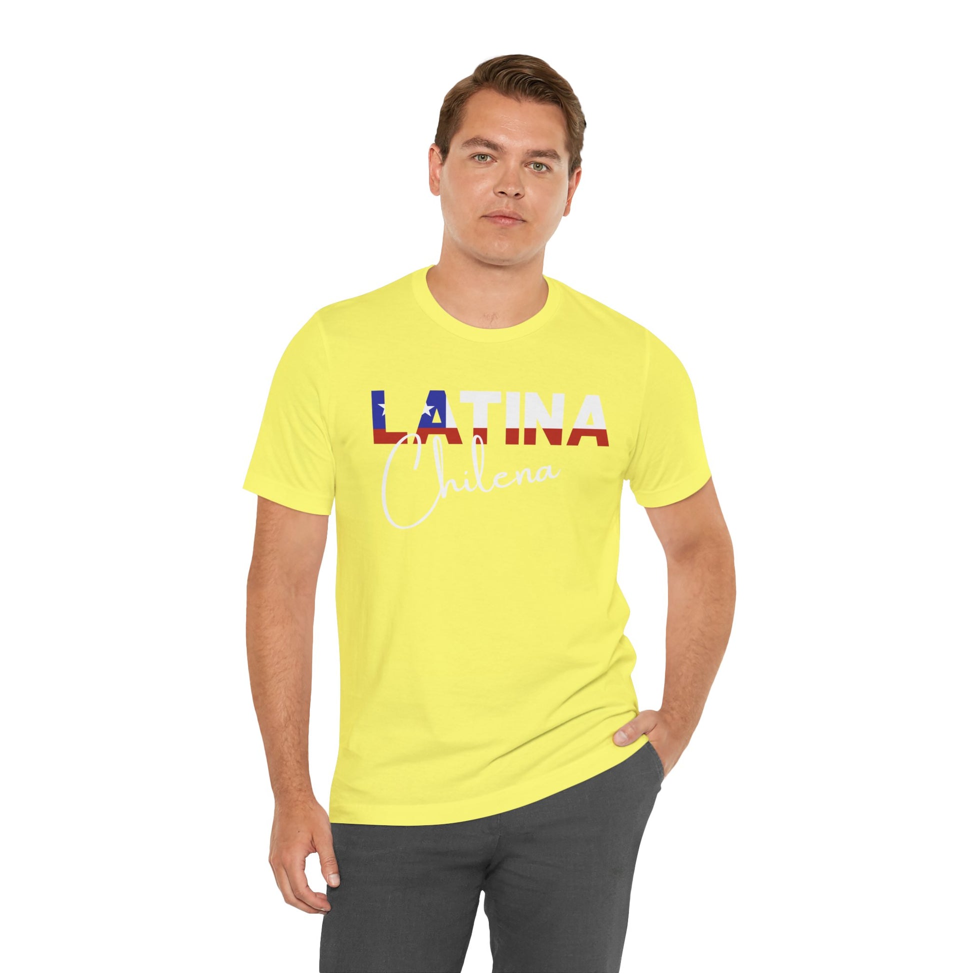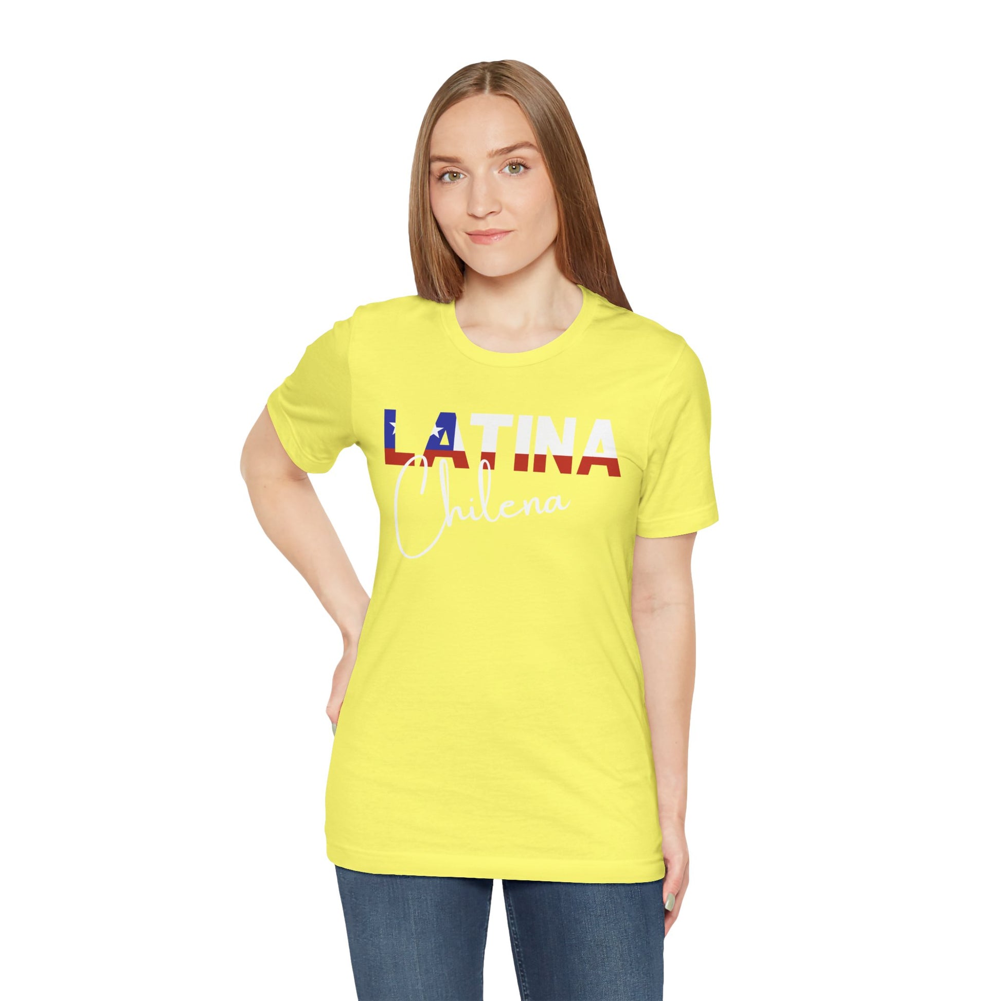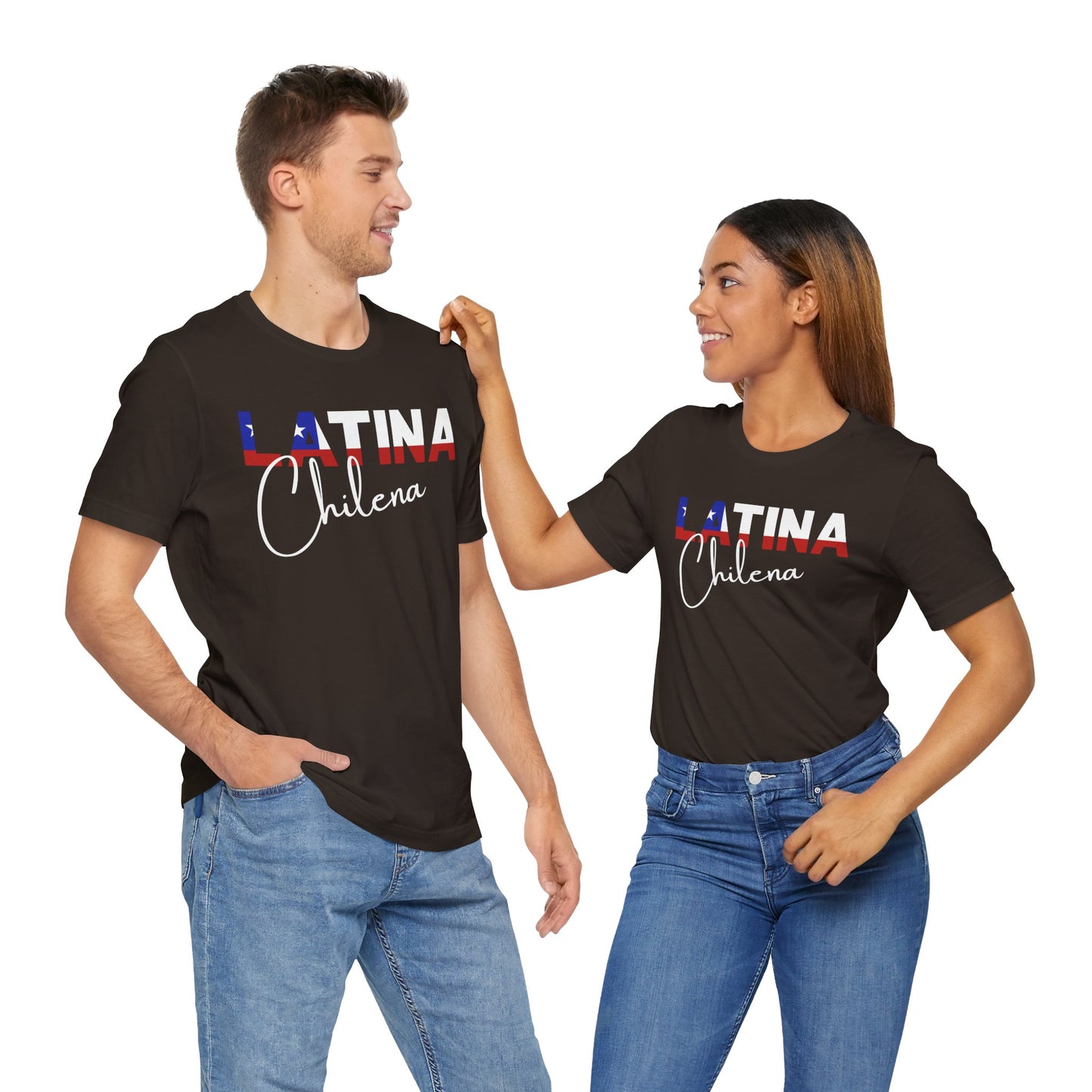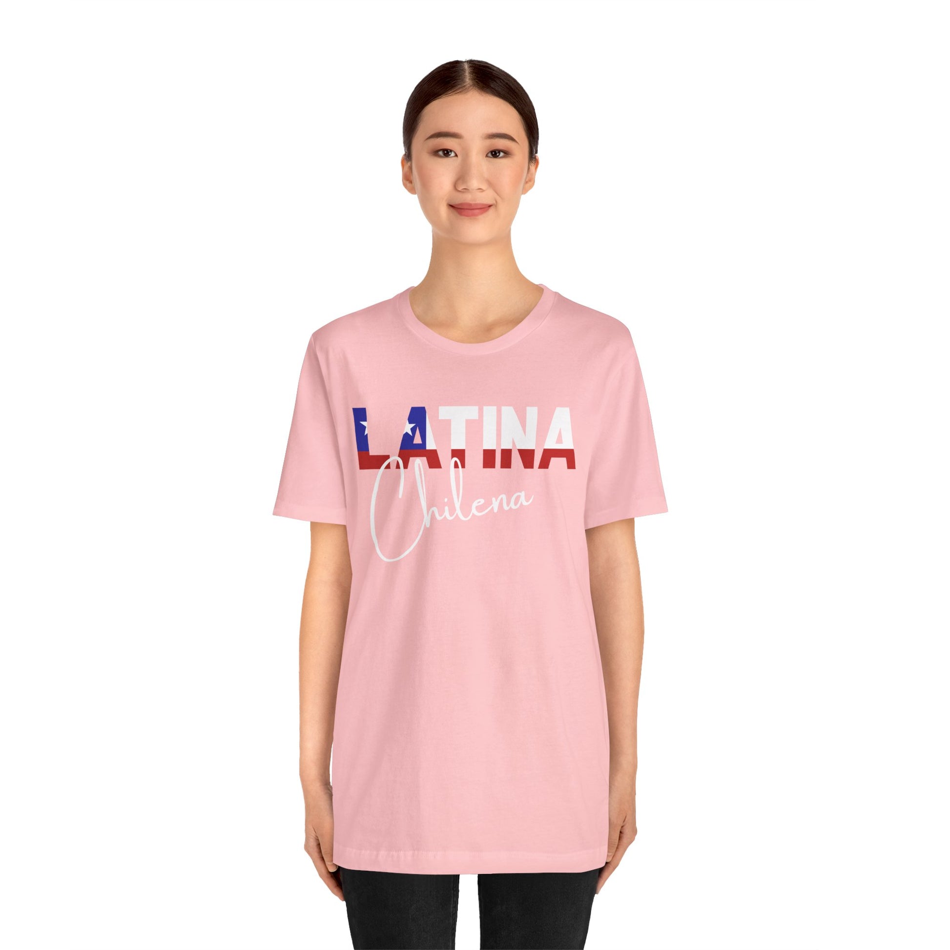 Introducing the "Latina Chilena" top - a stylish and meaningful addition to your wardrobe. This top comes in a variety of colors, so you can choose the one that best suits your personal style. The word "Latina" is emblazoned across the front of the shirt, with the colors of the Chile flag proudly displayed on each letter, symbolizing the unique cultural heritage of Chile.