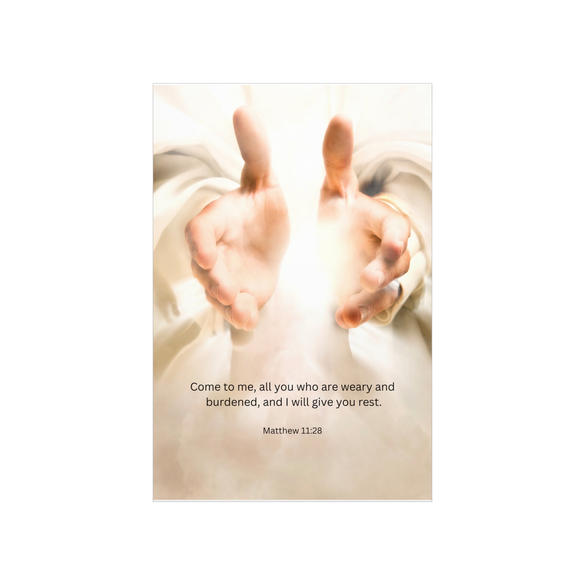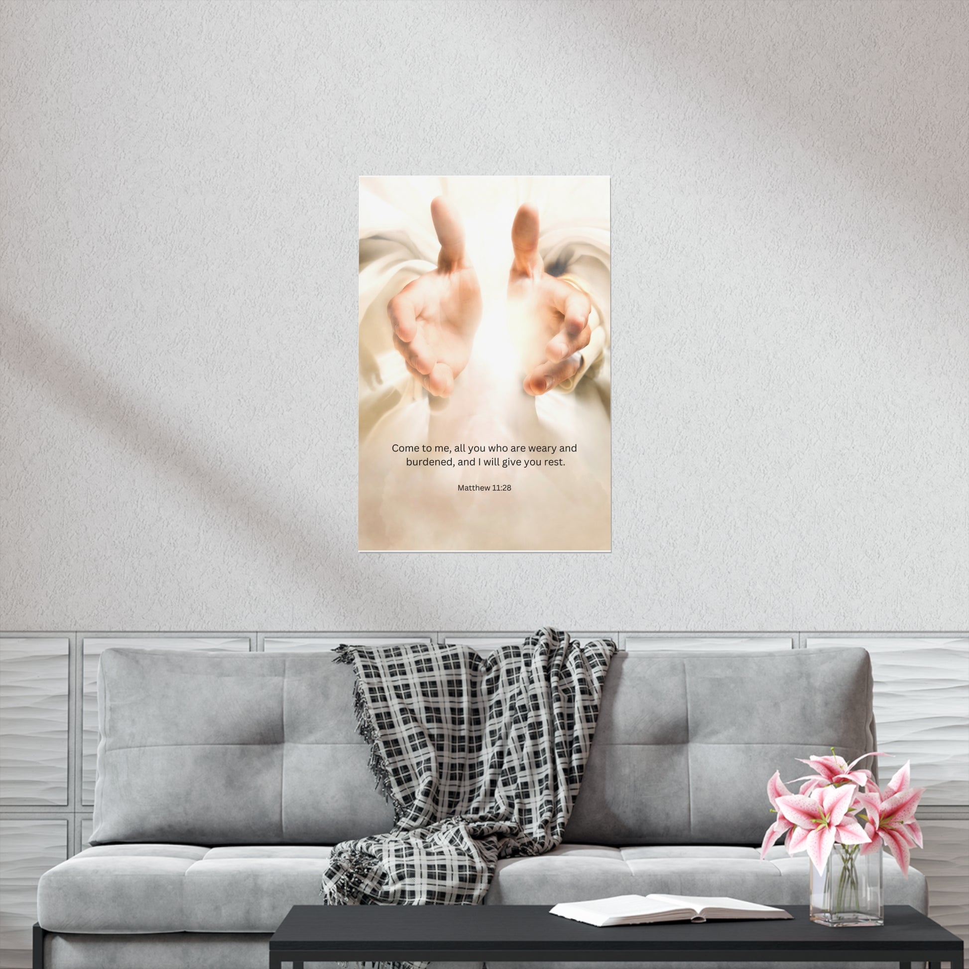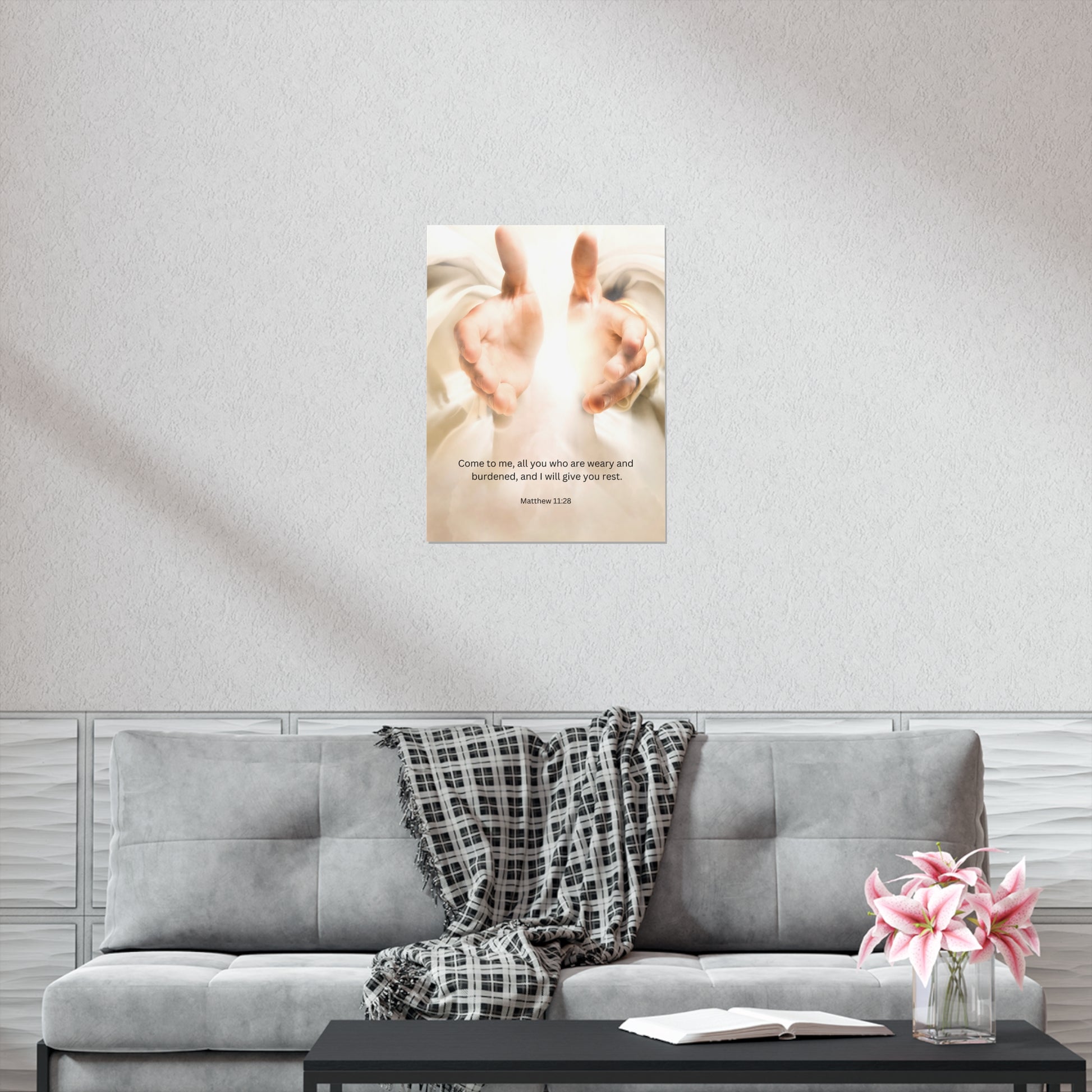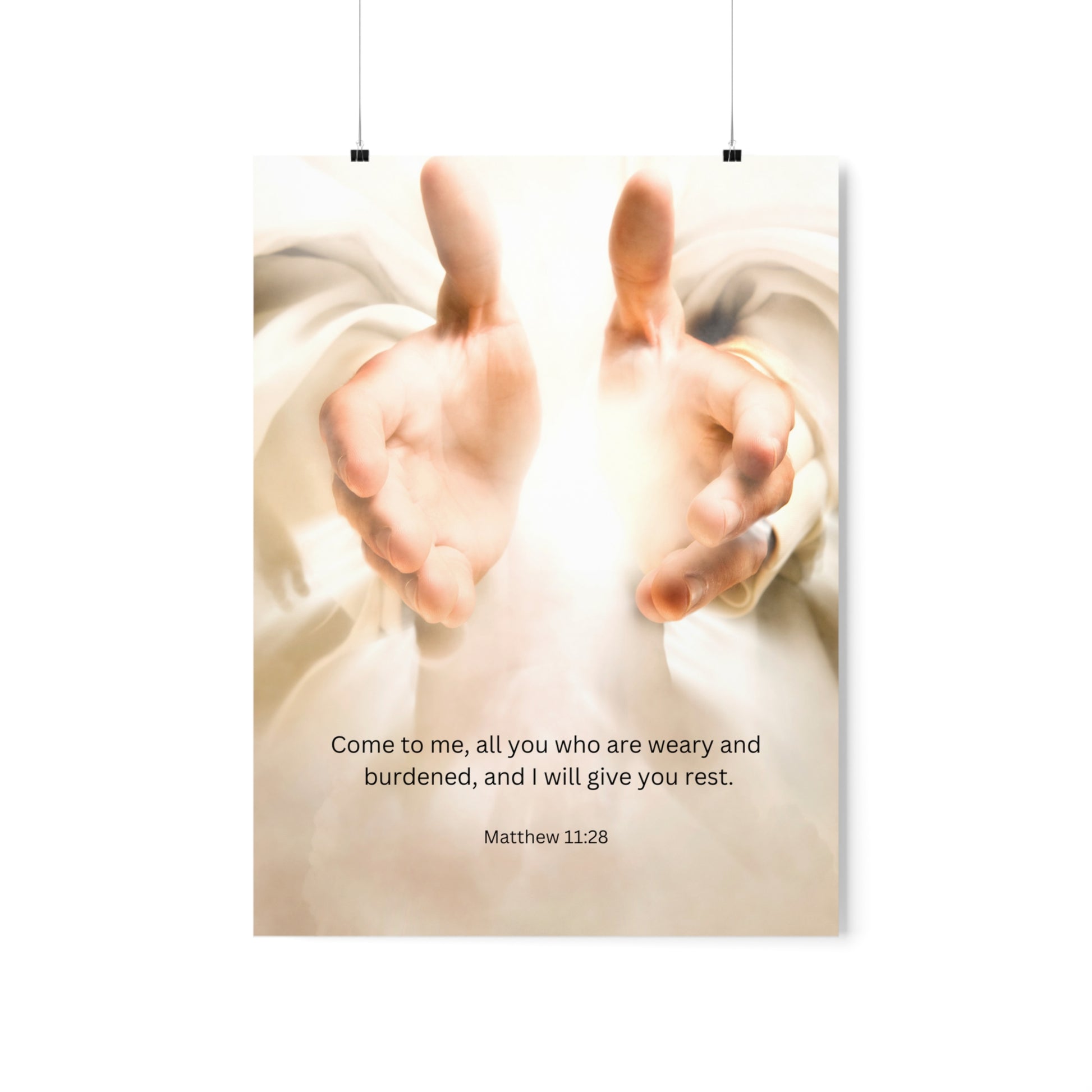 Embrace the power of Matthew 11:28 with the Matte Poster, a visual masterpiece that brings the comforting words of Jesus to life. May it serve as a beacon of light, reminding you of the rest and solace that awaits those who come to Him.