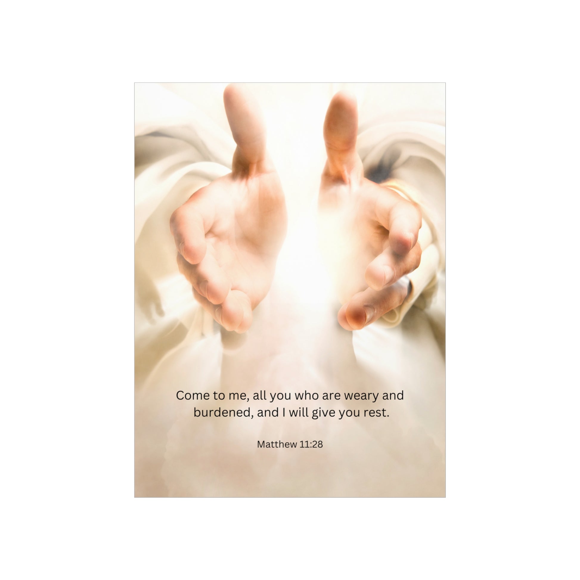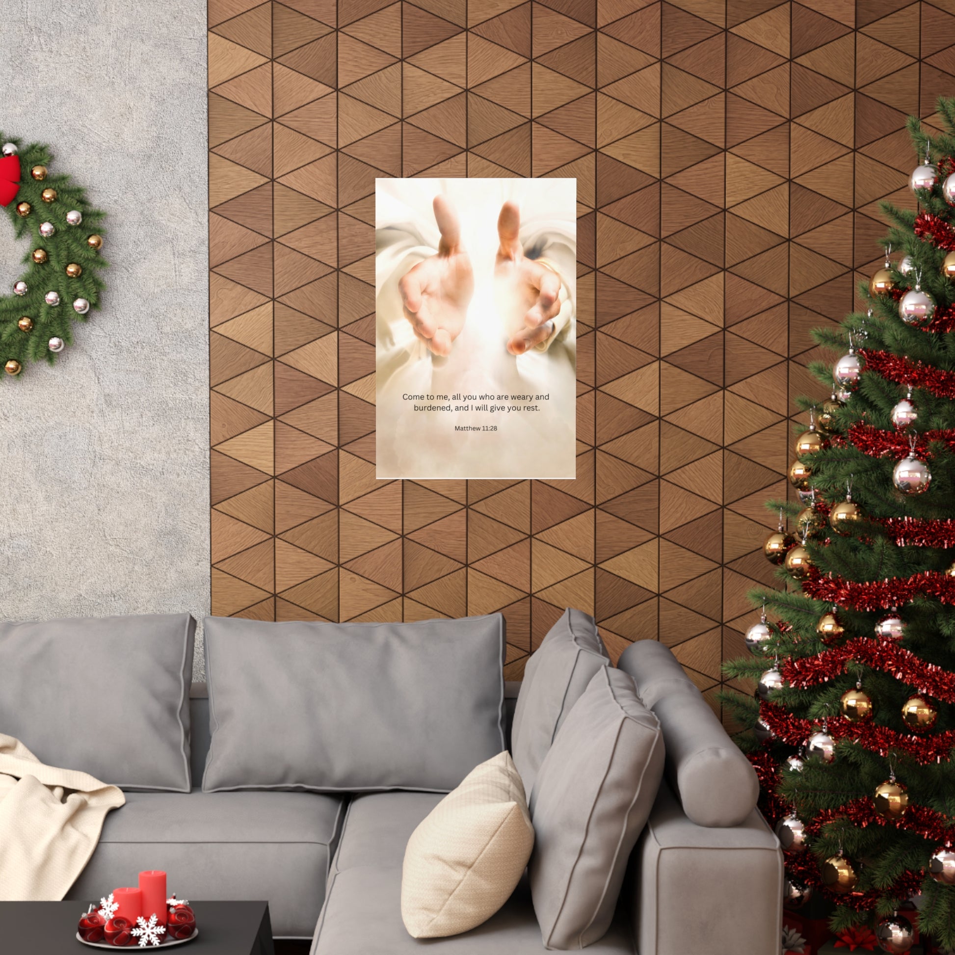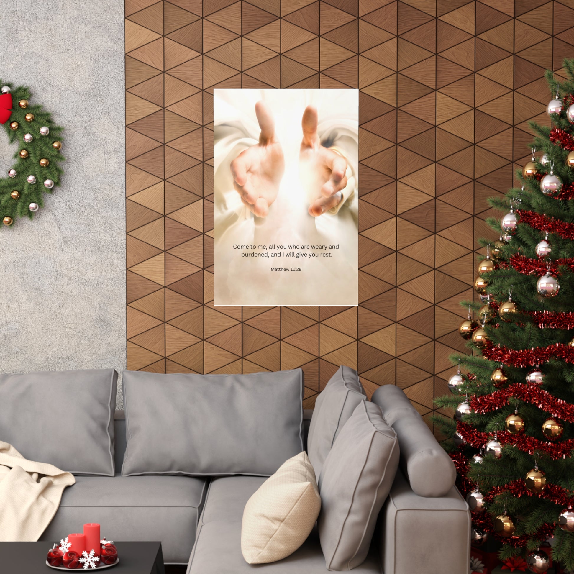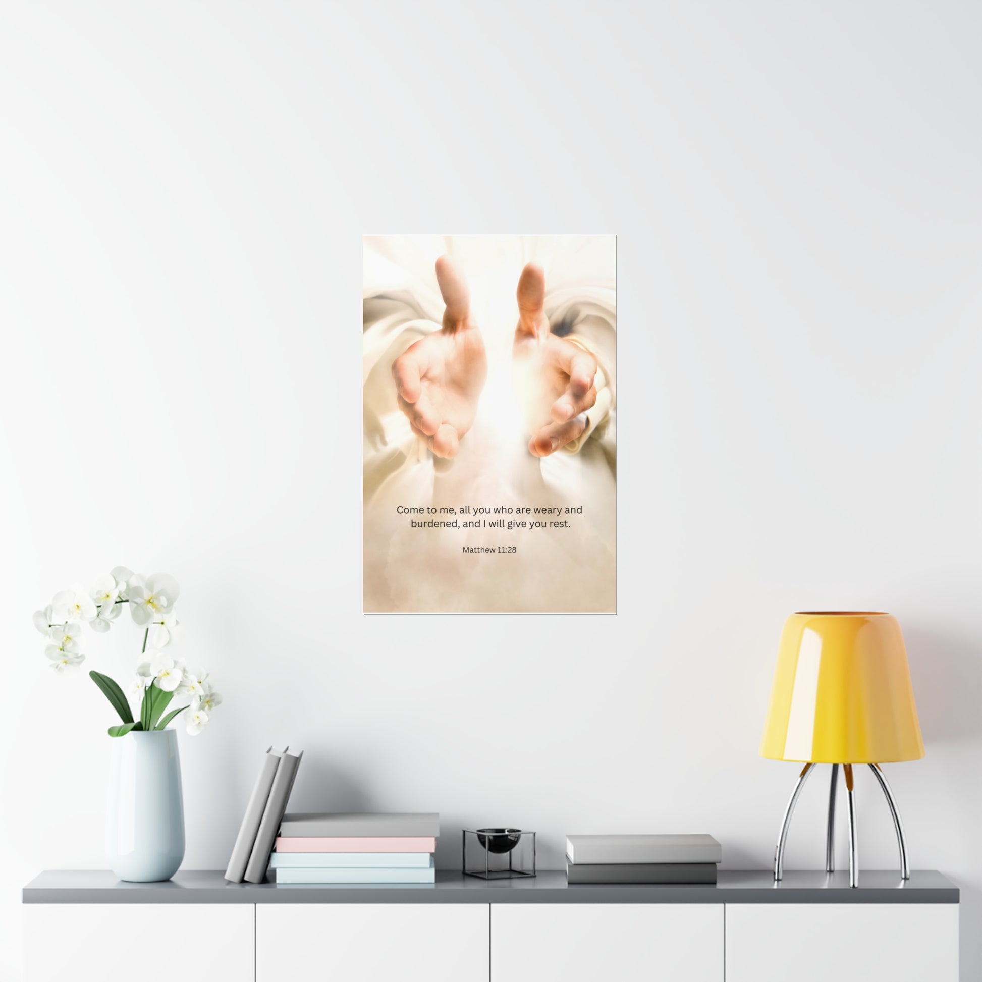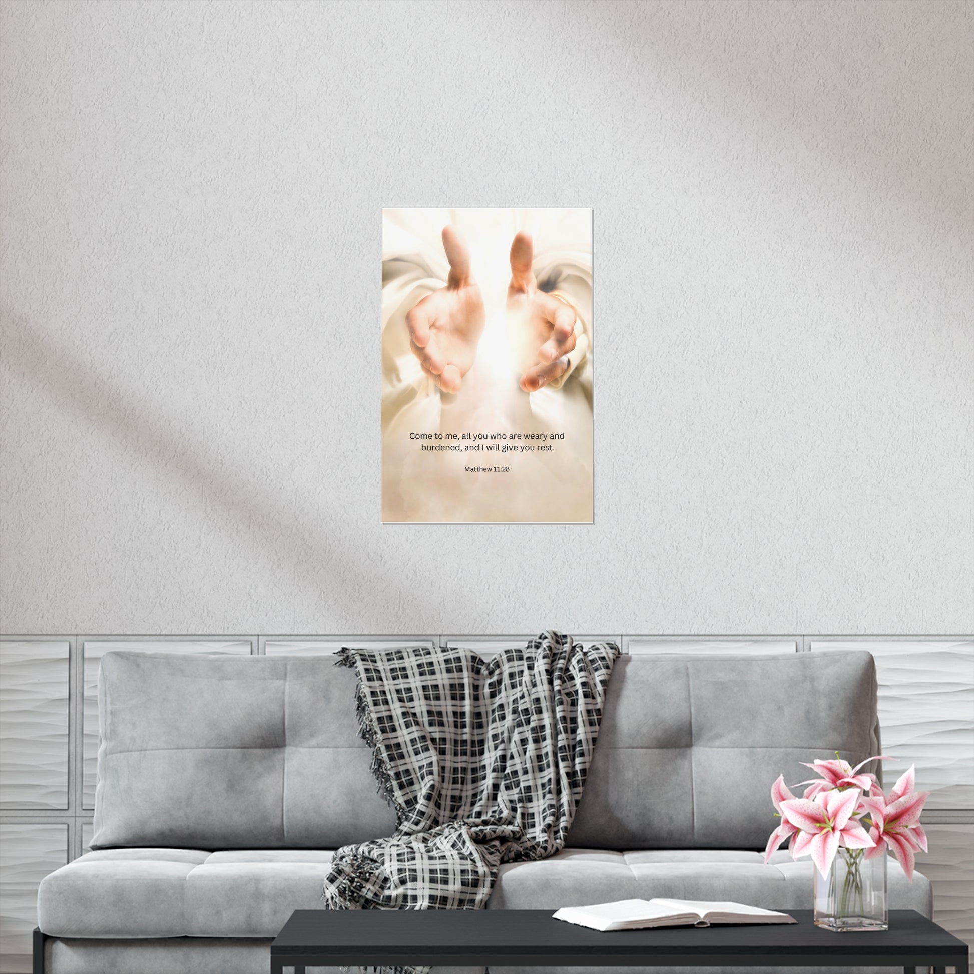 Embrace the power of Matthew 11:28 with the Matte Poster, a visual masterpiece that brings the comforting words of Jesus to life. May it serve as a beacon of light, reminding you of the rest and solace that awaits those who come to Him.