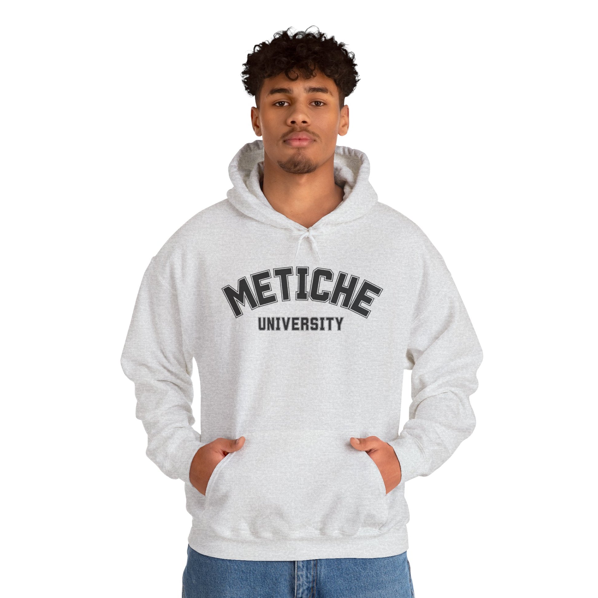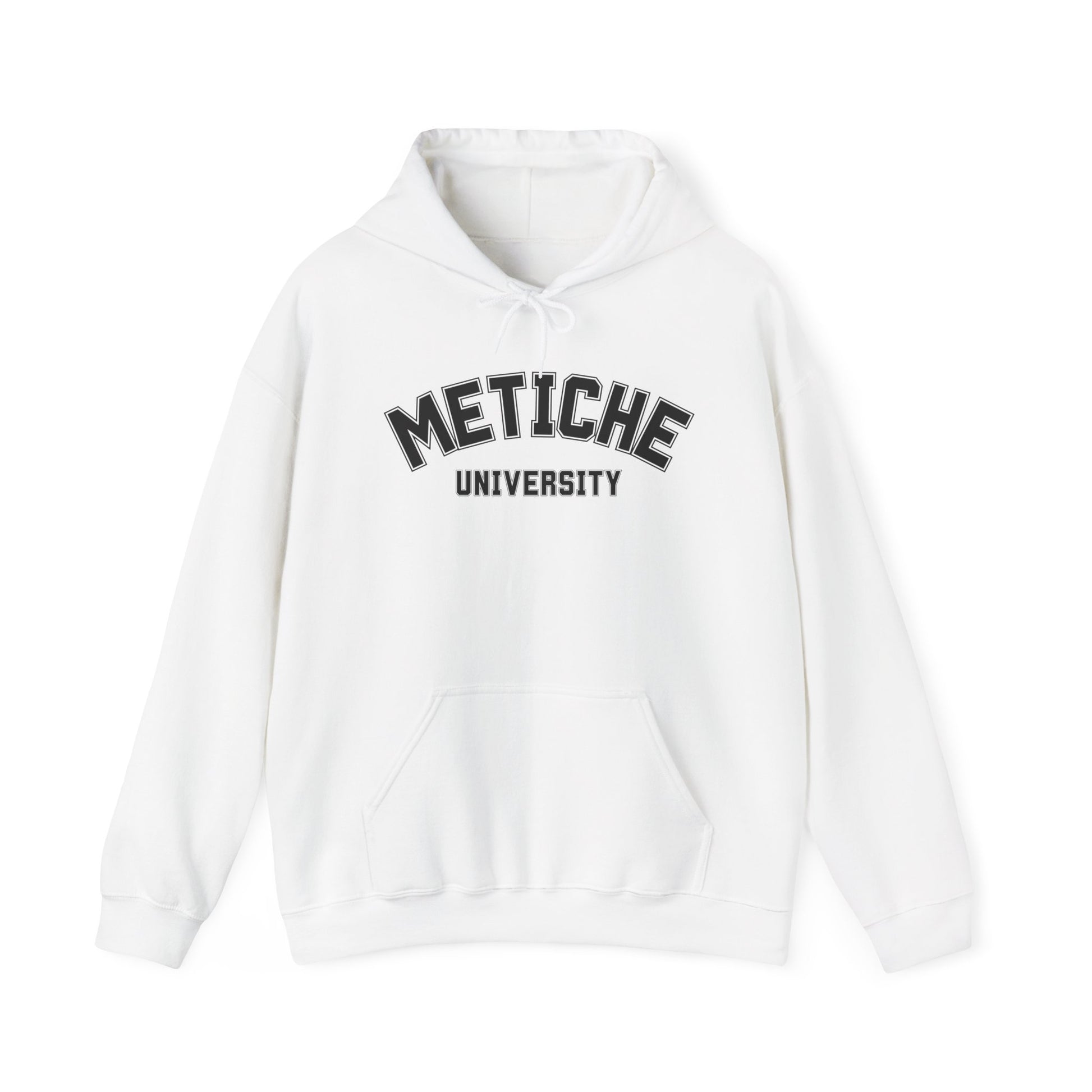 The bold typography and vibrant colors make the design pop, drawing attention to the shirt and its humorous message. The phrase "Metiche University" is proudly displayed, celebrating the curious and inquisitive individuals who love to gather information and explore the world around them.