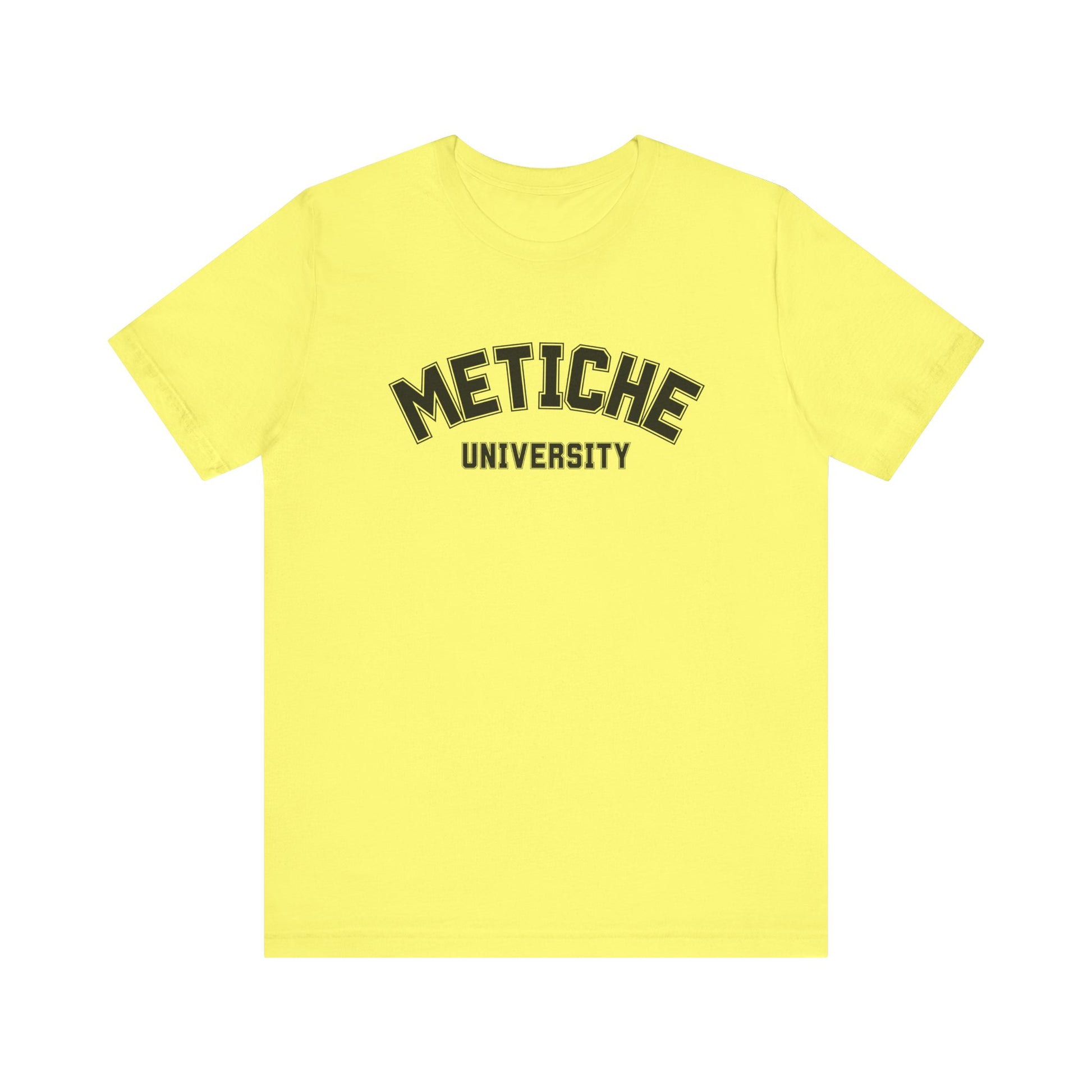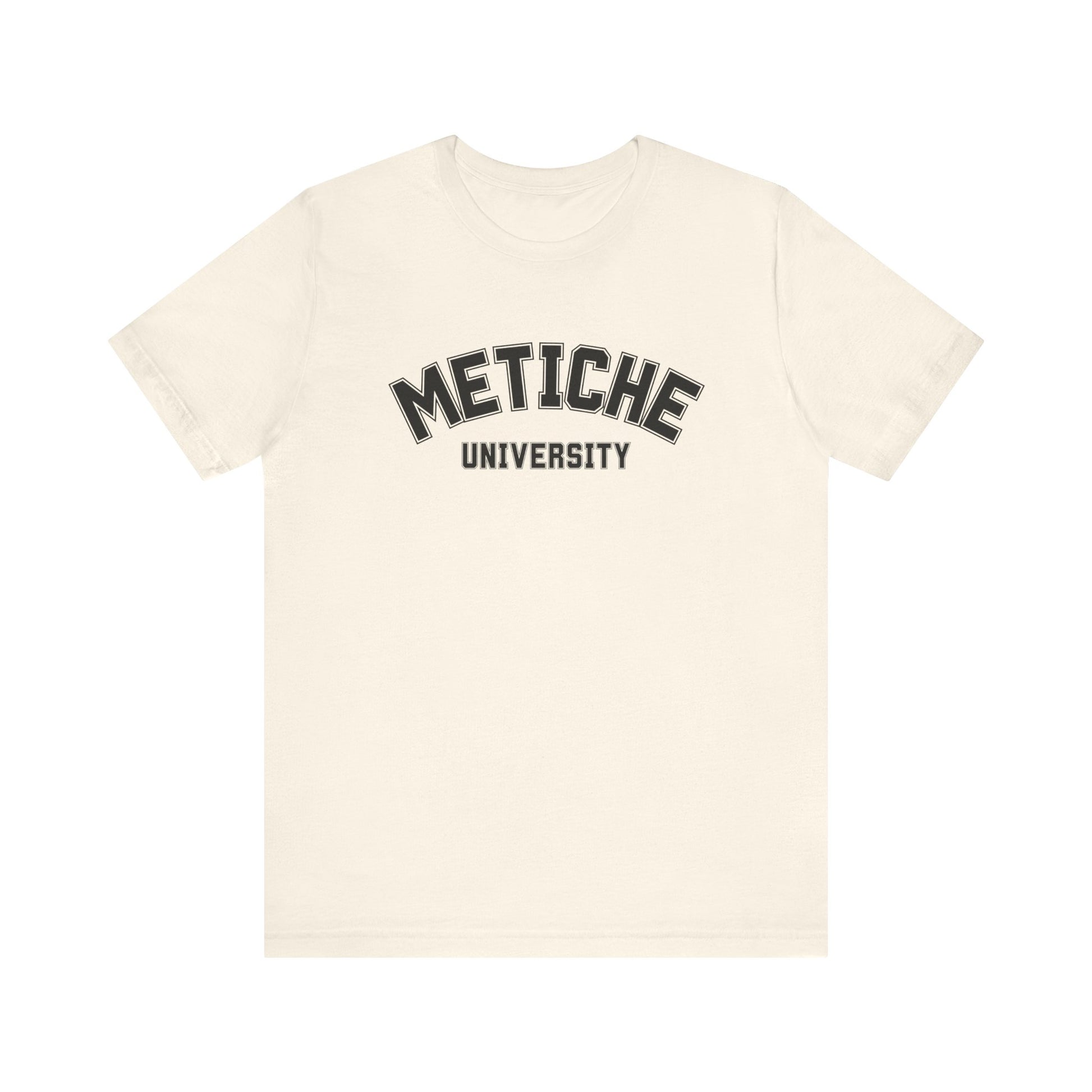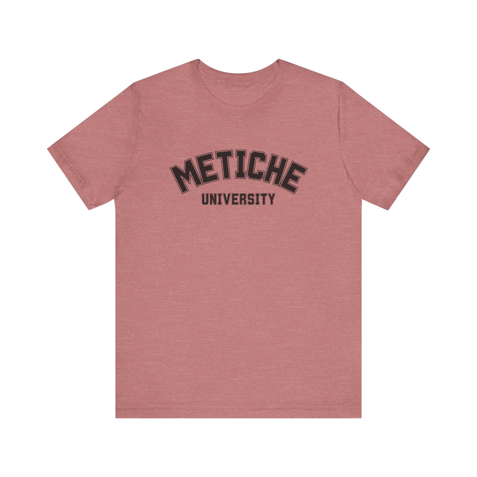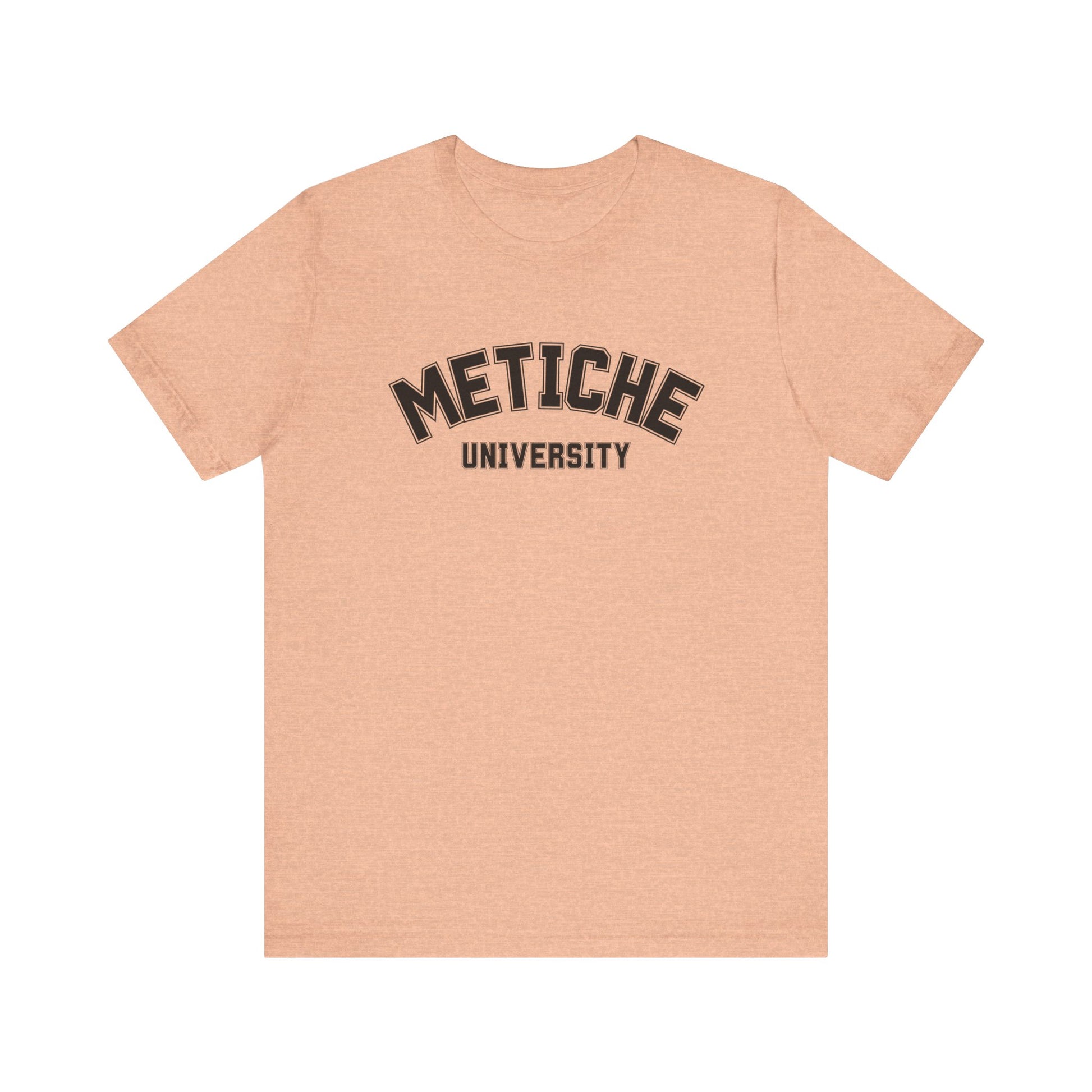 The bold typography and vibrant colors make the design pop, drawing attention to the shirt and its humorous message. The phrase "Metiche University" is proudly displayed, celebrating the curious and inquisitive individuals who love to gather information and explore the world around them.