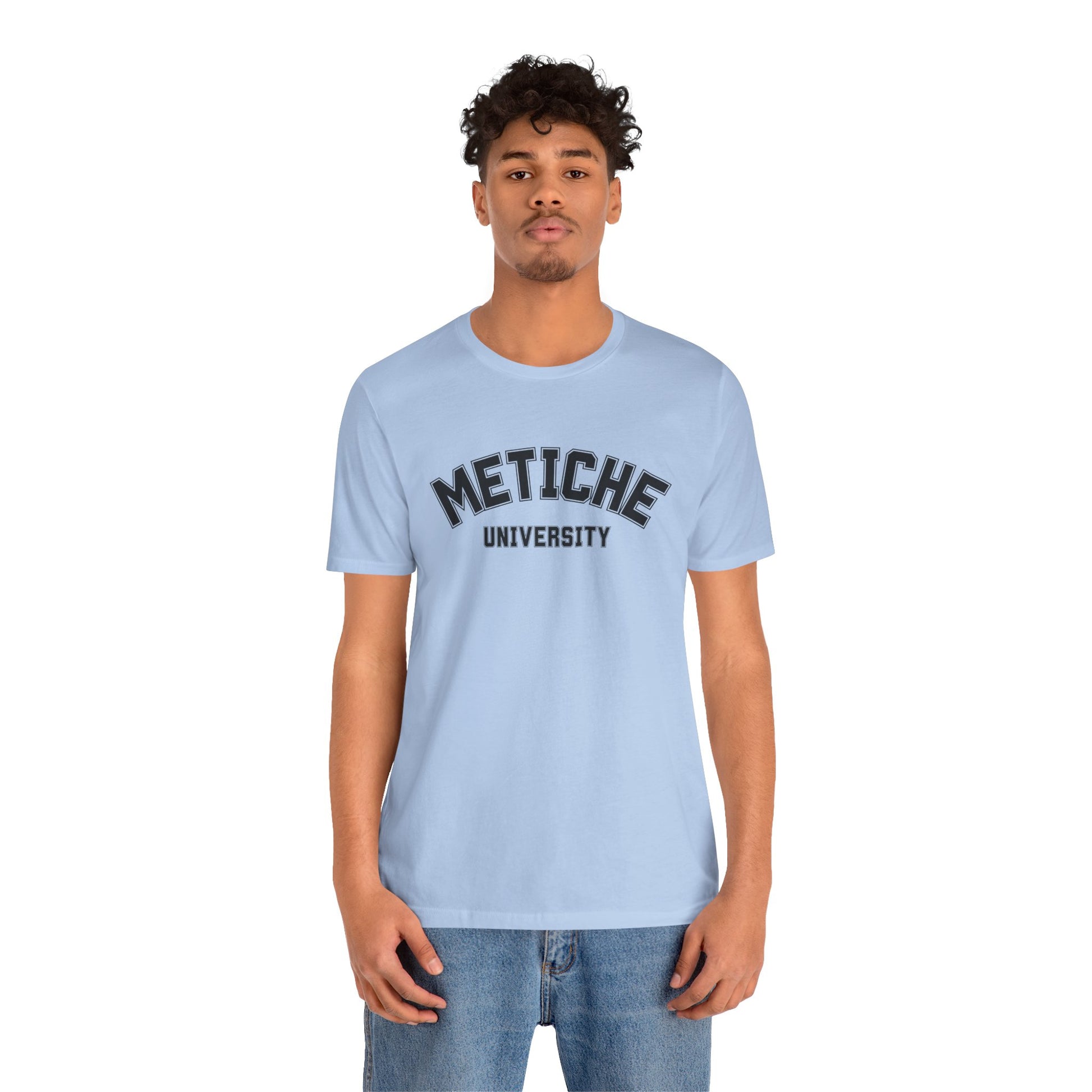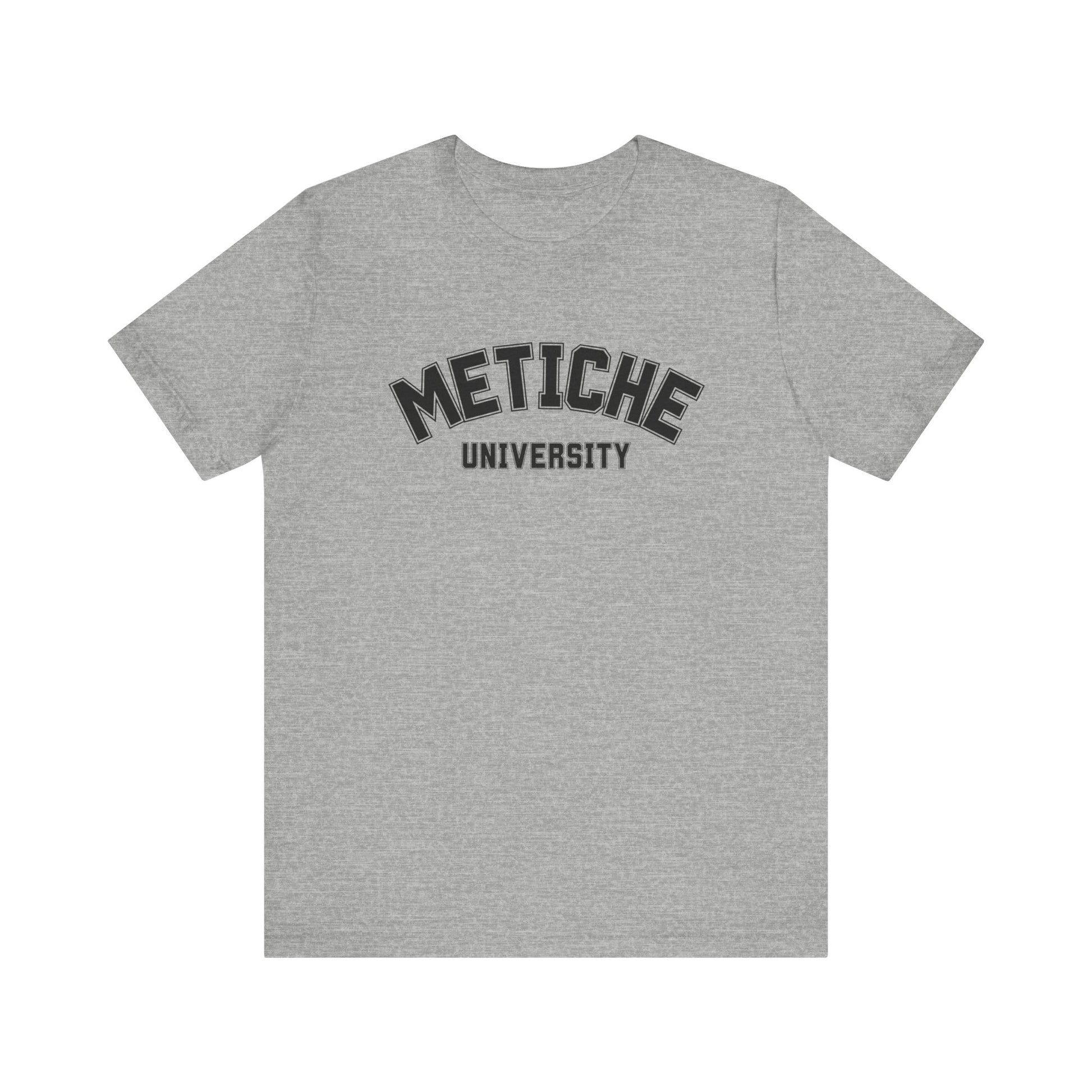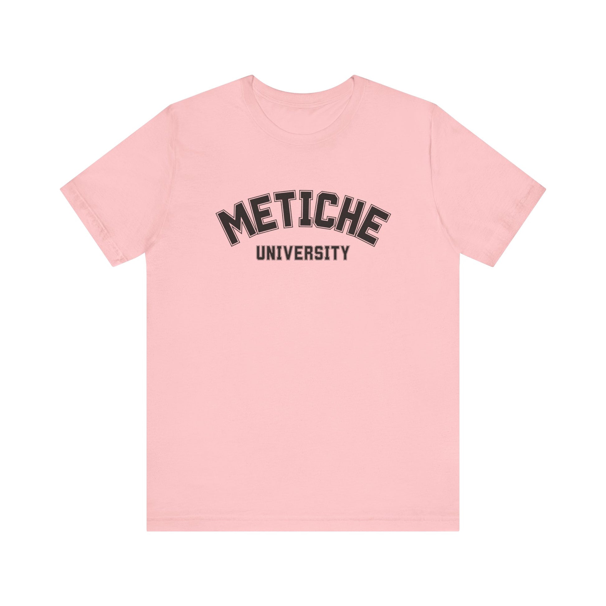The bold typography and vibrant colors make the design pop, drawing attention to the shirt and its humorous message. The phrase "Metiche University" is proudly displayed, celebrating the curious and inquisitive individuals who love to gather information and explore the world around them.
