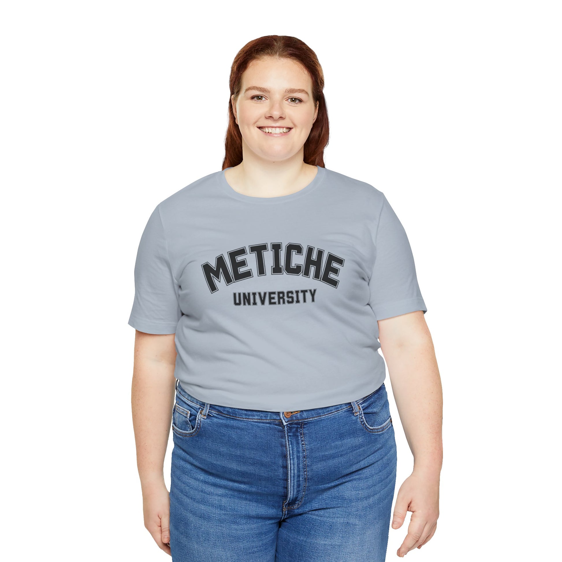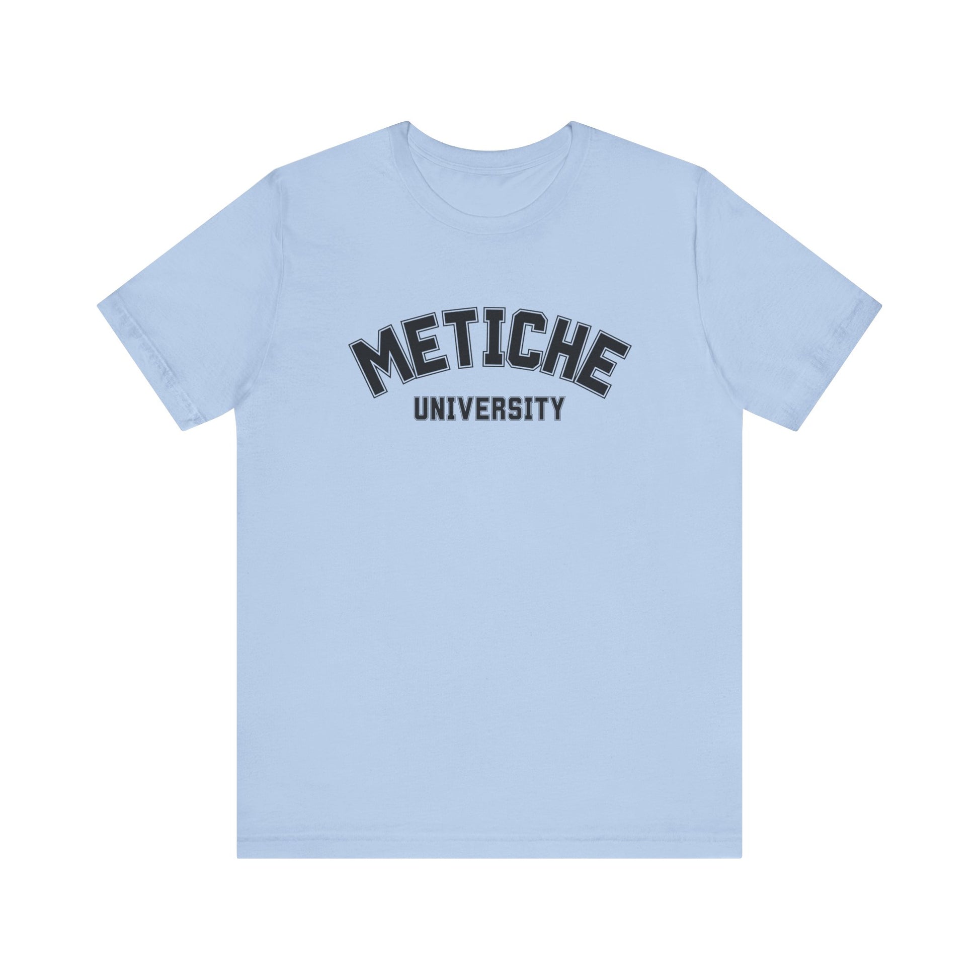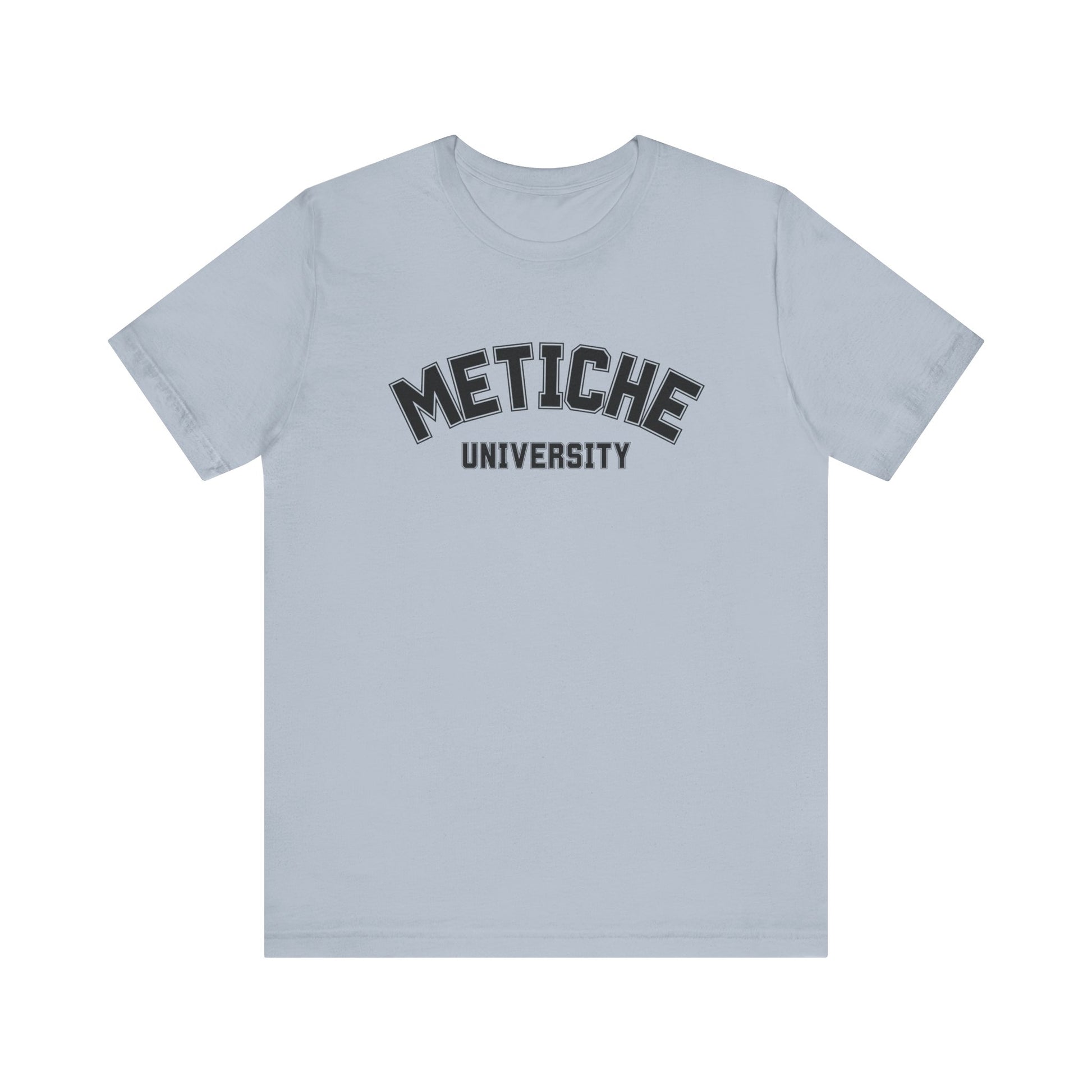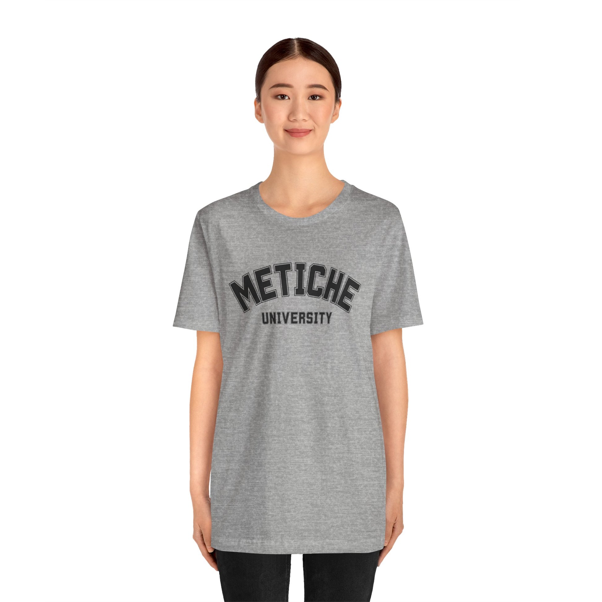 The bold typography and vibrant colors make the design pop, drawing attention to the shirt and its humorous message. The phrase "Metiche University" is proudly displayed, celebrating the curious and inquisitive individuals who love to gather information and explore the world around them.