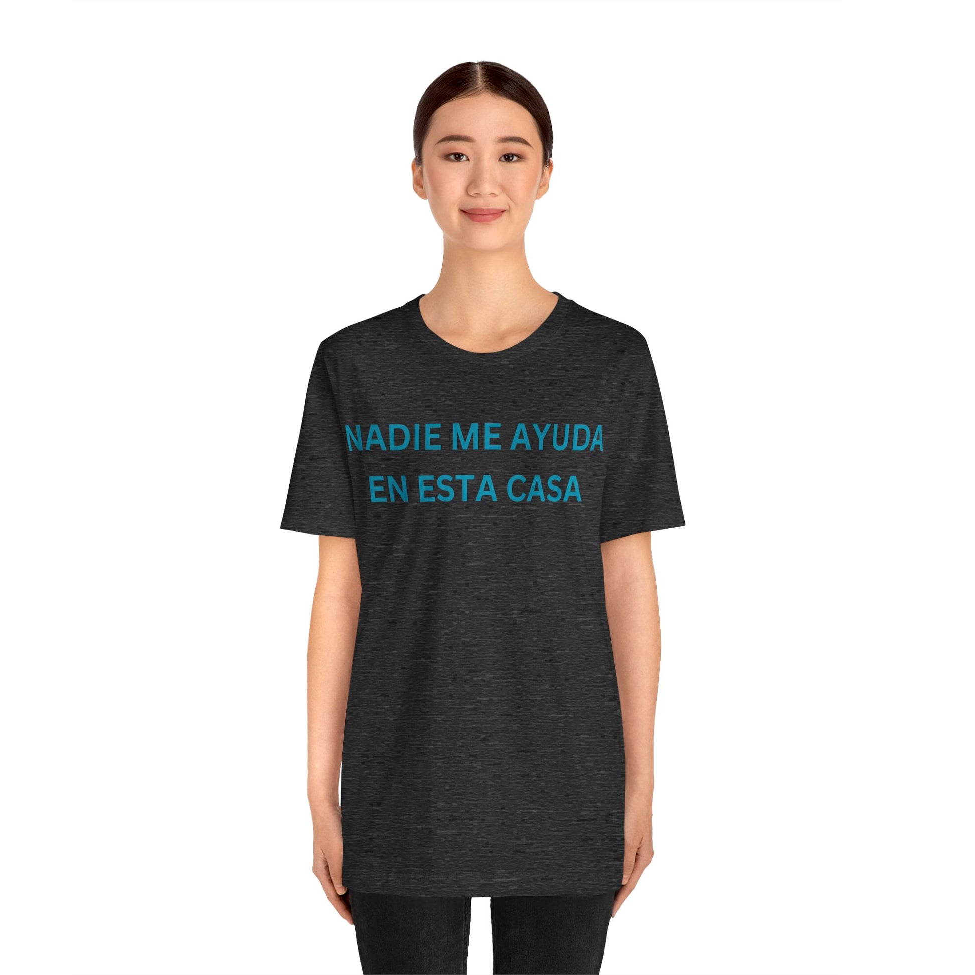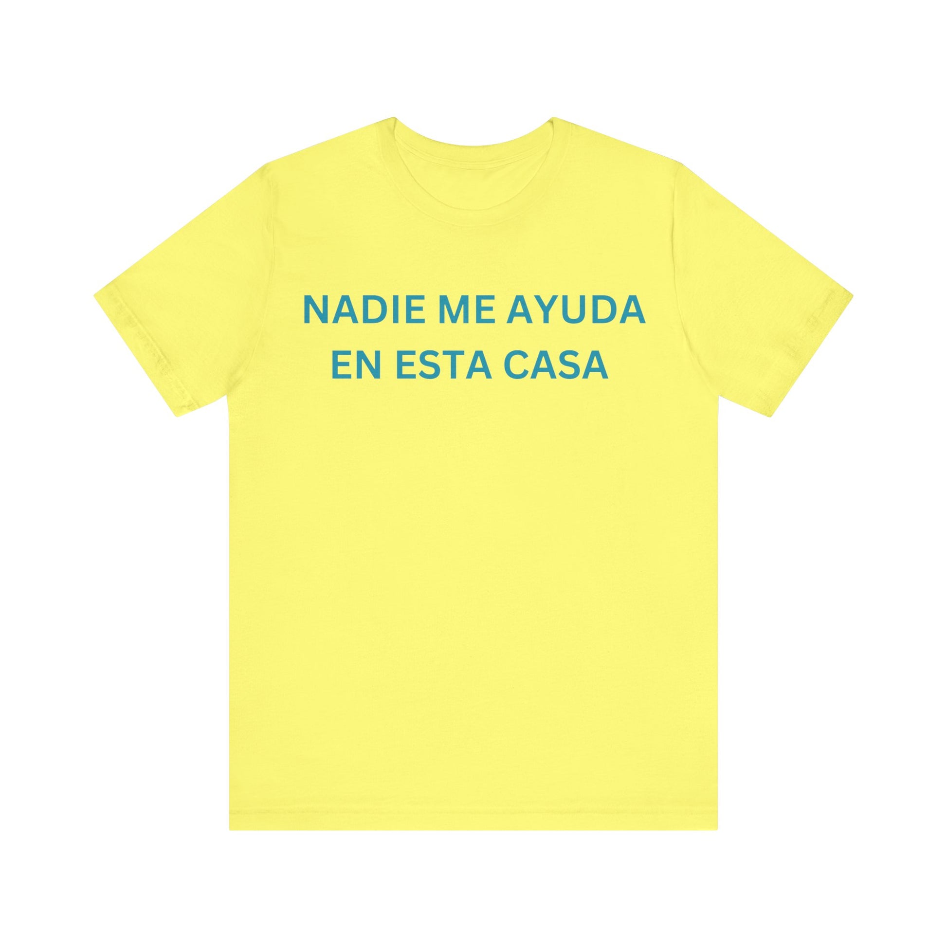 Crafted from premium quality, soft cotton fabric, this shirt offers both comfort and style. The vivid white background serves as a canvas for the striking black typography that boldly declares, "NADIE ME AYUDA EN ESTA CASA," which translates to "No one helps me in this house."