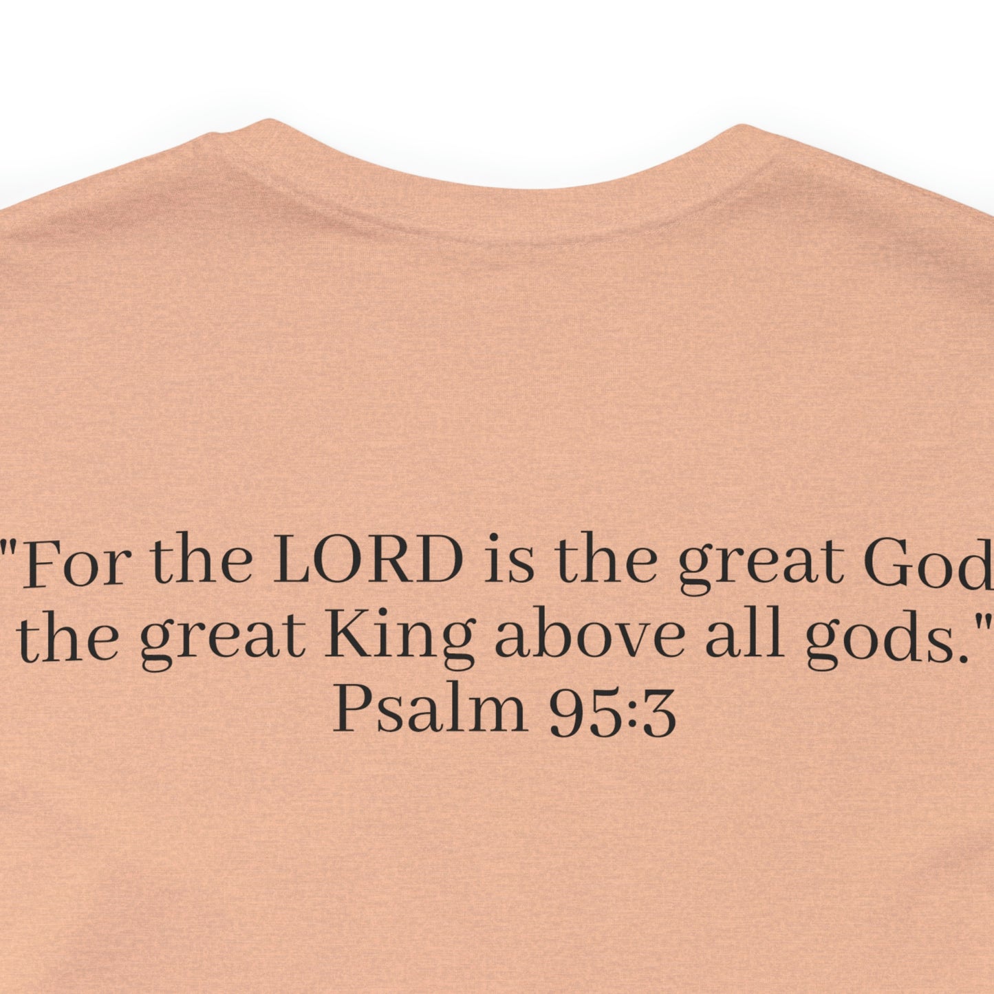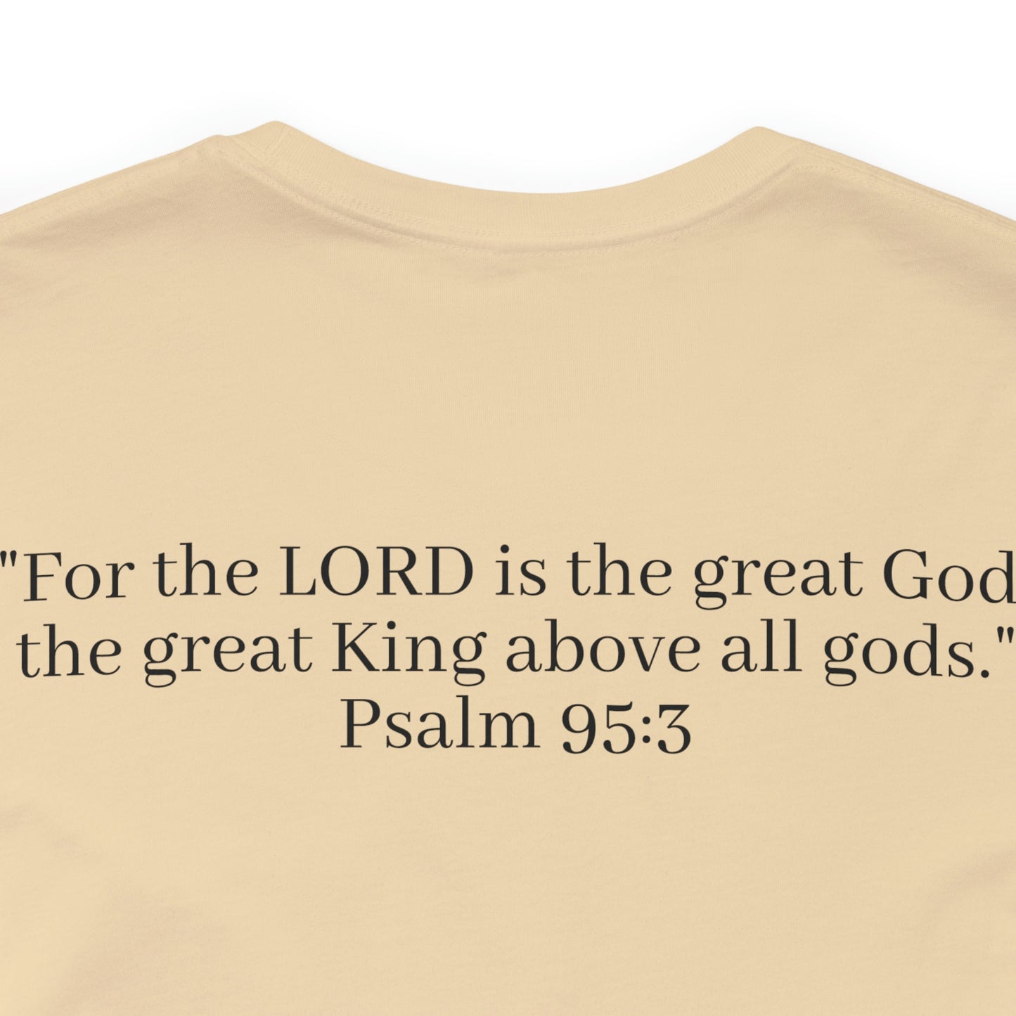 Emblazoned on the front of the shirt, the verse "For the LORD is the great God, the great King above all gods" from Psalm 95:3 takes center stage. This scripture serves as a joyful reminder that our God is not just any god, but the supreme ruler, the ultimate King whose greatness knows no bounds.