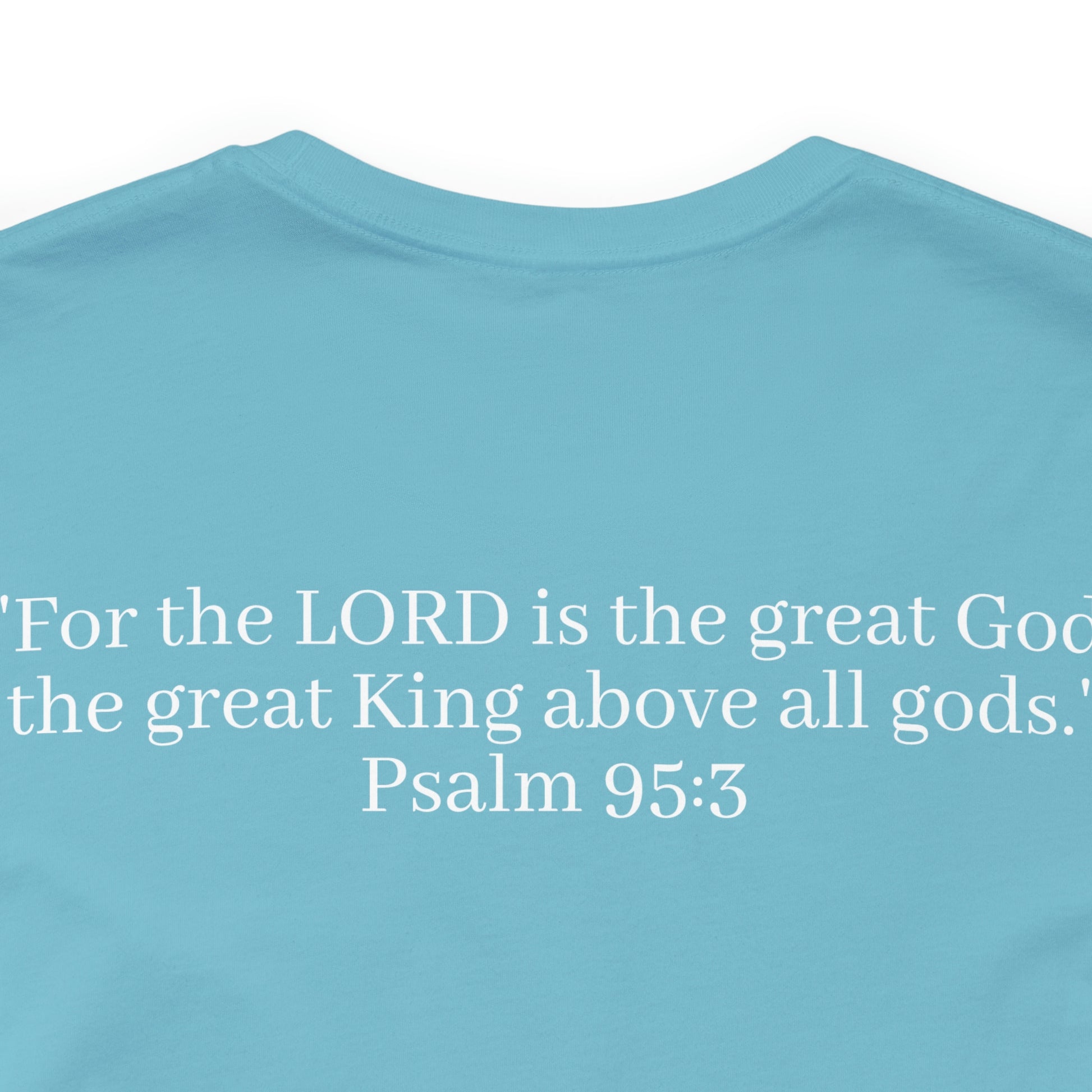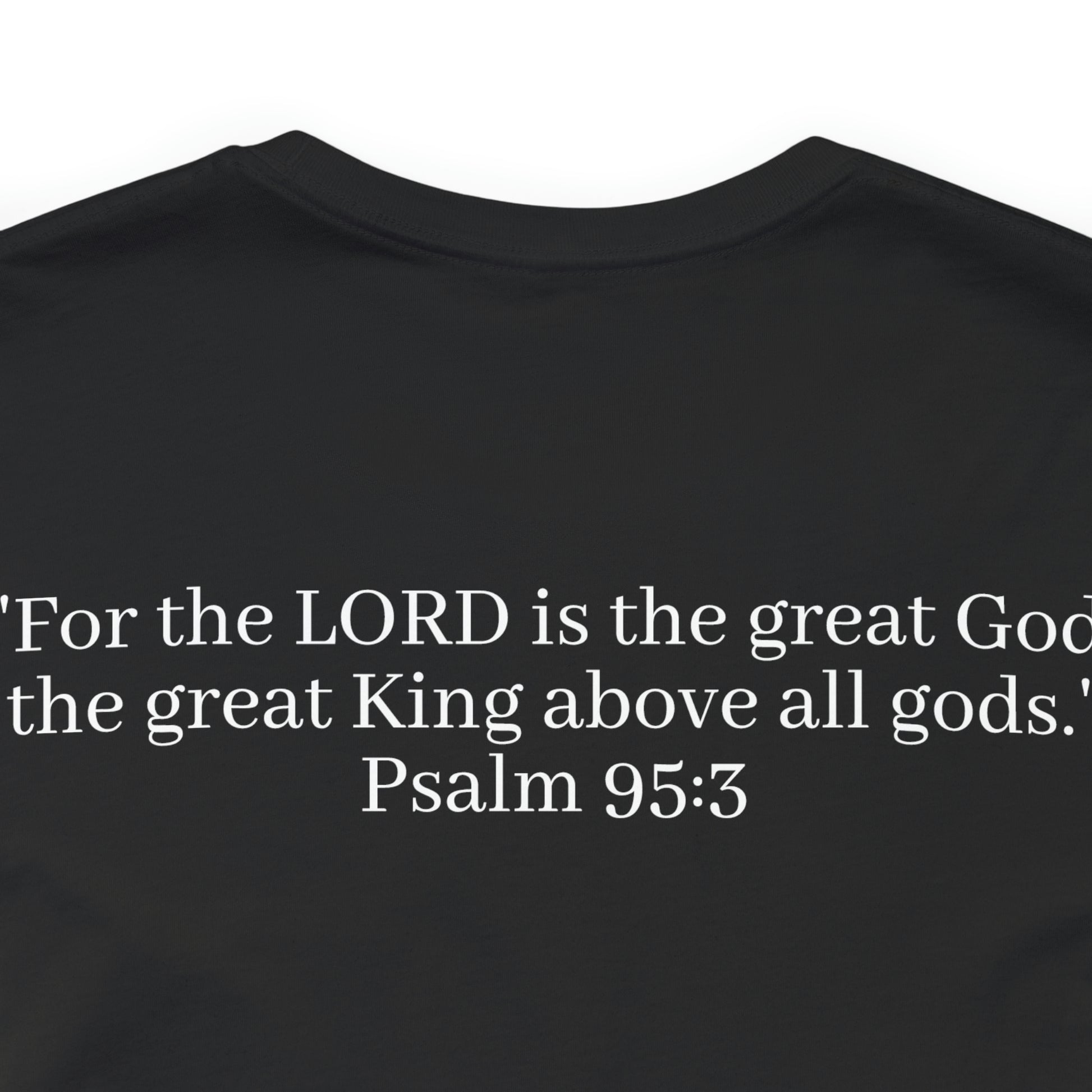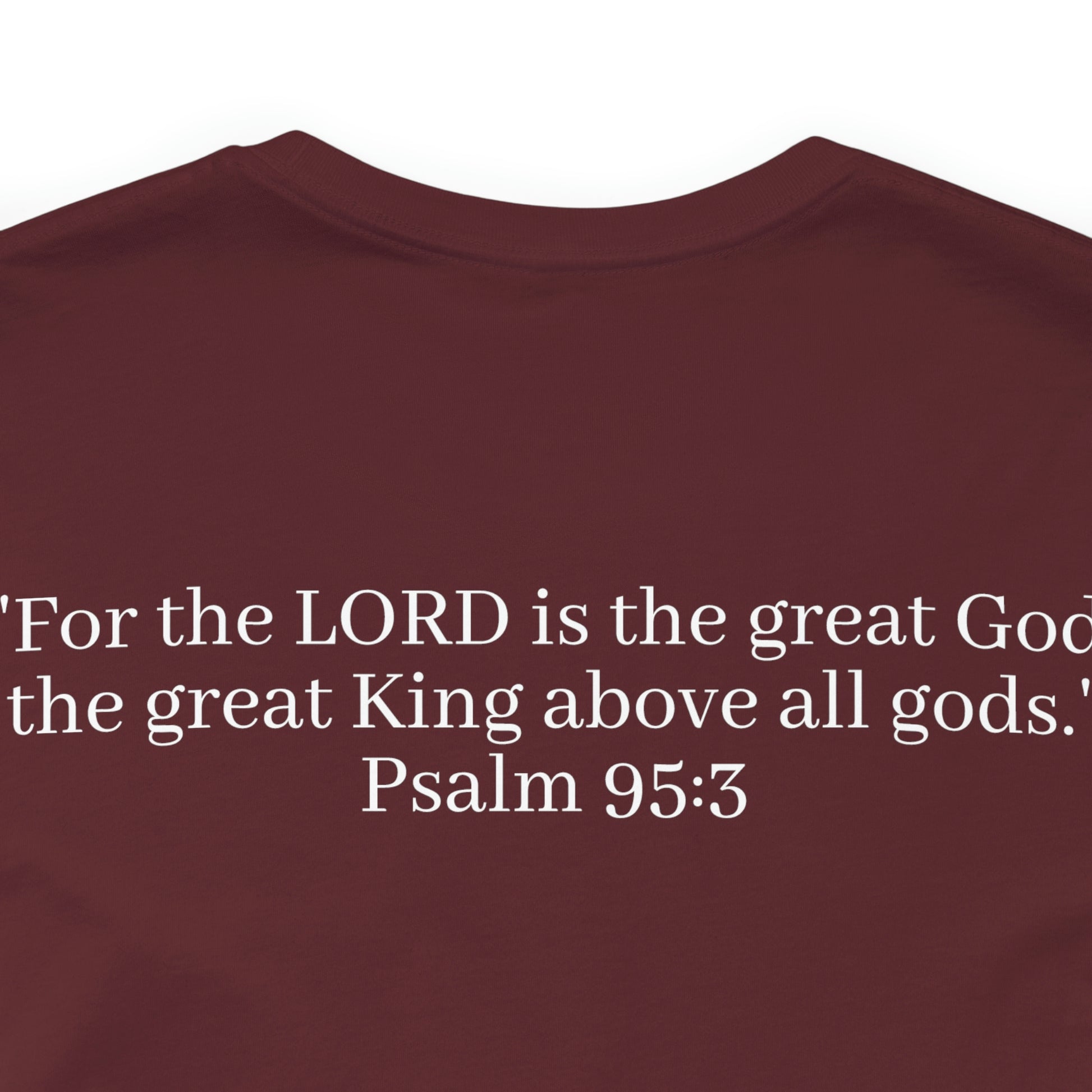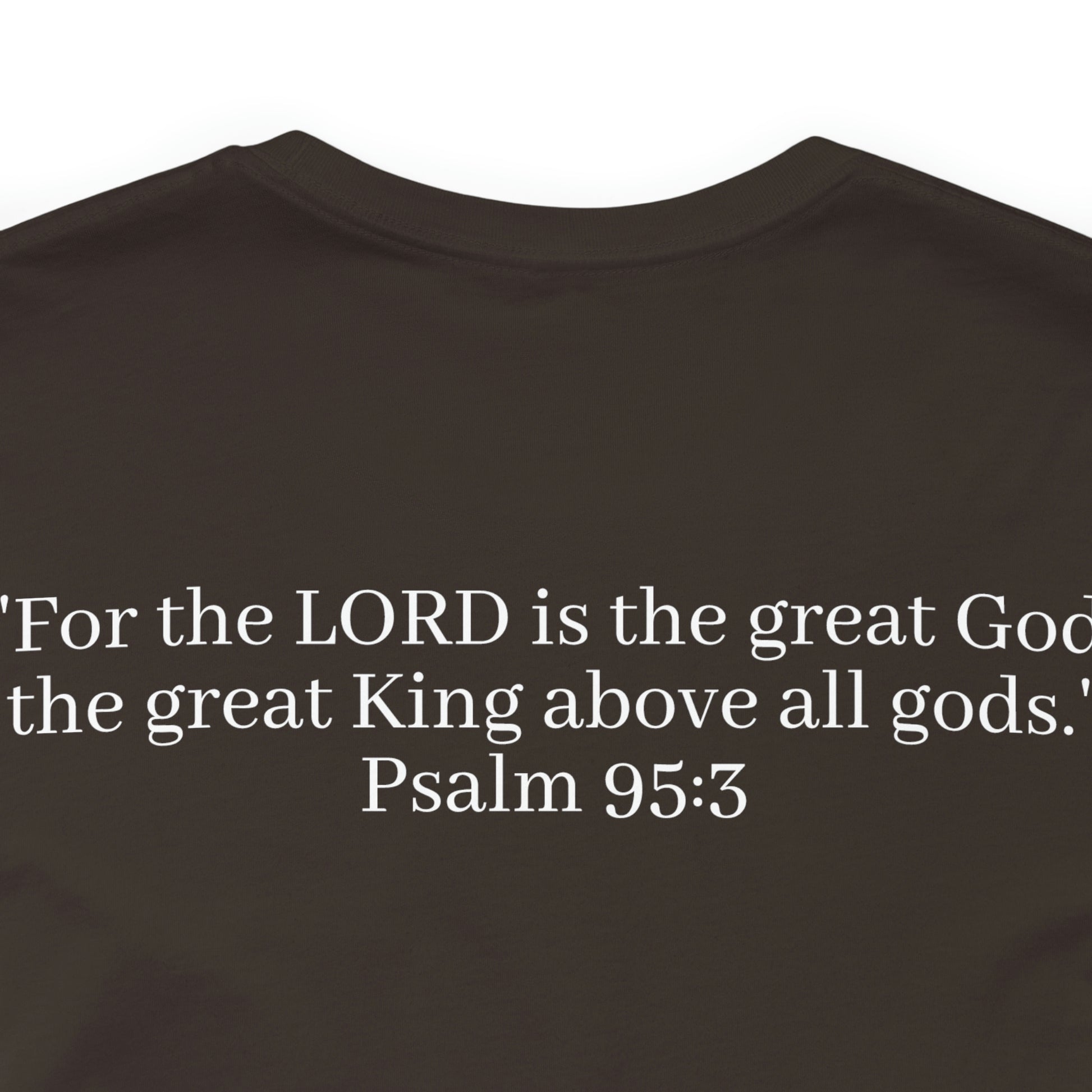 Emblazoned on the front of the shirt, the verse "For the LORD is the great God, the great King above all gods" from Psalm 95:3 takes center stage. This scripture serves as a joyful reminder that our God is not just any god, but the supreme ruler, the ultimate King whose greatness knows no bounds.