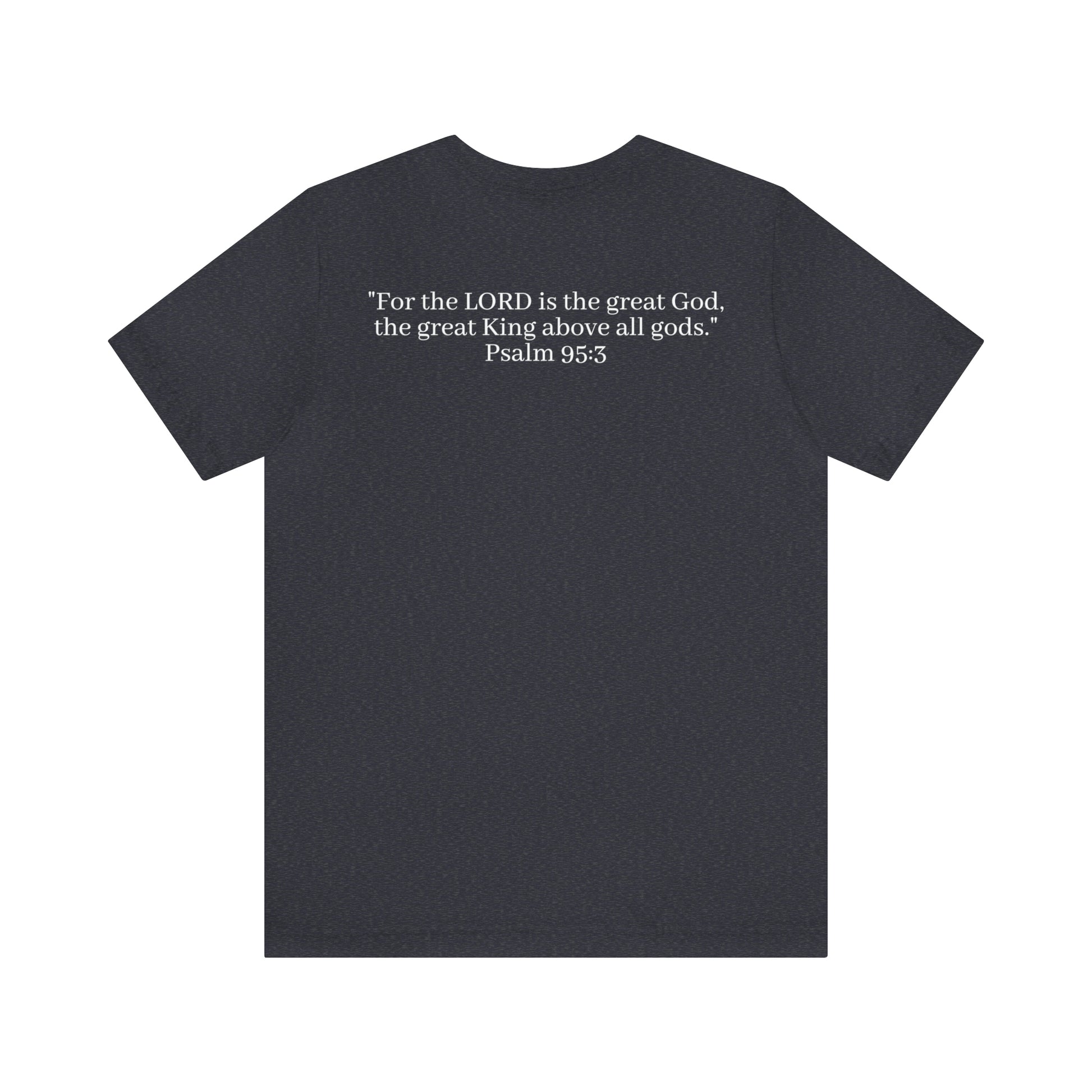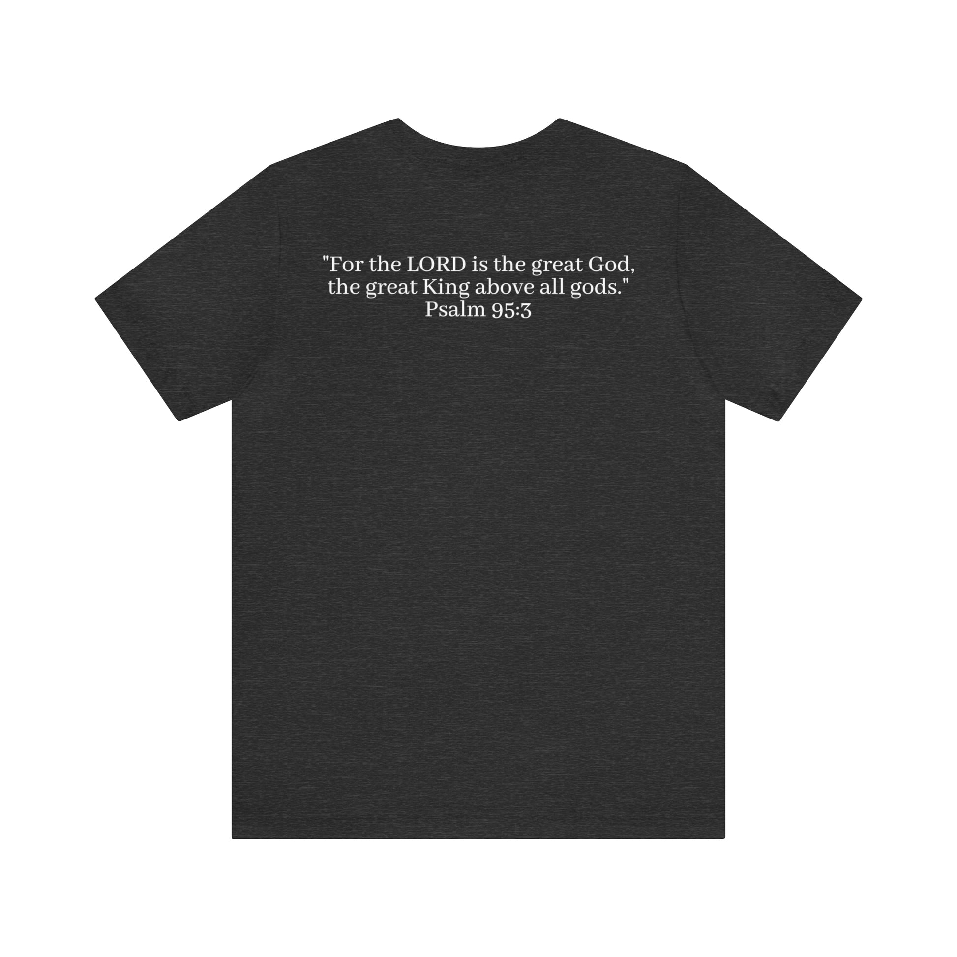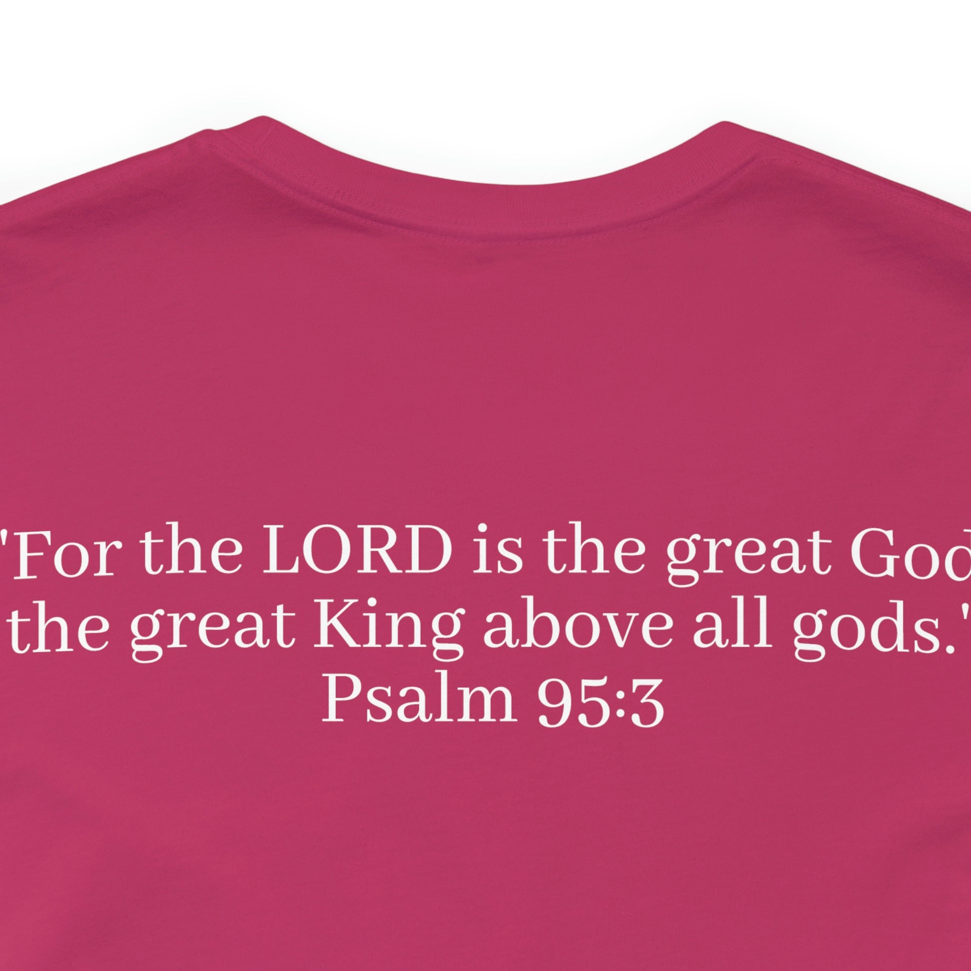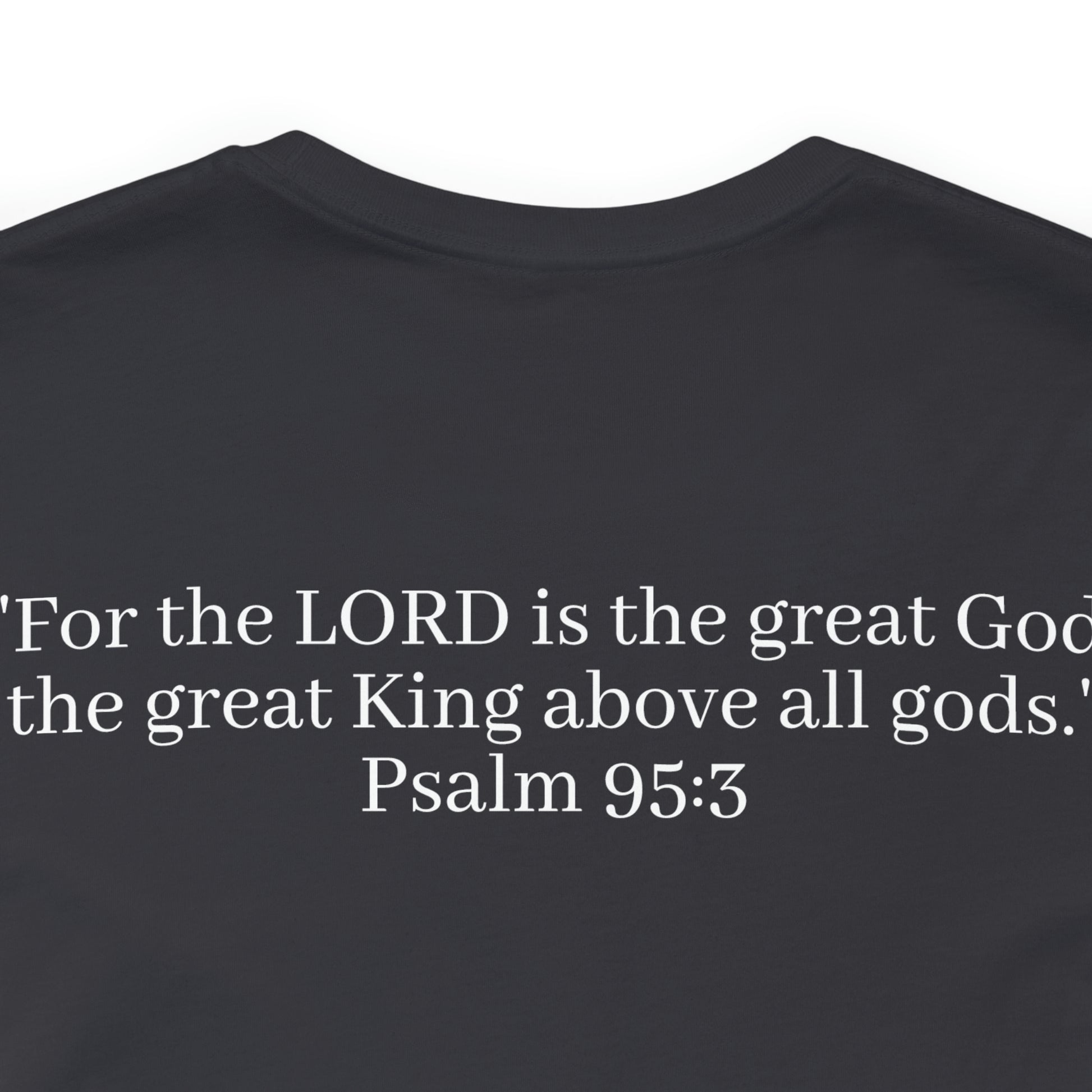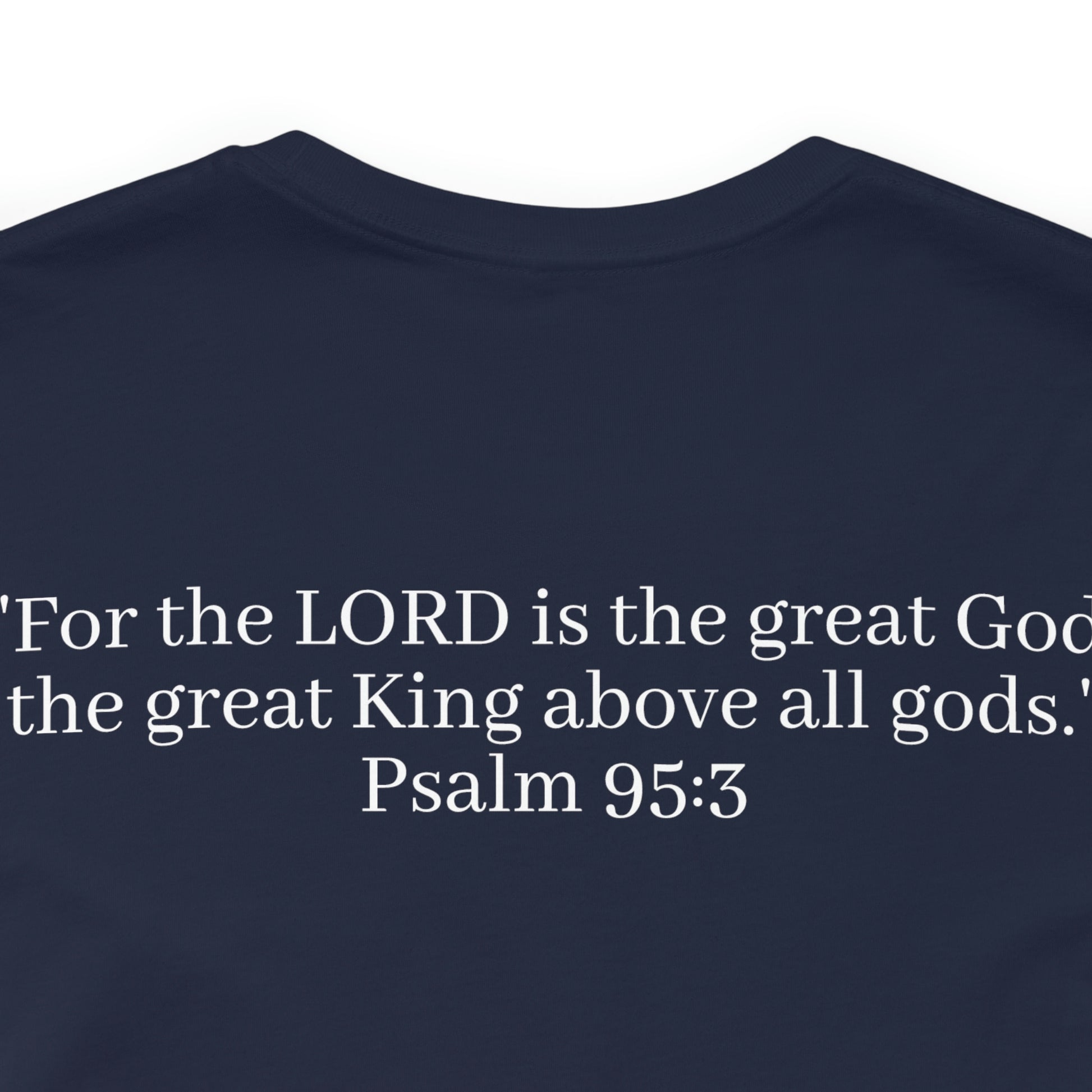 Emblazoned on the front of the shirt, the verse "For the LORD is the great God, the great King above all gods" from Psalm 95:3 takes center stage. This scripture serves as a joyful reminder that our God is not just any god, but the supreme ruler, the ultimate King whose greatness knows no bounds.