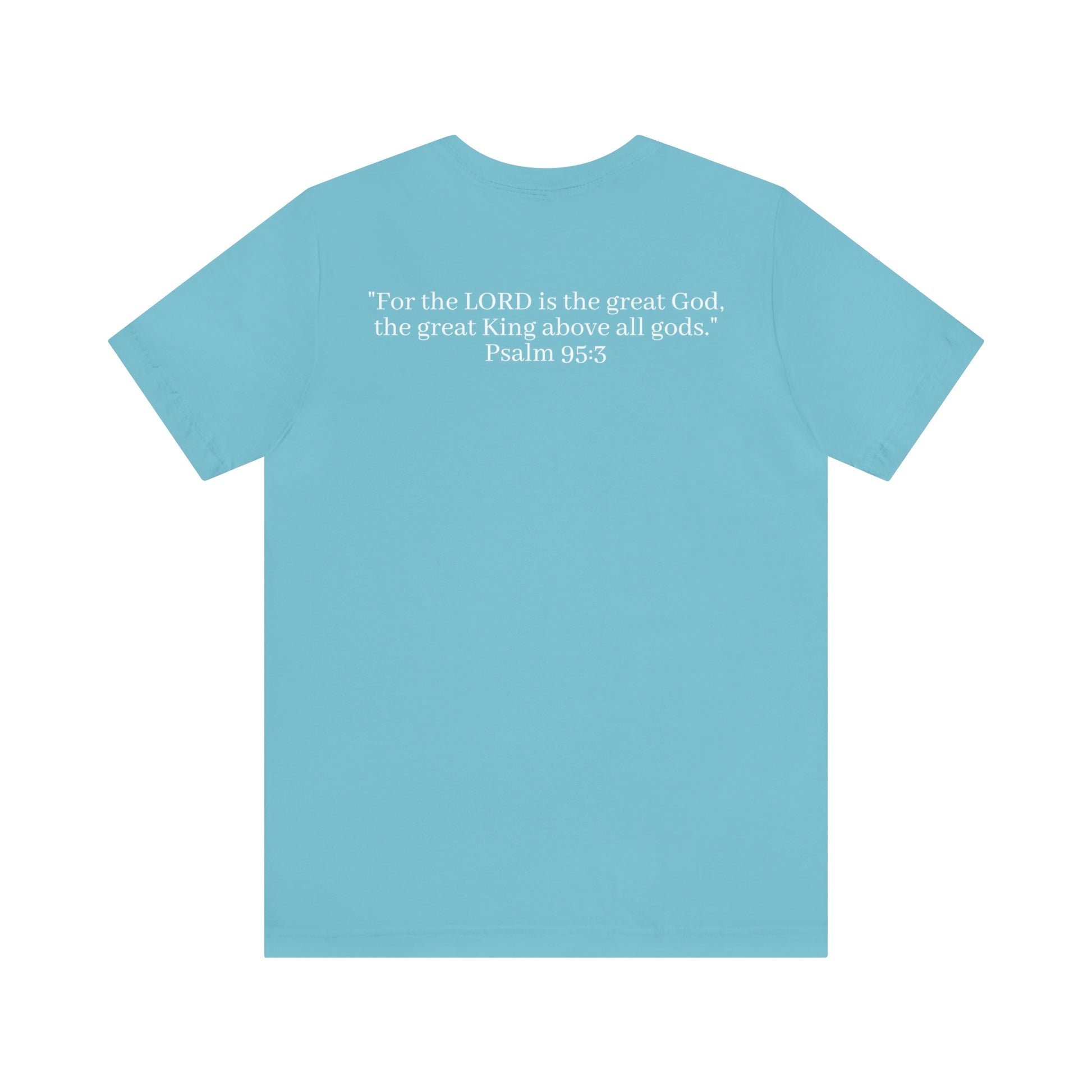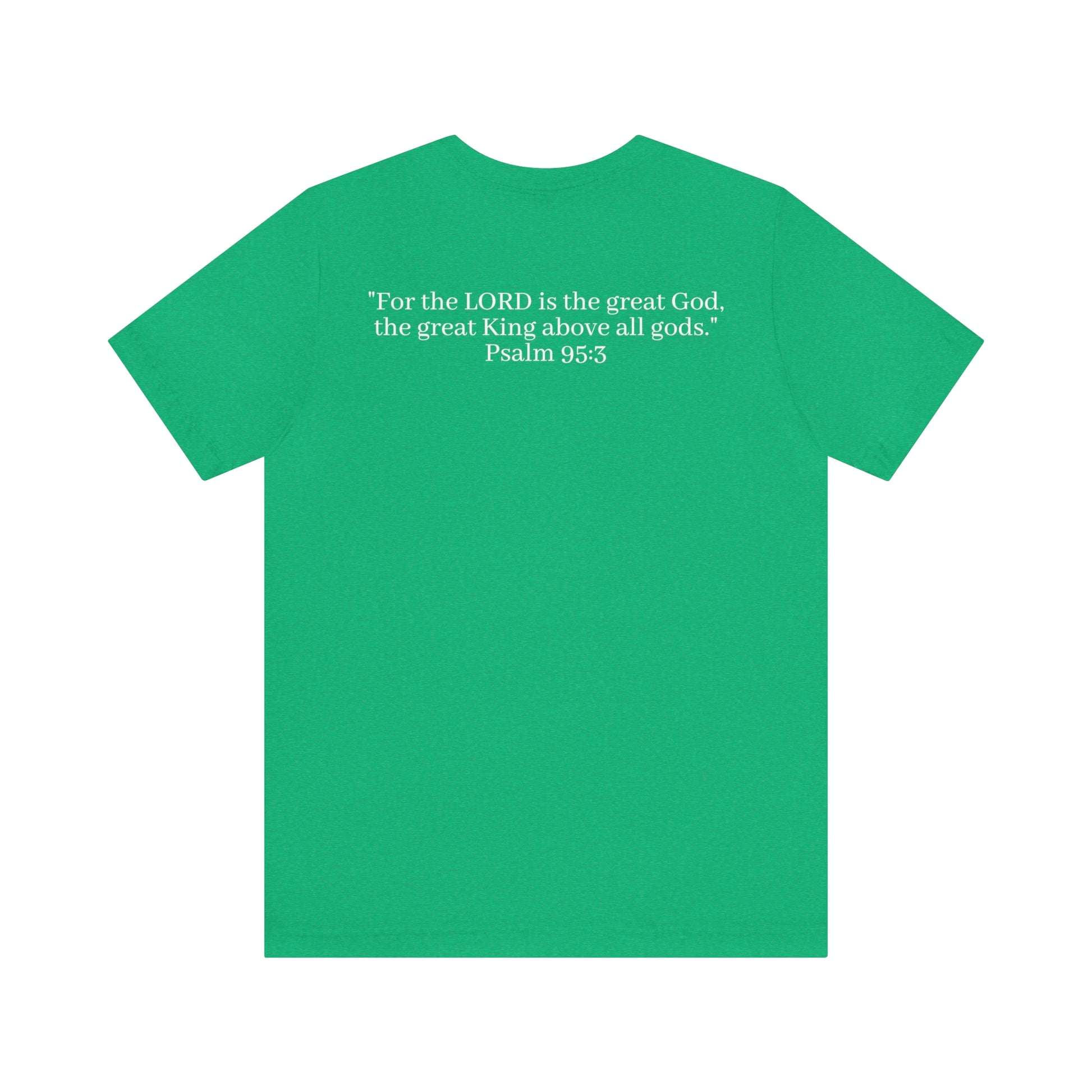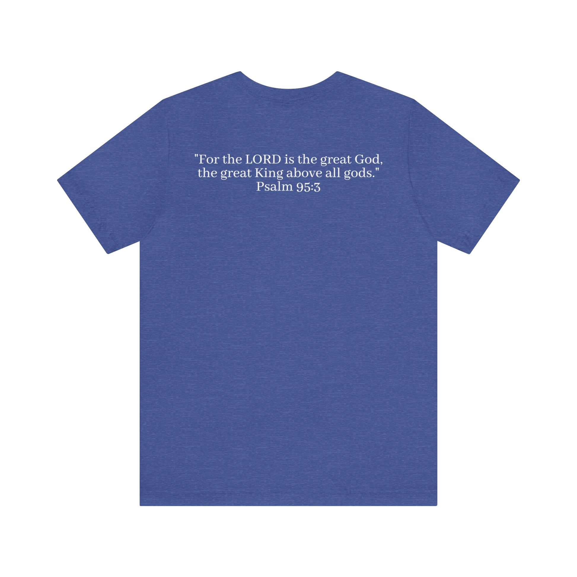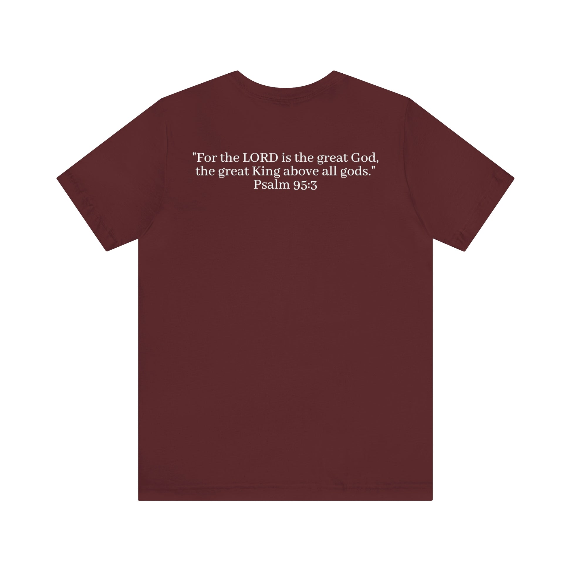 Emblazoned on the front of the shirt, the verse "For the LORD is the great God, the great King above all gods" from Psalm 95:3 takes center stage. This scripture serves as a joyful reminder that our God is not just any god, but the supreme ruler, the ultimate King whose greatness knows no bounds.
