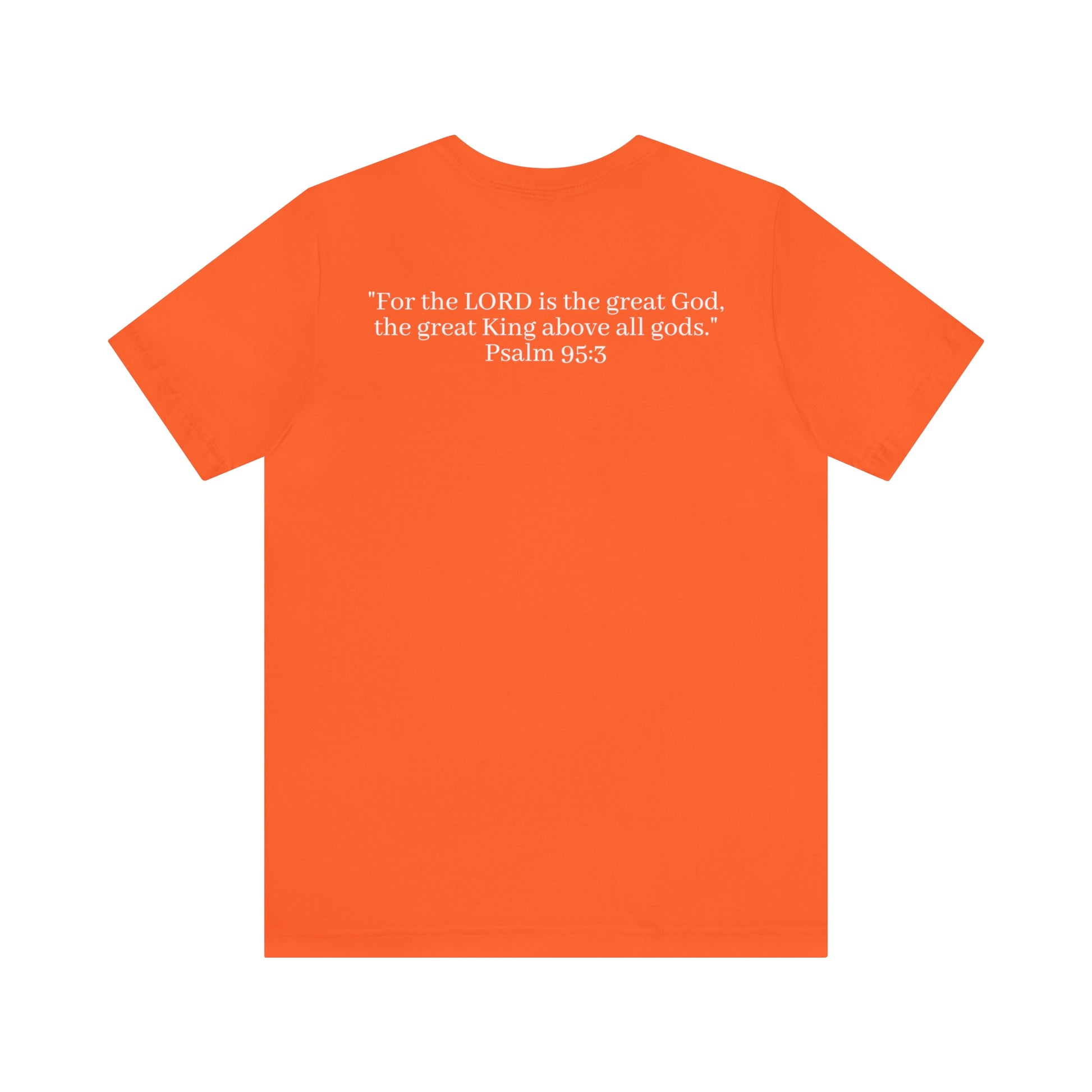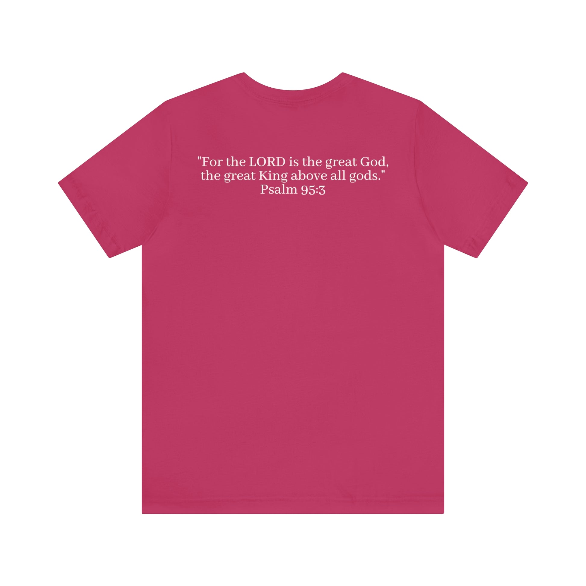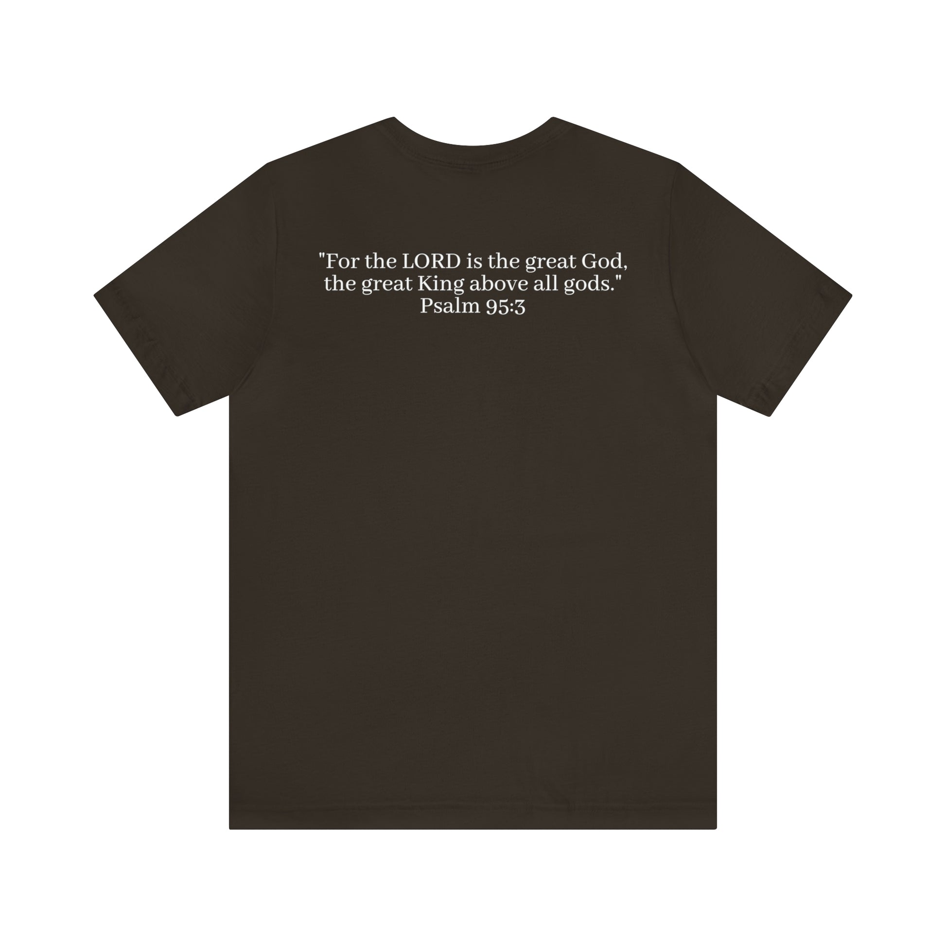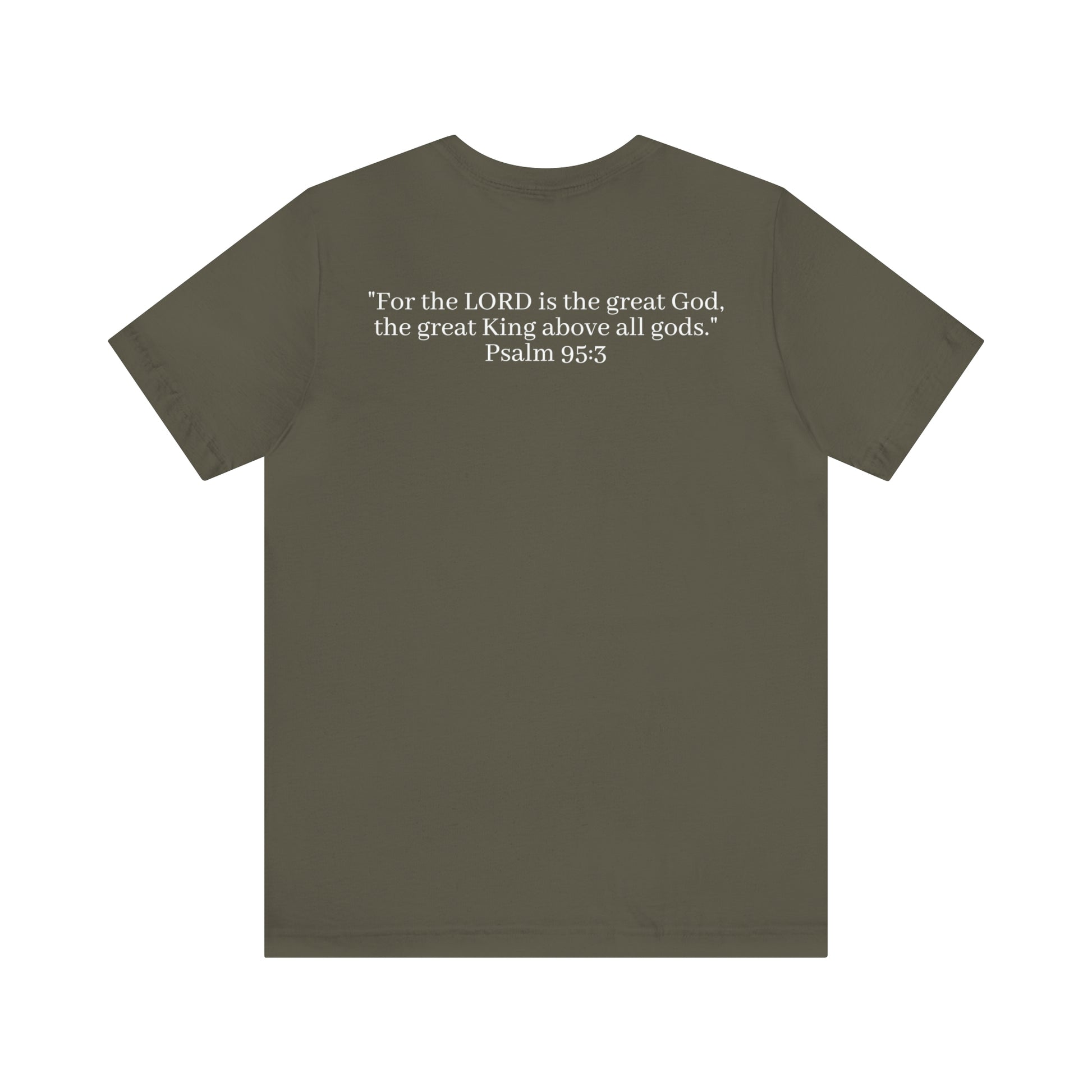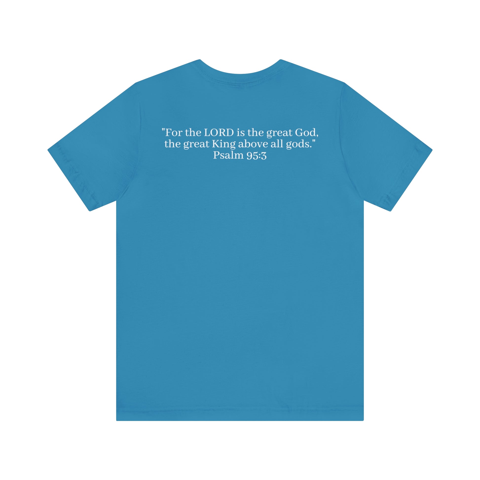 Emblazoned on the front of the shirt, the verse "For the LORD is the great God, the great King above all gods" from Psalm 95:3 takes center stage. This scripture serves as a joyful reminder that our God is not just any god, but the supreme ruler, the ultimate King whose greatness knows no bounds.