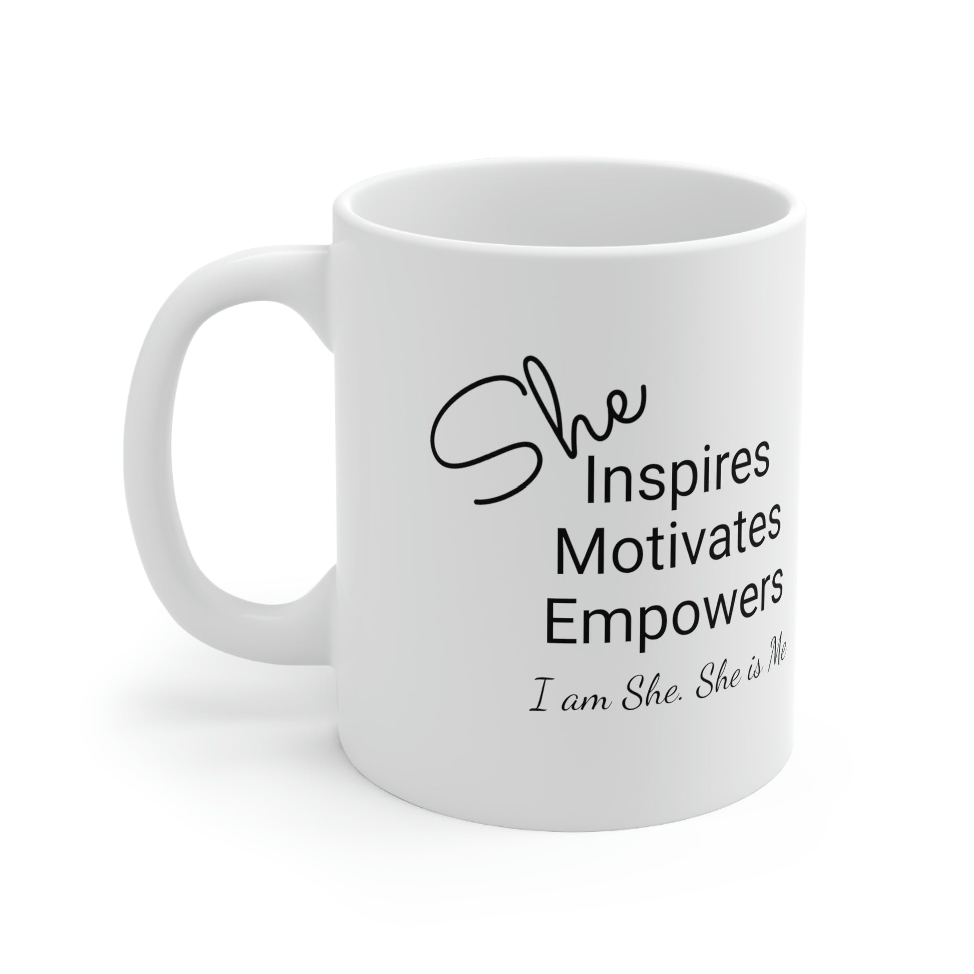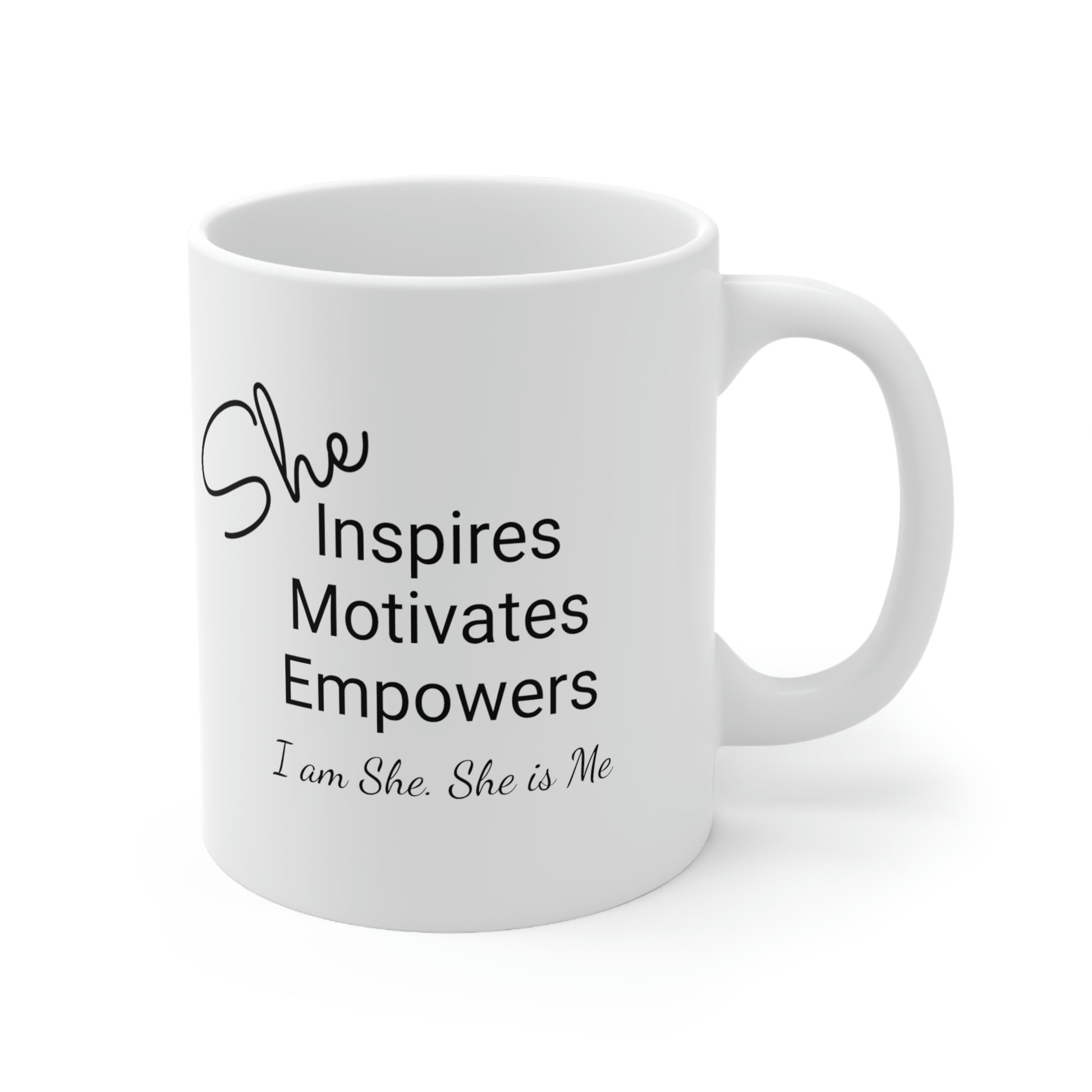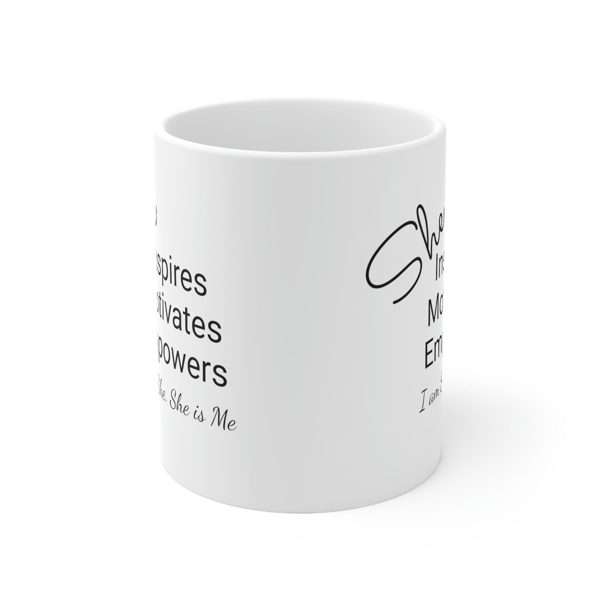 Celebrate the power of sisterhood with this inspiring mug. Featuring the empowering message, 'she inspires, motivates, empowers. I am she. she is me,' this ceramic companion is a celebration of the strength and support that women can provide each other. Whether you're sipping your morning coffee or sharing a cup of tea with a friend, this mug is sure to bring a smile to your face and a sense of camaraderie to your day.