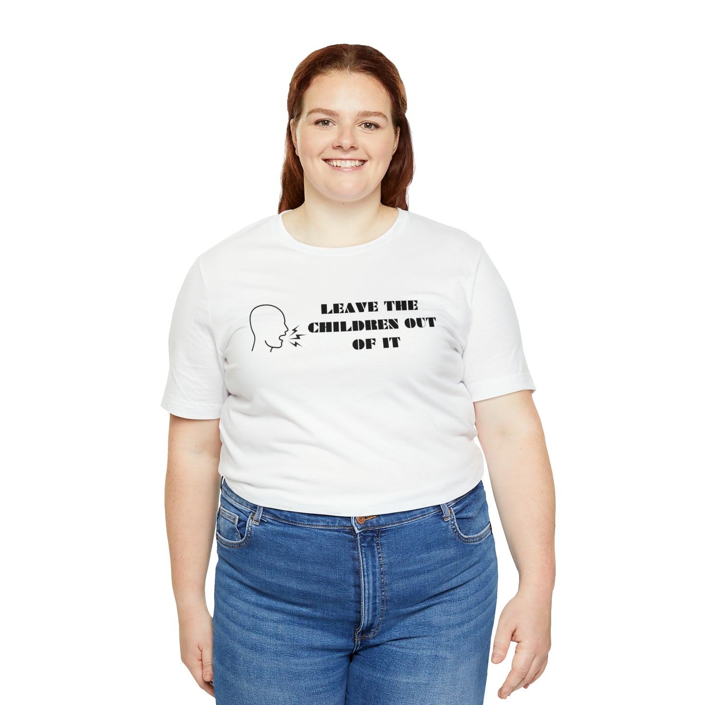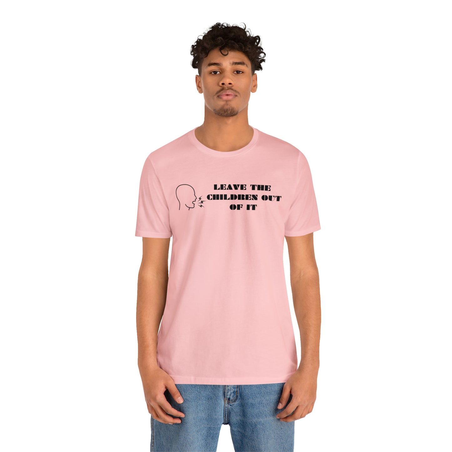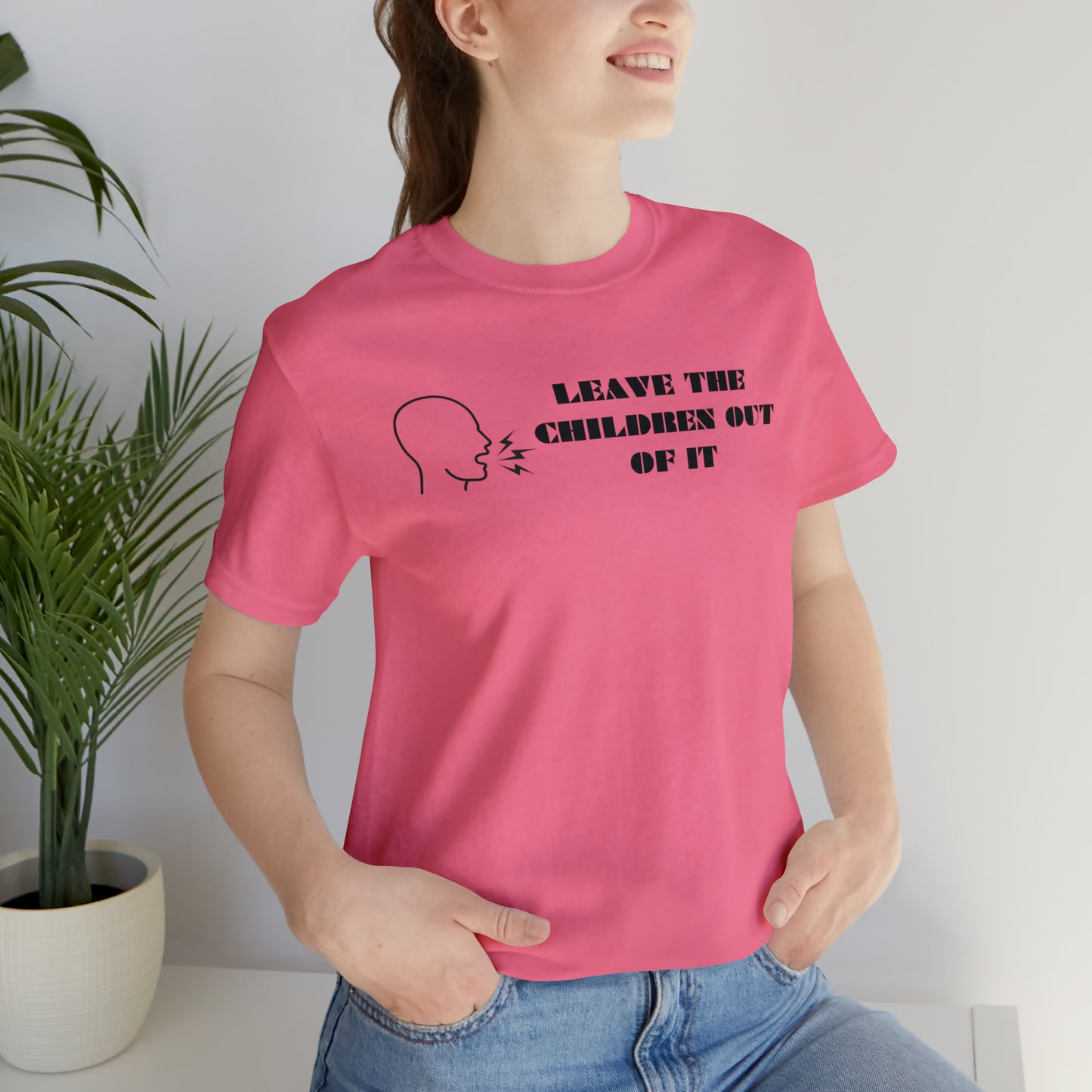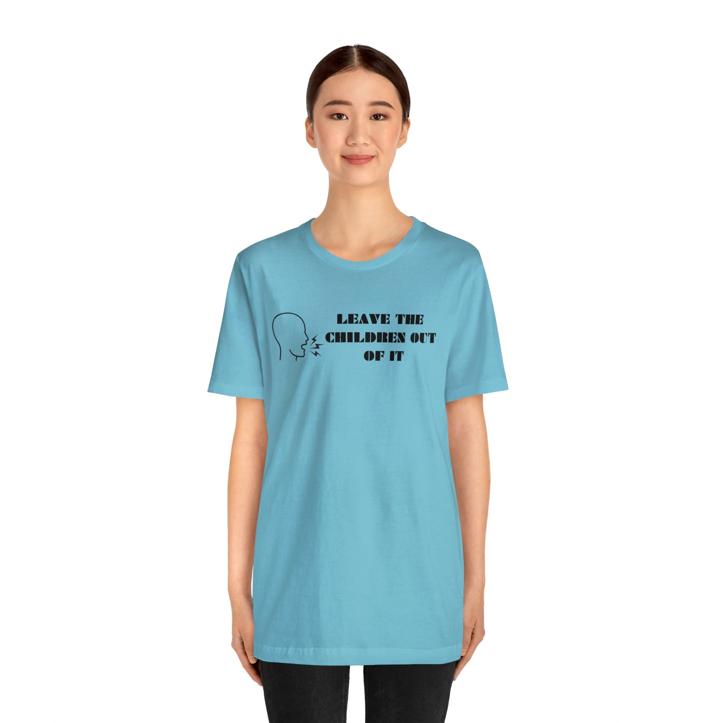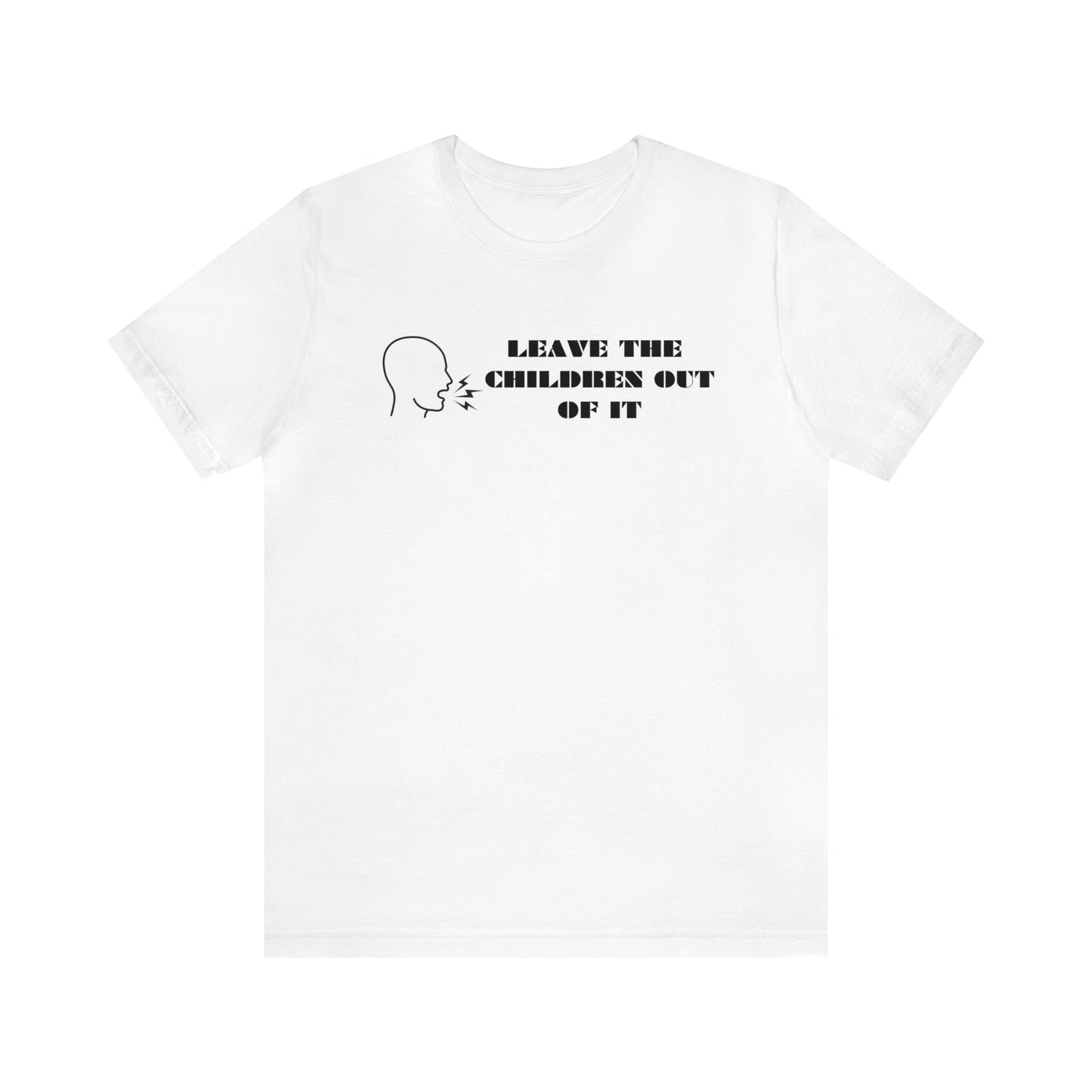 The design of the shirt features a clear and direct message: "Leave the Children Out of It." The words are prominently displayed, ensuring that the message is conveyed with clarity and impact. This design choice serves as a powerful reminder to adults, urging them to refrain from involving children in adult debates, arguments, or situations that may be emotionally or psychologically overwhelming for them.